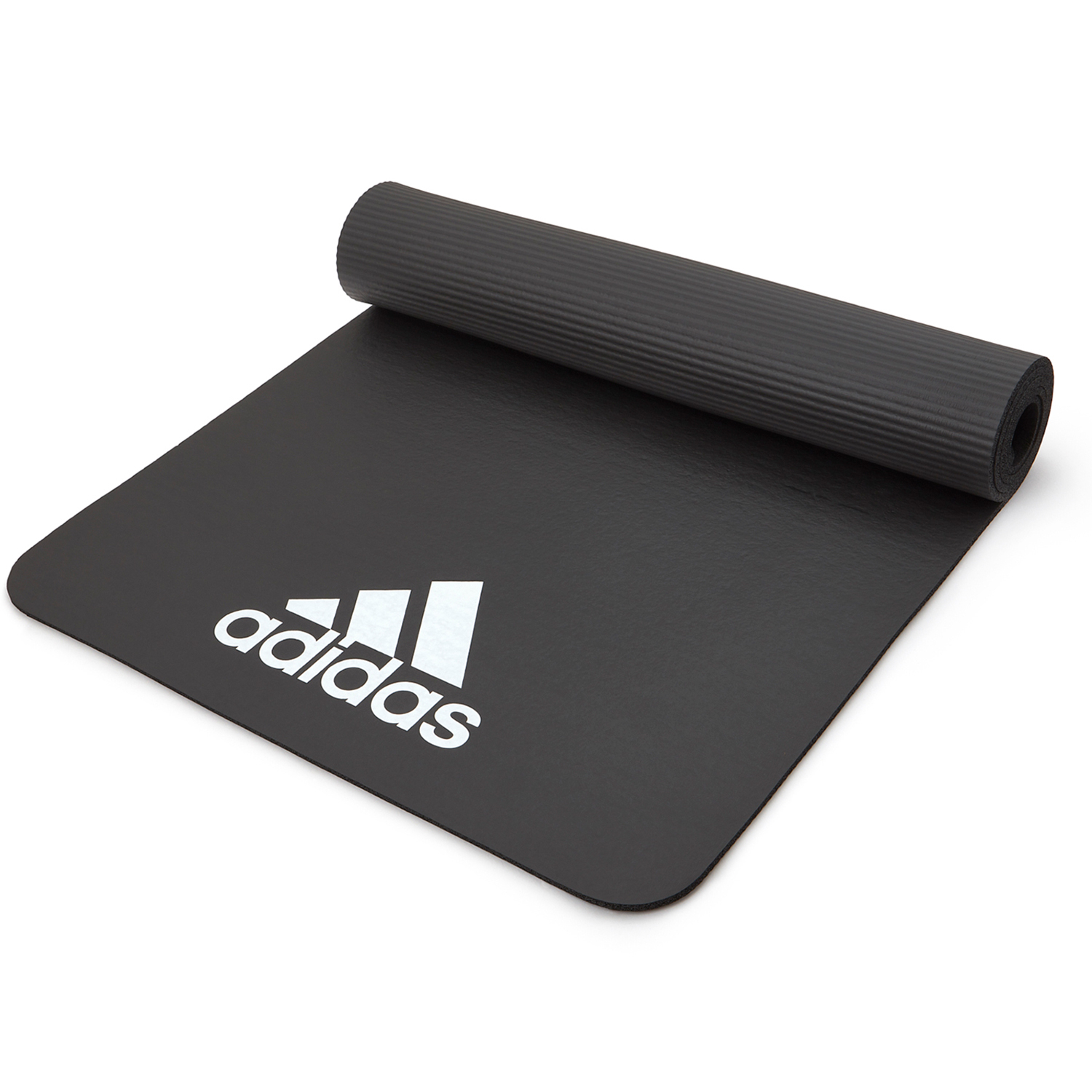 FitnessmatteGeeignet für Bodenübungen und allgemeines TrainingMaterial: Nitrilkautschuk (NBR)Größe: Länge 173 x Breite 61 x Dicke 0,7 cmRutschfeste Rillen auf der Unterseite der Matte Leicht sauber zu haltenRollbar für einfachen Transport und LagerungFarbe: grauGroßes weißes aufgedrucktes Adidas-LogoMarke: Adidas