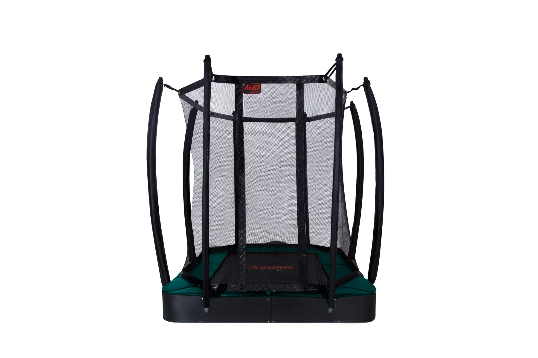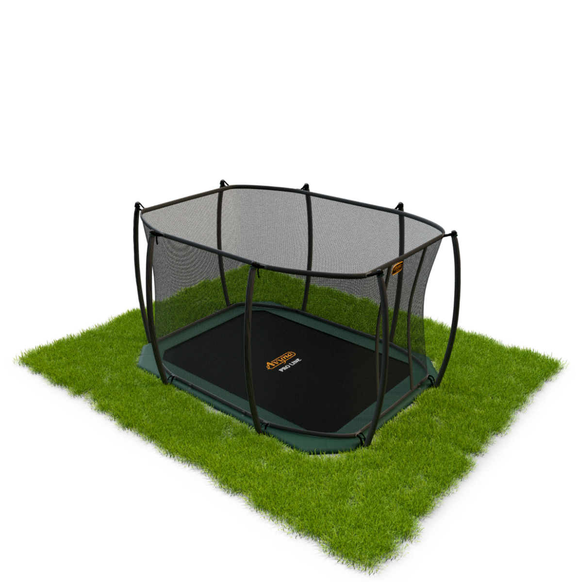 Avyna Pro-Line FlatLevel Trampolin mit Sicherheitsnetz - Kombiset 213 - 275 x 190 cm - Grün Dieses FlatLevel 213 ist das neueste Trampolin in unserem Sortiment. Unser Trampolin 213 mit einer Größe von 2,75 x 1,90 Metern ist seit Jahren ein Hit. Aus diesem Grund führen wir jetzt auch die FlatLevel-Version ein! Durch die kompakte Größe dieses Trampolins, die besten Materialien und das Air X-TREAM Sprungtuch ist dieses neu konzipierte Trampolin perfekt für jeden Garten. FlatLevel bedeutet, dass dieses Trampolin vollständig in den Boden eingegraben ist. Also kein Schritt. Dieses FlatLevel 213 Trampolin 275 x 190 cm ist mit einem Royal Class Sicherheitsnetz, einem soliden grünen Trampolinrand, doppelt verzinkten Federn und unserer neuesten Air X-TREAM Sprungmatte ausgestattet. Durch die offene Webstruktur hat diese Air X-TREAM Matte eine bis zu 70% bessere Luftdurchlässigkeit als normale Sprungmatten. Dadurch kann sich die Matte beim Sprung leicht bewegen und Sie können höher springen. Die Sprungmatte ist 100% UV-beständig. Außerdem hat dieses Sprungtuch eine zusätzliche 10 cm lange Klappe, um die Federn abzudecken, denn Sicherheit geht vor. Der Rand des Trampolins deckt auch die Federn ab und bleibt bei jedem Sprung sauber an seinem Platz. Das hochwertige und strapazierfähige Material dieses Trampolins garantiert Ihnen jahrelangen Springspaß! Die Verwendung eines Sicherheitsnetzes um dieses Flat Level Trampolin ist nicht zwingend erforderlich, solange um das Trampolin herum ein weicher Boden von mindestens 1 Meter vorhanden ist. Sind Sie auf der Suche nach diesem Modell ohne Sicherheitsnetz? FlatLevel-Trampoline (komplett ebenerdig) und InGround (20 cm über dem Boden) werden immer beliebter. Der Rahmen dieser Trampoline ist in den Boden eingelassen. Das sorgt für ein dichtes Erscheinungsbild, denn das Trampolin wird mit dem Garten eins. Außerdem sind diese Trampoline durch die niedrige Ein- und Ausstiegshöhe sehr sicher. Bevorzugen Sie ein Trampolin auf Beinen? Alle unsere Avyna Pro-Line-Trampoline werden in unserer eigenen Fabrik in Vietnam entwickelt und hergestellt. Mit einem Avyna Pro-Line Trampolin erhalten Sie Qualität, Sicherheit und Langlebigkeit im Haus. Dank der schweren Qualitätsmaterialien haben unsere Trampoline eine extrem lange Lebensdauer. Darauf sind wir natürlich stolz. Aus diesem Grund bieten wir, im Gegensatz zu anderen Trampolinmarken, eine lebenslange Garantie auf den Rahmen des Trampolins. Außerdem sind unsere Trampoline hervorragend verarbeitet und wir achten sehr auf die kleinen Details, wie zum Beispiel die Nähte. All dies zusammen sorgt dafür, dass die Avyna Pro-Line Trampoline zum oberen Segment gehören. Selbstverständlich entspricht unser Angebot an Trampolinen den neuesten Sicherheitsanforderungen. Alle unsere Trampoline haben ein CE-Zeichen, sind EN 7114 geprüft und haben eine EN 1176-Zertifizierung.inground trampolineMöchten Sie Ihr Trampolin eingraben? Wir arbeiten mit verschiedenen Gärtnern und Händlern zusammen, die das gerne für Sie tun. Klicken Sie hier, um Gärtner und Händler zu finden die Ihnen bei der Aufstellung Ihres InGround-Trampolins helfen können.