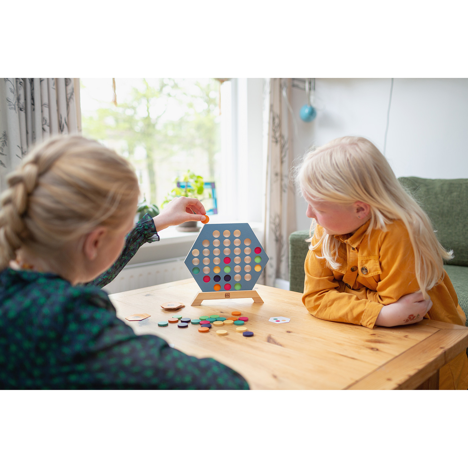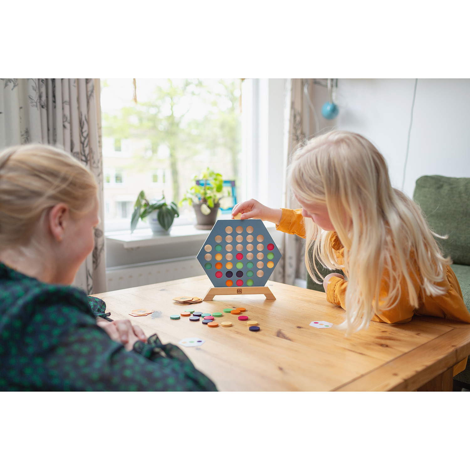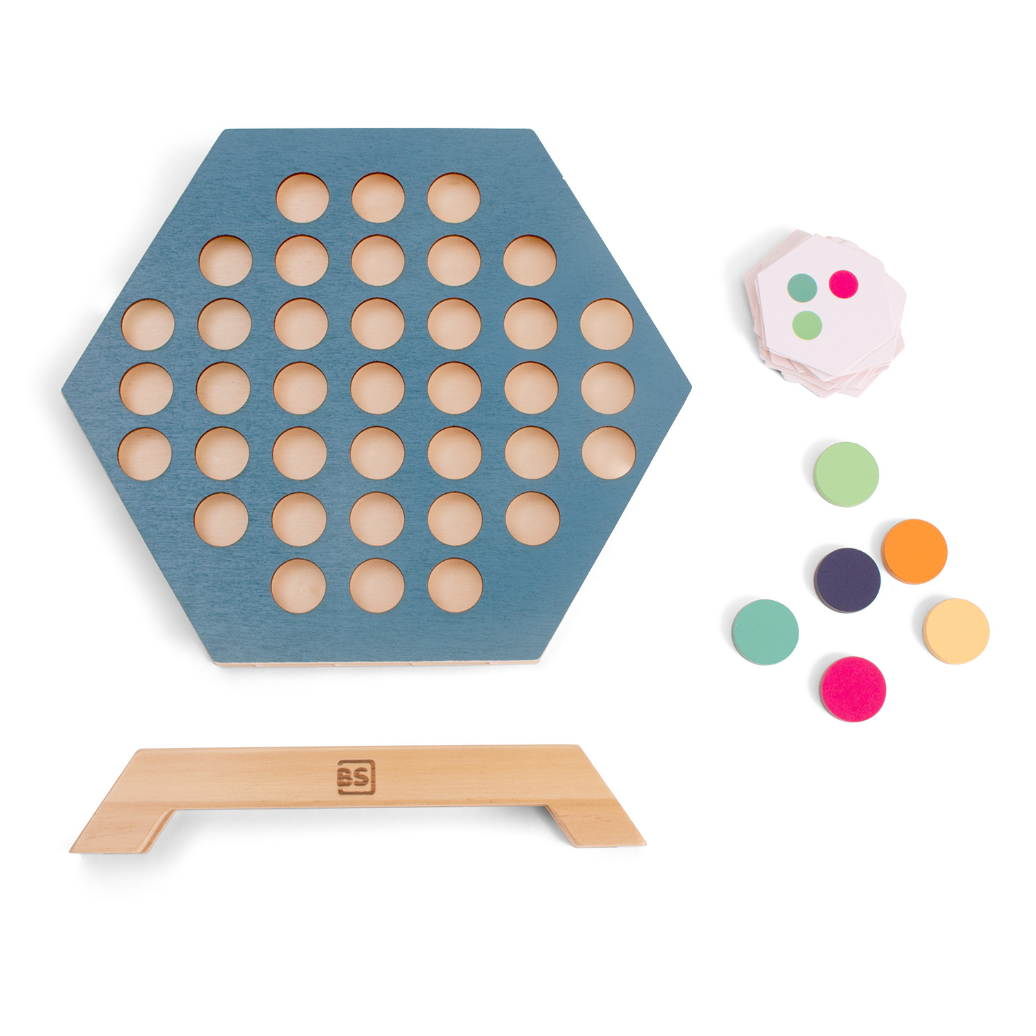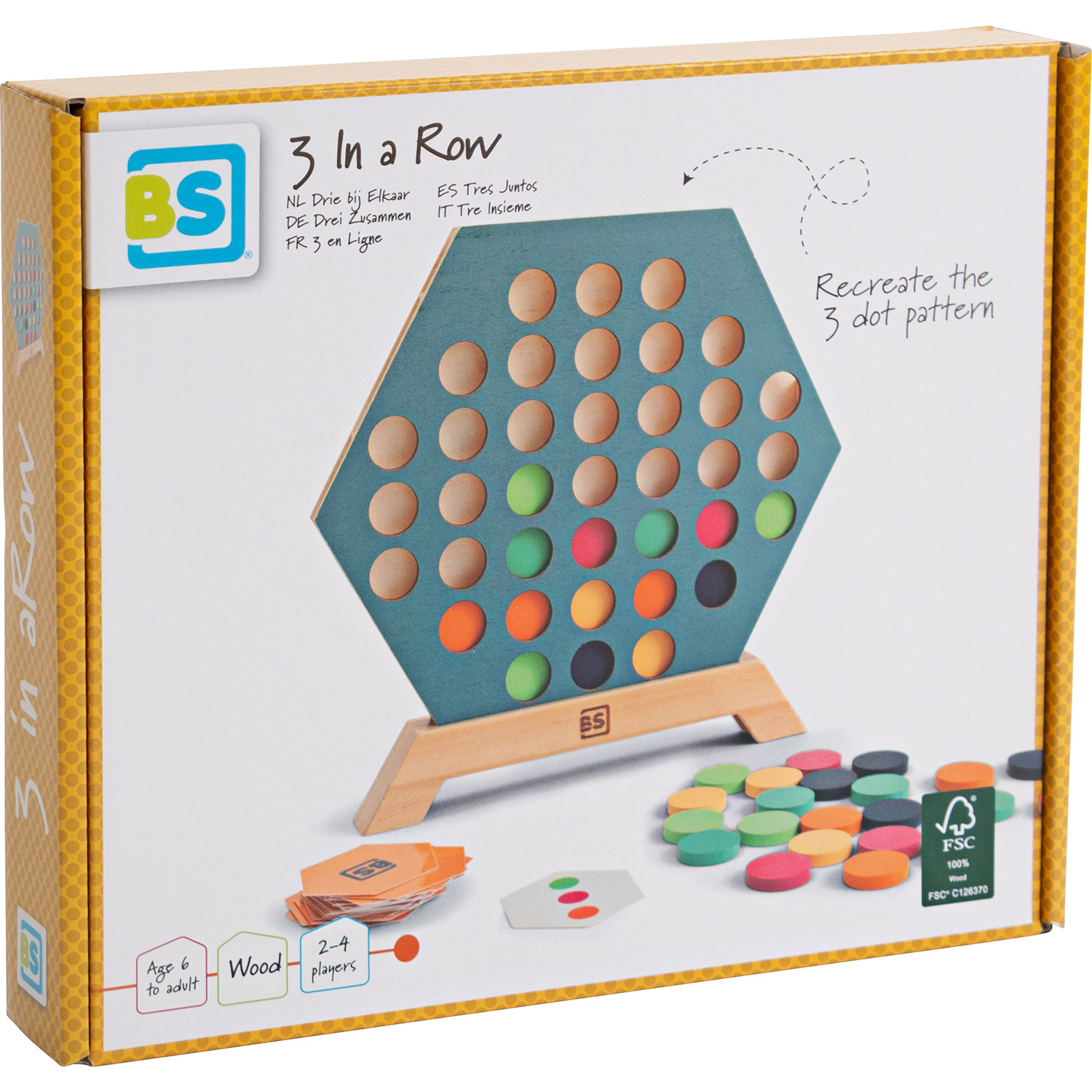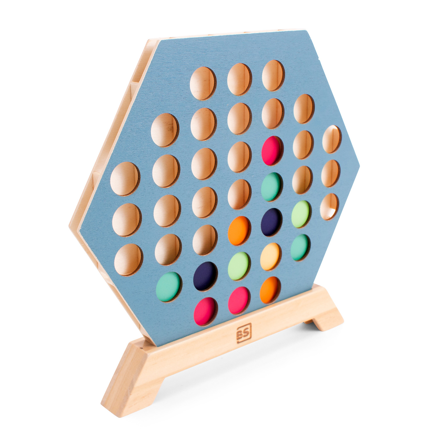 Das Spiel 3 in a Row von BS Toys ist eine spielerische Variante des klassischen Vier-Gewinnt-Spiels. Legen Sie den blauen sechseckigen Rahmen in die Basis, mischen Sie die Musterkarten und legen Sie sie verdeckt vor sich hin. Jeder Spieler wählt eine Karte aus und legt sie offen auf den Tisch. Auf diese Weise kann jeder Spieler sehen, welches Muster er oder sie legen muss. Da die Karten keine Ober- oder Unterseite haben, könnt ihr sie von allen Seiten betrachten, um zu sehen, wie das Muster aus verschiedenen Blickwinkeln aussieht. Legen Sie abwechselnd einen Stein in die Schlitze des Rahmens und versuchen Sie, das Muster auf Ihrer Karte nachzubilden. Die Herausforderung besteht nicht nur darin, das Muster auf der eigenen Karte nachzubilden, sondern auch darin, den anderen Spieler daran zu hindern, sein eigenes Muster zu vervollständigen. Der sechseckige Rahmen, der Sockel und die 36 Steine in verschiedenen Farben sind aus Holz gefertigt. Das Spiel wird mit 30 Karten geliefert. Die Abmessungen des Spiels sind 24 x 22,5 x 2,5 cm und die Karten sind 5,5 x 5 cm groß.