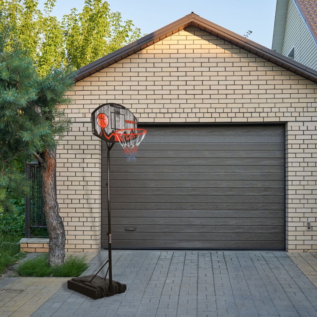 Der starke Metallring, der das stabile Allwetternetz umspannt, erfüllt den Wettkampfdurchmesser von 45 cm und ist mit einer Metallplatte an der 22 mm dicken, rippenverstärkten Rückwand fixiert. Das attraktiv gestaltete Backbord ist Rückseitig mit einer zusätzlichen 3-fach Metallstrebe verstärkt. Das mit zusätzlichen Spannstreben mit dem Standfuß verbundenen dreigeteilte ca. 5 cm starke pulverbeschichtete Rohr ist höhenverstellbar. Damit lässt sich die Korbhöhe (Metallring) von 190 cm bis 260 cm variabel verstellen. Ideal für Groß und Klein!