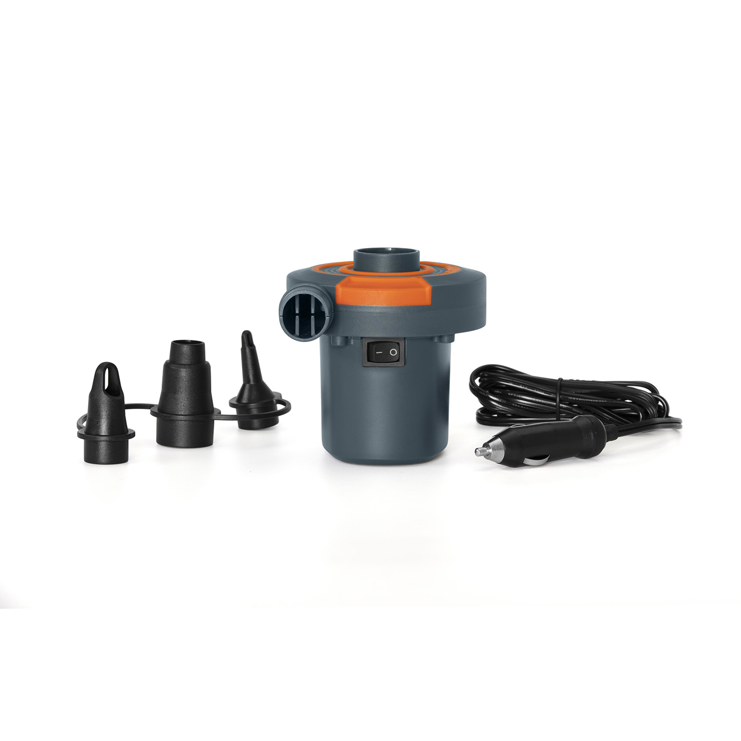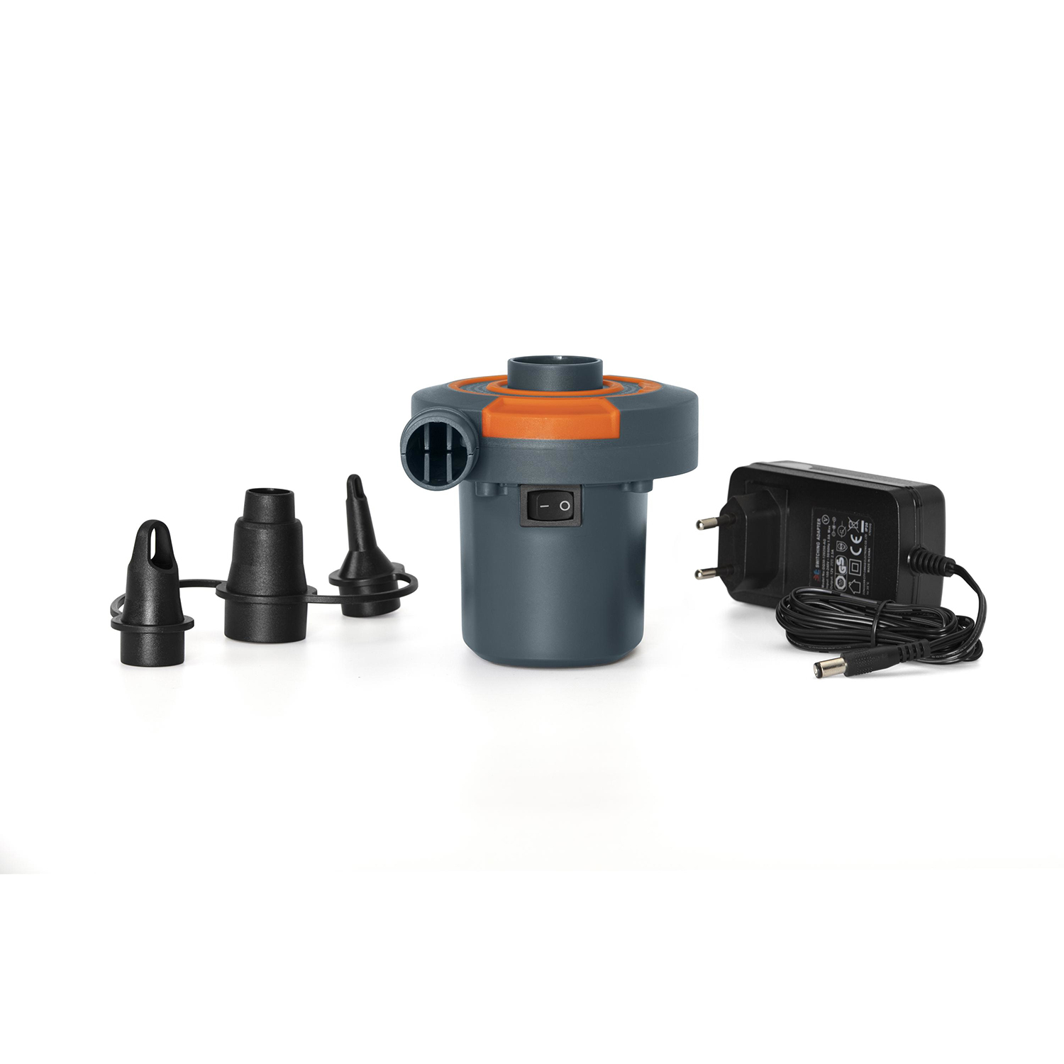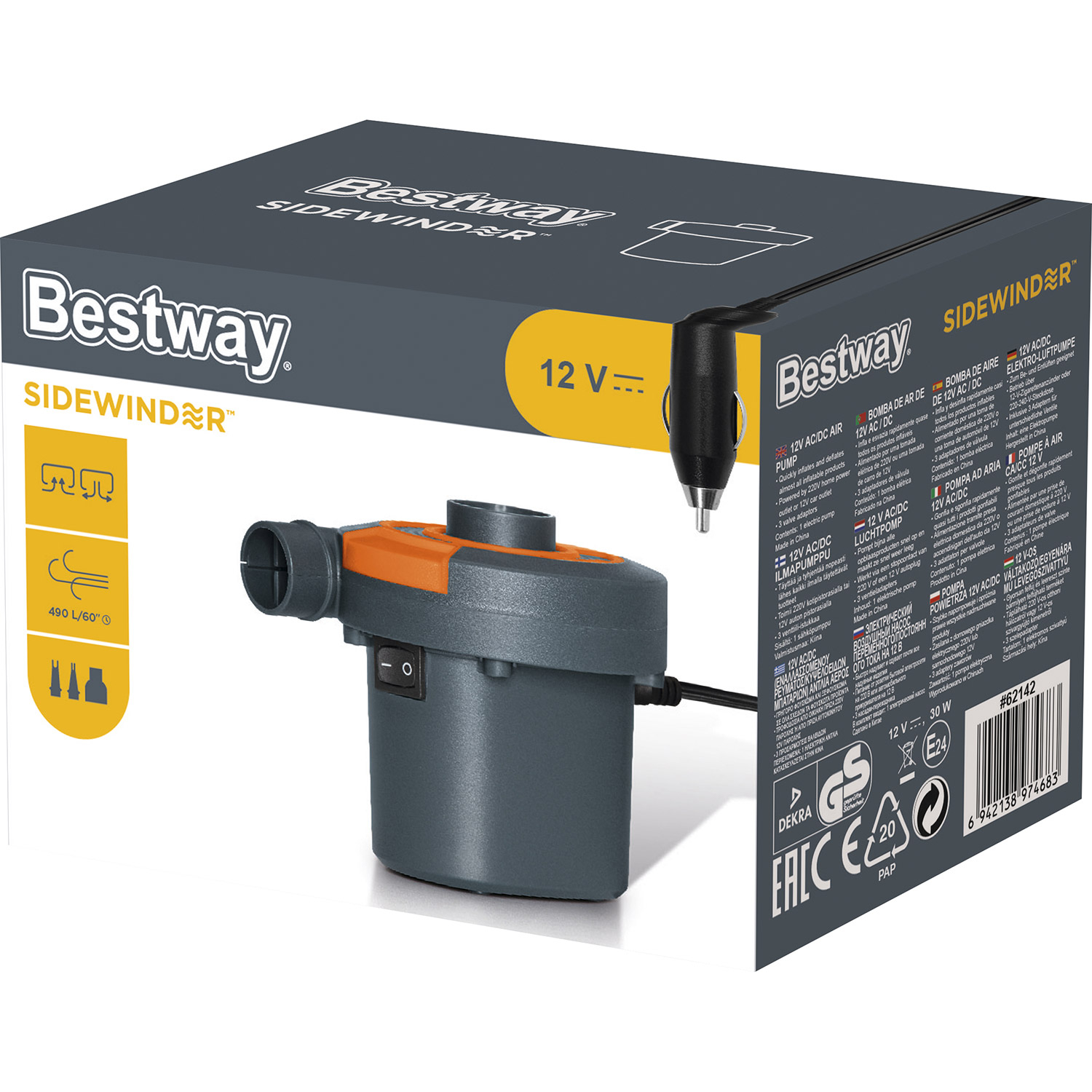 Elektrische Luftpumpe3 VentilsteckerCE/EAC/GS-zertifiziertStromversorgung: 220 V oder 12 VInklusive 12 V-Stecker und NetzkabelAufblas- und AblassfunktionLuftmenge: 490 Liter pro MinuteMax. Druck: 355 mmH2OMarke: BestwayModell: 62142
