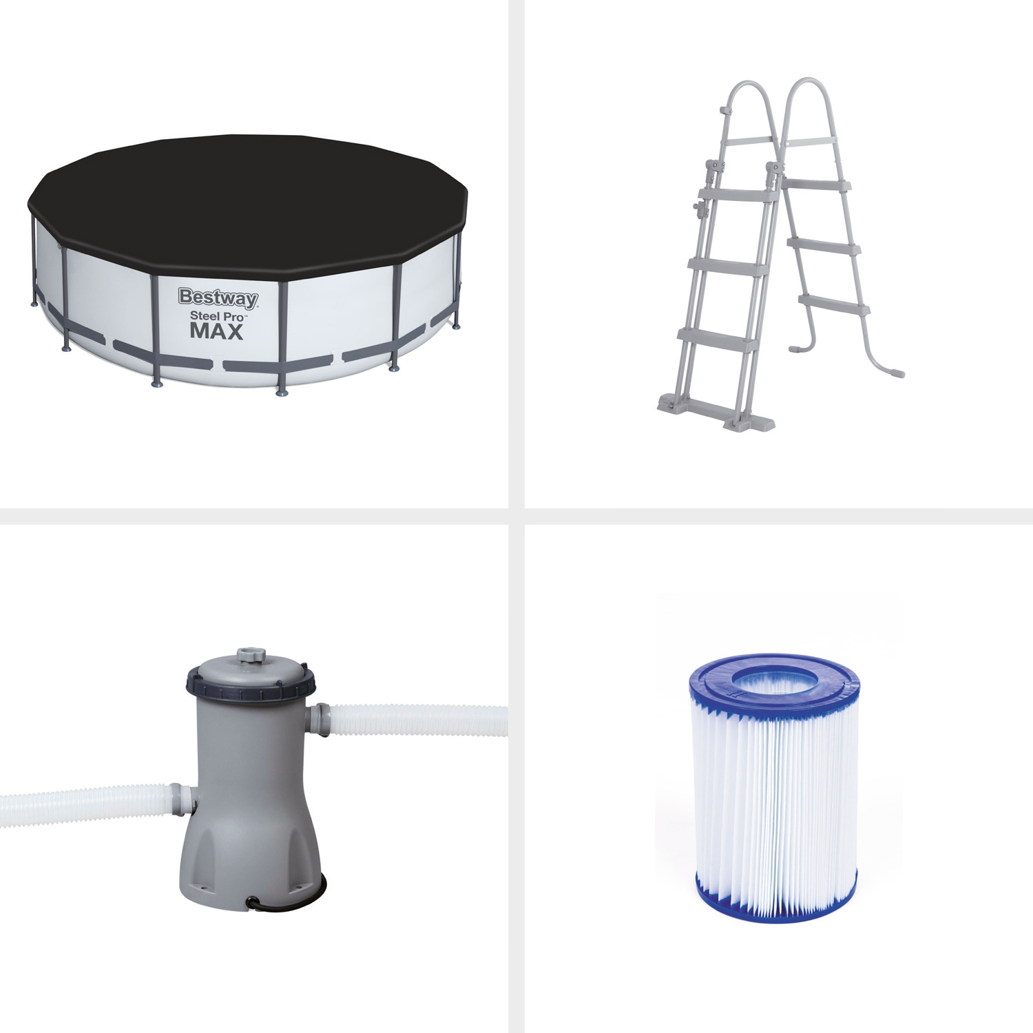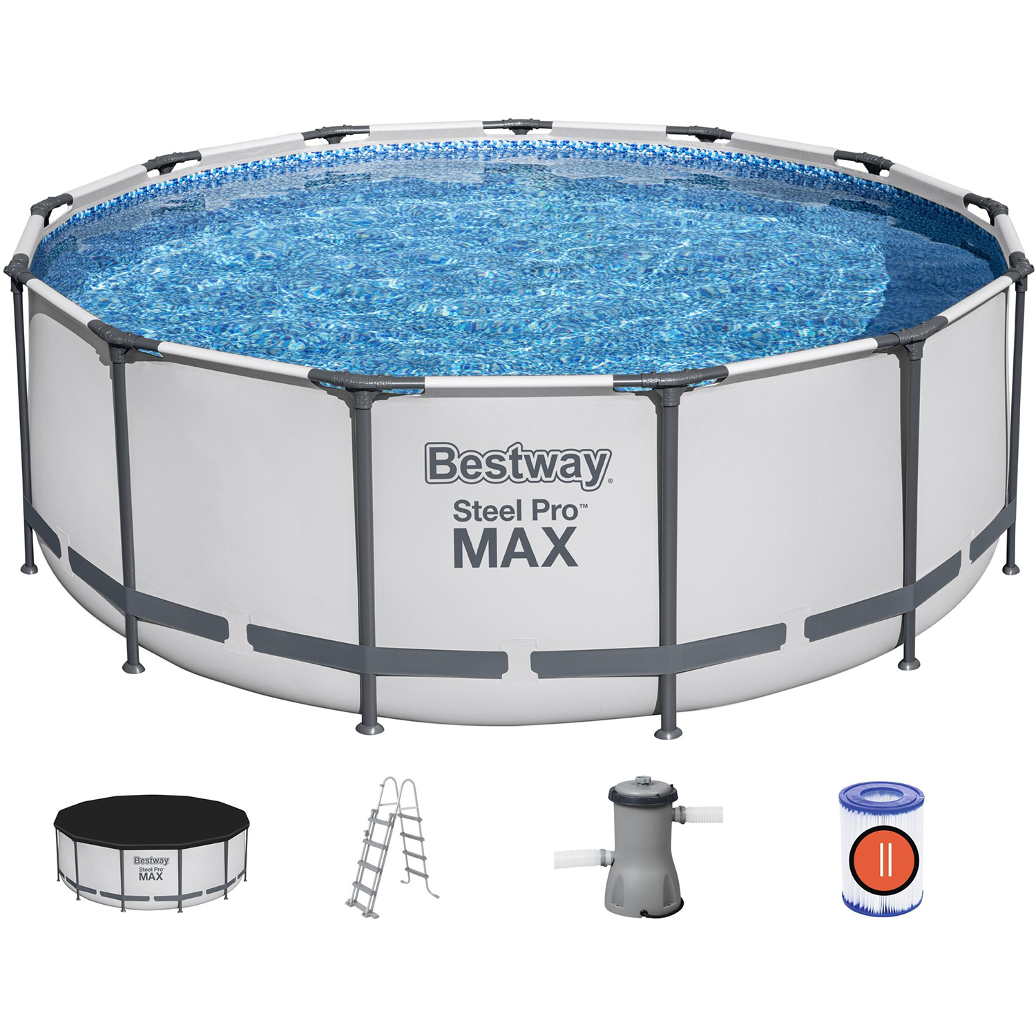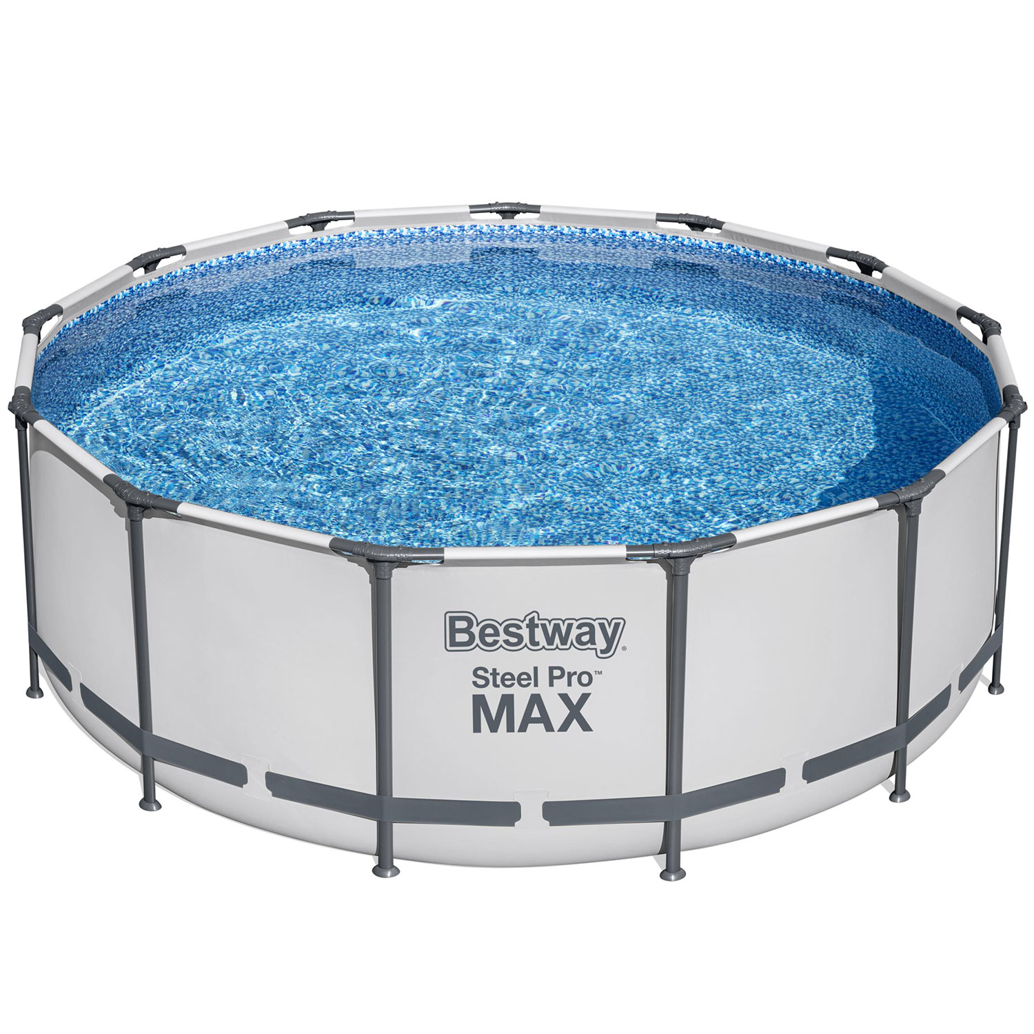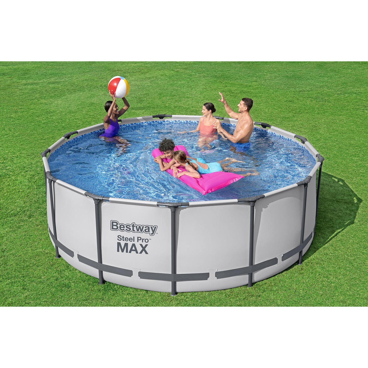 Der Bestway Steel Pro Max Rundrahmenpool hat einen Durchmesser von 396 cm und eine Höhe von 122 cm mit einem Wasserinhalt von 12.690 Litern. Der starke, rostfreie Stahlrahmen wird mit maßgefertigten T-Verbindern zusammengesteckt. So entsteht eine starke Rohrverbindung, die Korrosion von Metall auf Metall verhindert. Die Wände des Bestway-Rundbeckens bestehen aus dem sehr widerstandsfähigen DuraPlus, einem Material, das aus einem Kern aus robustem Polyestergewebe zwischen zwei Schichten aus hochwertigem PVC besteht. Dieses komplette Bestway-Pool-Set besteht aus einem runden, oberirdischen Steel Pro Max-Rahmenpool mit hellgrauer Außenseite und einer Innenseite mit Kieselmosaikdruck. Mit der mitgelieferten Abdeckung verhindern Sie die Verschmutzung des Schwimmwassers und mit der Filterpumpe inklusive Filterkartusche halten Sie das Wasser sauber, damit Sie Ihren eigenen Pool einen langen Sommer lang genießen können. Um leicht in den Pool ein- und auszusteigen, wird dieses Poolset mit einer Poolleiter mit einer Höhe von 122 cm und 8 Stufen geliefert. Der Bestway-Pool lässt sich schnell und werkzeuglos zusammenbauen. Am Ende der Saison ist der Pool ebenso schnell wieder weggeräumt. Das Ablassventil kann an einen Gartenschlauch angeschlossen werden, so dass Sie das Wasser ablassen können, wo immer Sie wollen. Dieser Bestway Steel Pro Max Rundrahmenpool wird mit Filterpumpe, Stufen, Abdeckung und Reparaturflicken geliefert.