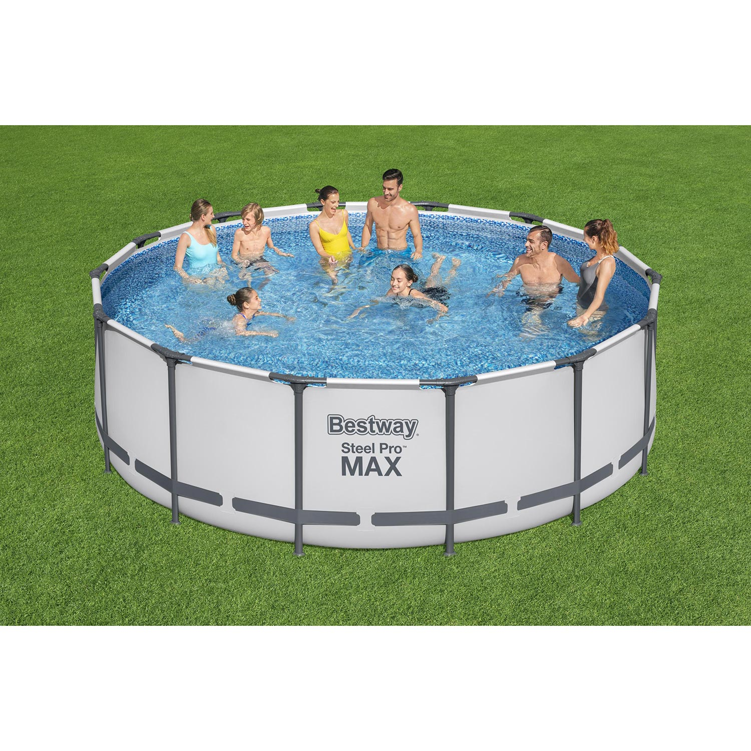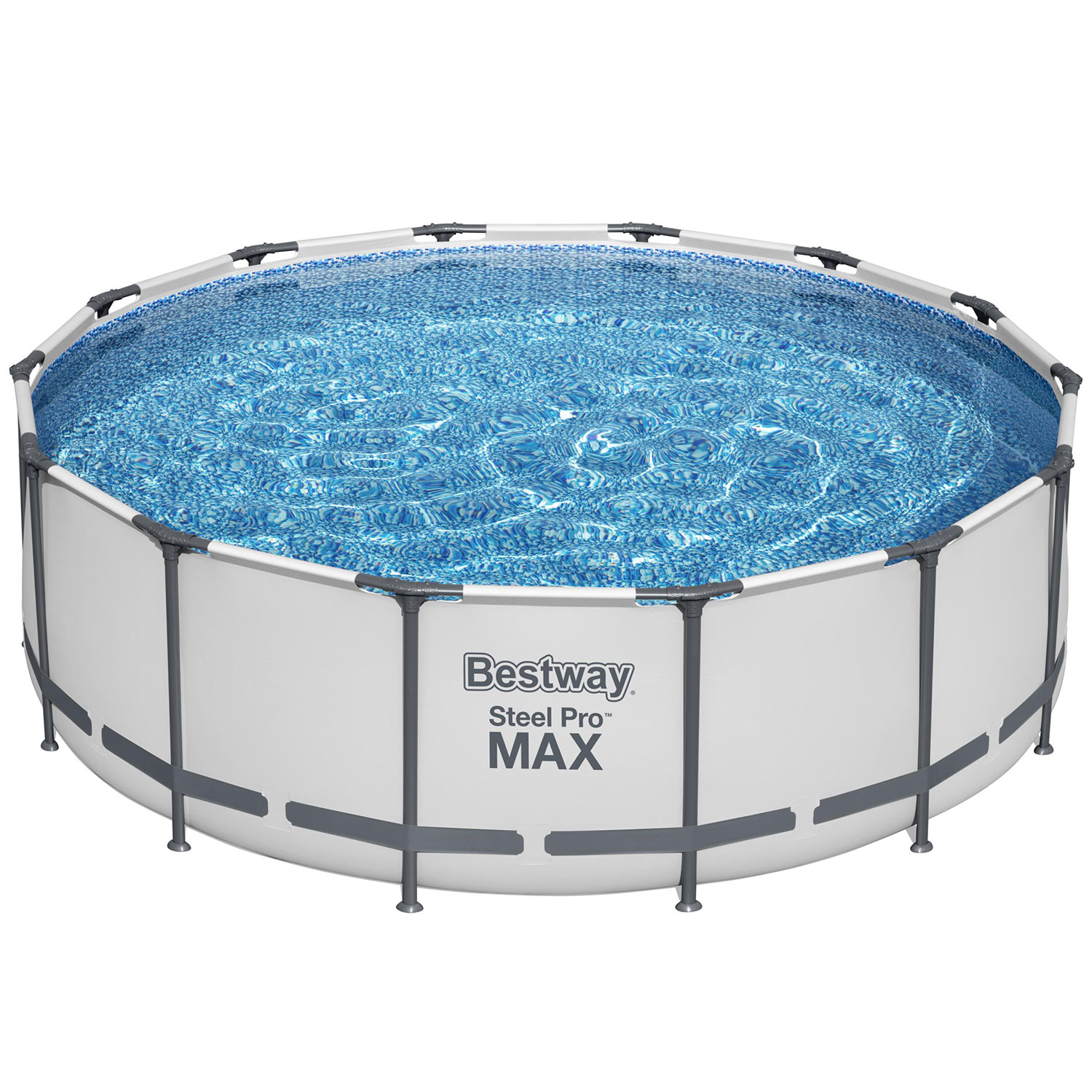 Dieser Bestway Steel Pro Max Rundrahmenpool wird mit Filterpumpe, Stufen, Abdeckung und Reparaturpflaster geliefert. Der Bestway-Pool hat einen Durchmesser von 427 cm und eine Höhe von 122 cm mit einer Wasserkapazität von 15.232 Litern. Der starke, rostfreie Stahlrahmen wird mit speziell angefertigten T-Verbindern zusammengesteckt. Dadurch entsteht eine starke Rohrverbindung, die eine Metall-auf-Metall-Korrosion verhindert. Die Wände des runden Bestway Steel Pro Max Pools bestehen aus dem sehr haltbaren DuraPlus, einem Material, das aus einem Kern aus robustem Polyestergewebe zwischen zwei Schichten aus hochwertigem PVC besteht. Dieses Bestway-Pool-Komplettset enthält ein rundes, oberirdisches Steel Pro Max-Rahmenbecken mit einer hellgrauen Außenseite und einer Innenseite mit Kieselsteinmosaikdruck. Mit der mitgelieferten Abdeckung verhindern Sie die Verschmutzung des Schwimmwassers und mit der Filterpumpe inklusive Filterkartusche halten Sie das Wasser sauber, damit Sie Ihren eigenen Pool einen langen Sommer lang genießen können. Um leicht in den Pool ein- und auszusteigen, wird dieses Poolset mit einer Poolleiter mit einer Höhe von 122 cm und 8 Stufen geliefert. Der Bestway-Pool lässt sich schnell und werkzeuglos zusammenbauen. Am Ende der Saison ist der Pool ebenso schnell wieder weggeräumt. Das Ablassventil kann an einen Gartenschlauch angeschlossen werden, so dass Sie das Wasser ablassen können, wo immer Sie wollen.
