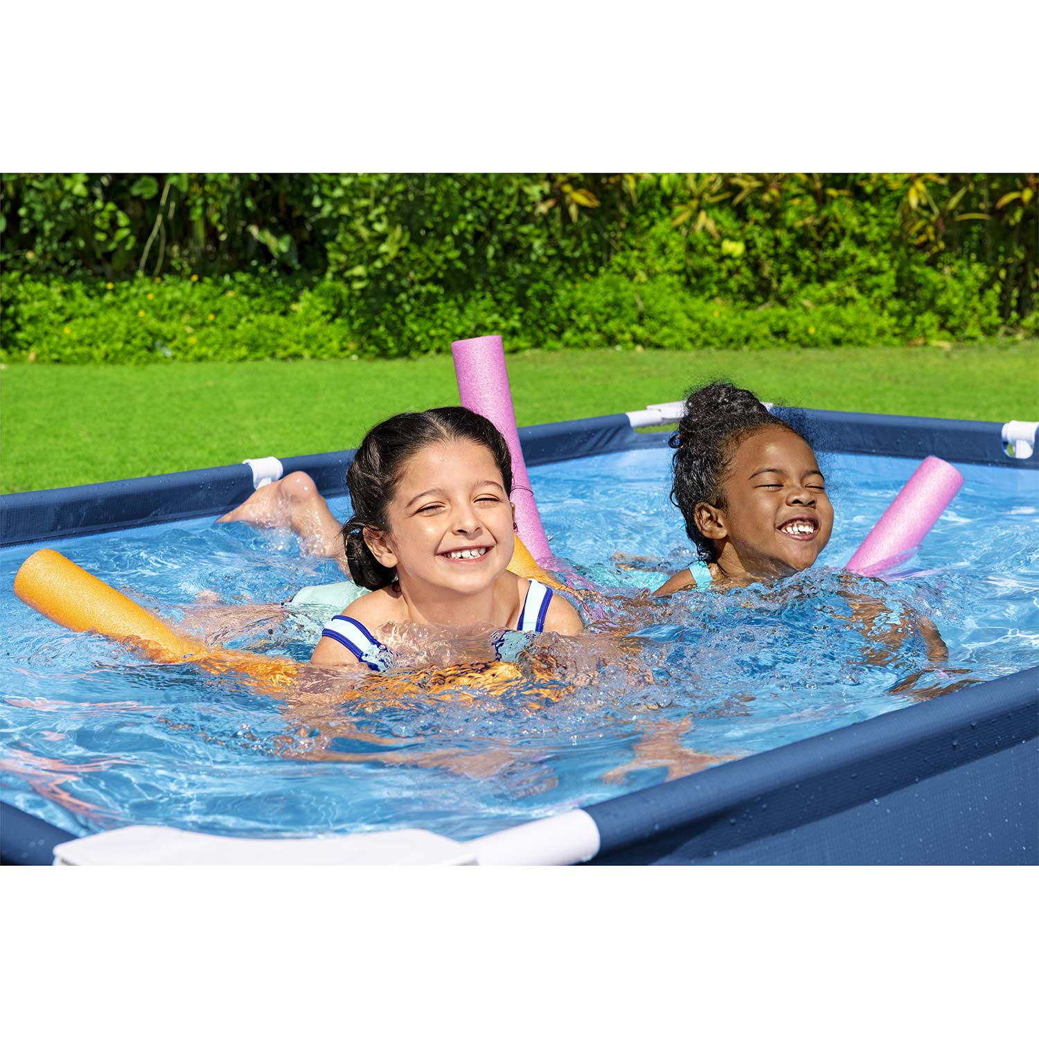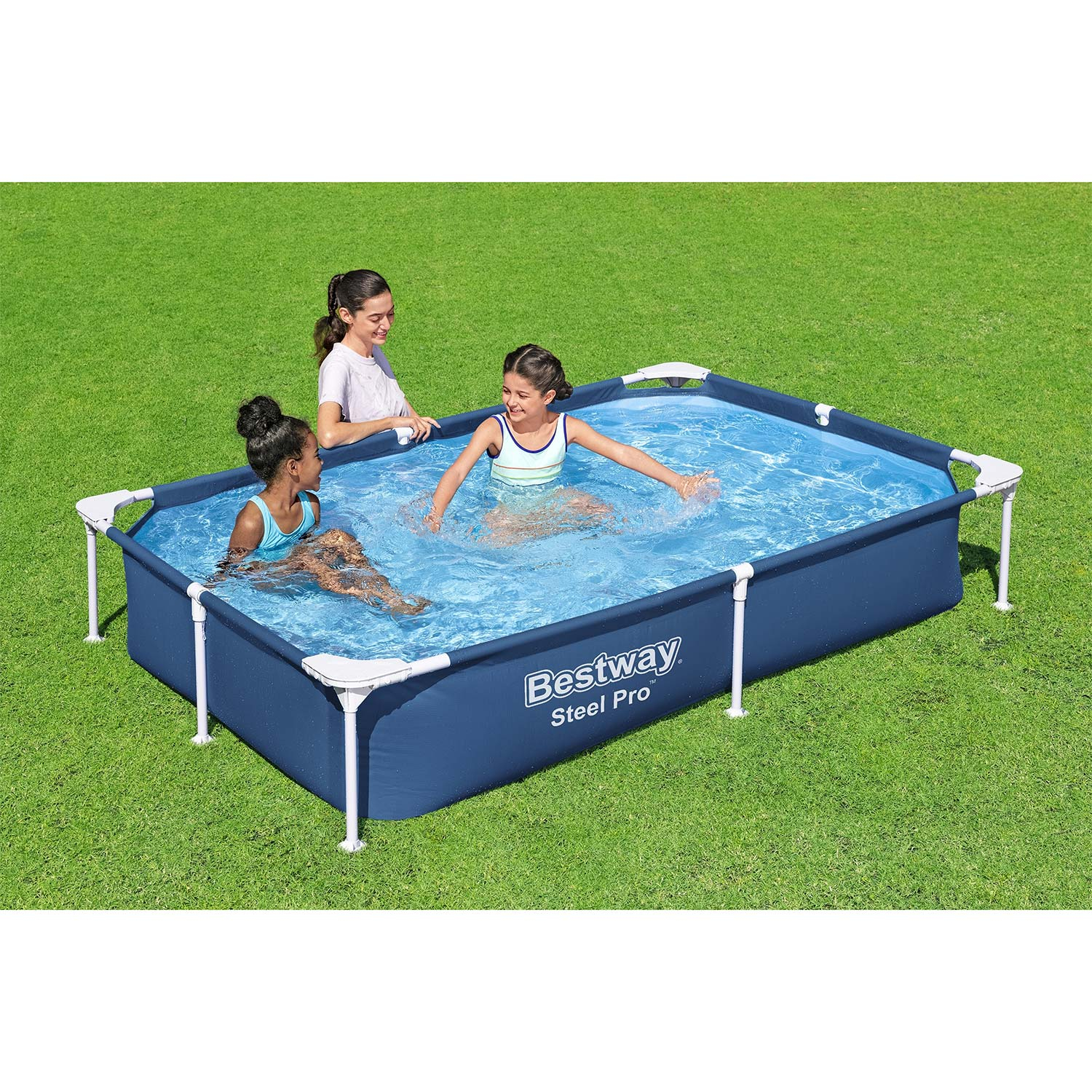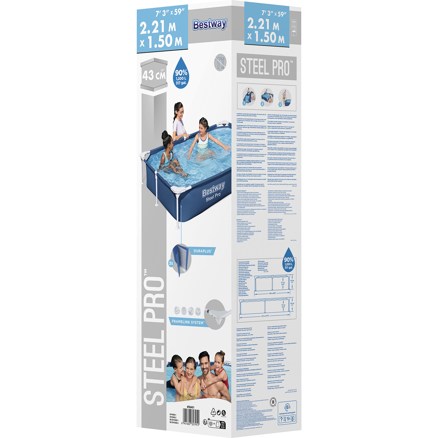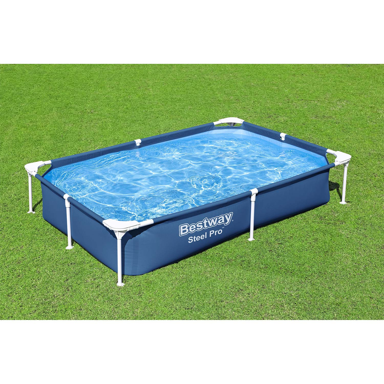 Unterirdisches Schwimmbad mit rechteckigem RahmenLänge: 221 cmBreite: 150 cmHöhe: 43 cmWasserkapazität: 1200 LiterMaterial: PVC, Polyester und StahlSchlauchdurchmesser: 3,2 cmAblassventilInklusive ReparatursetInstallationszeit: ca. 20 Minuten mit 2-3 Personen ohne Befüllung.