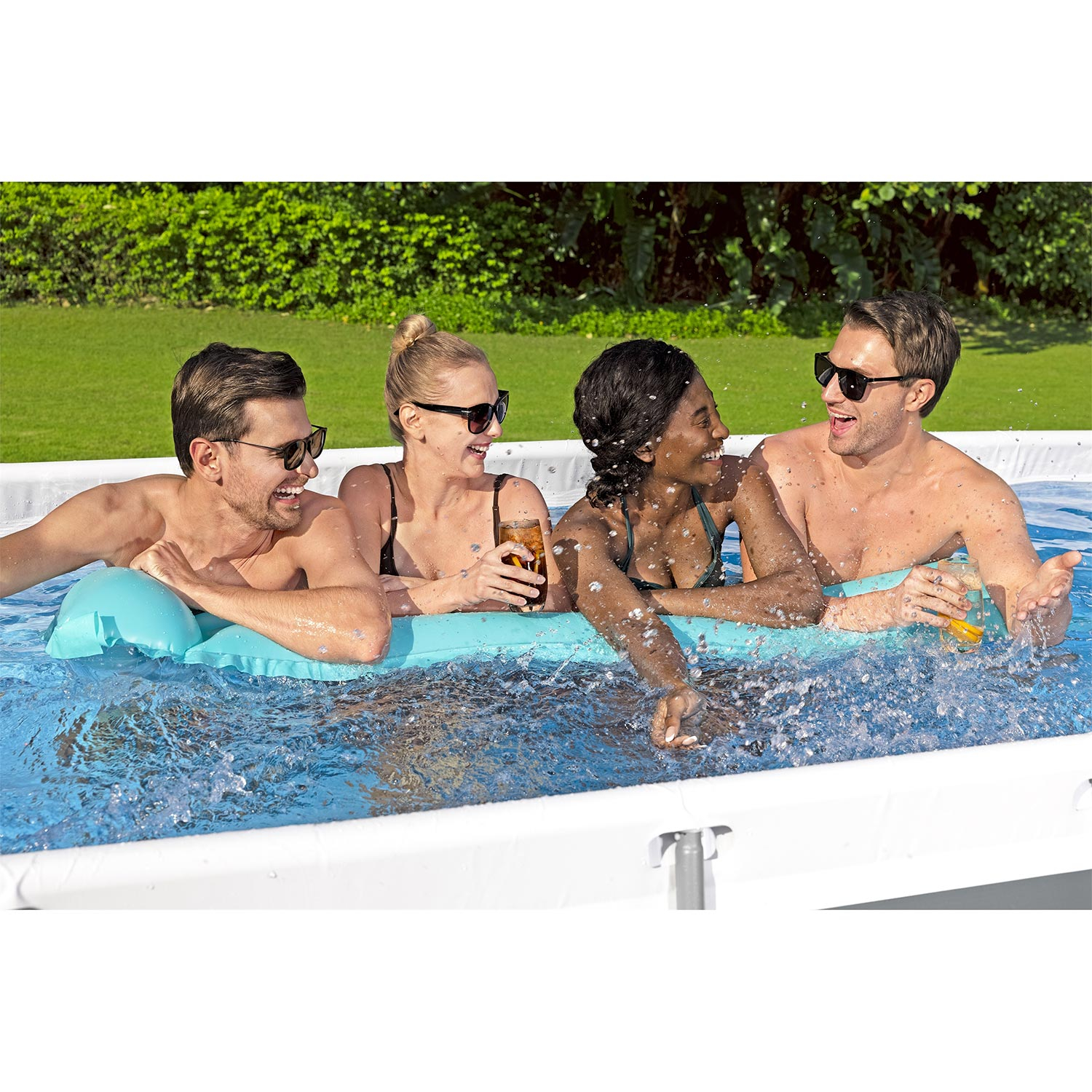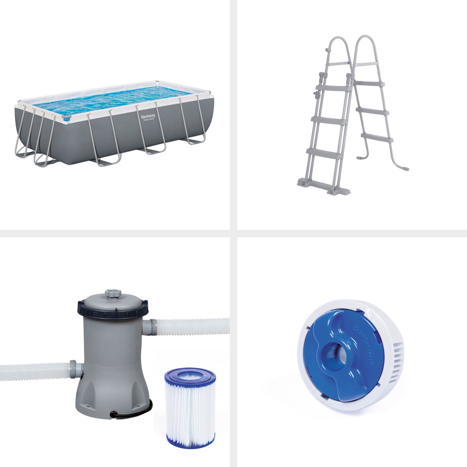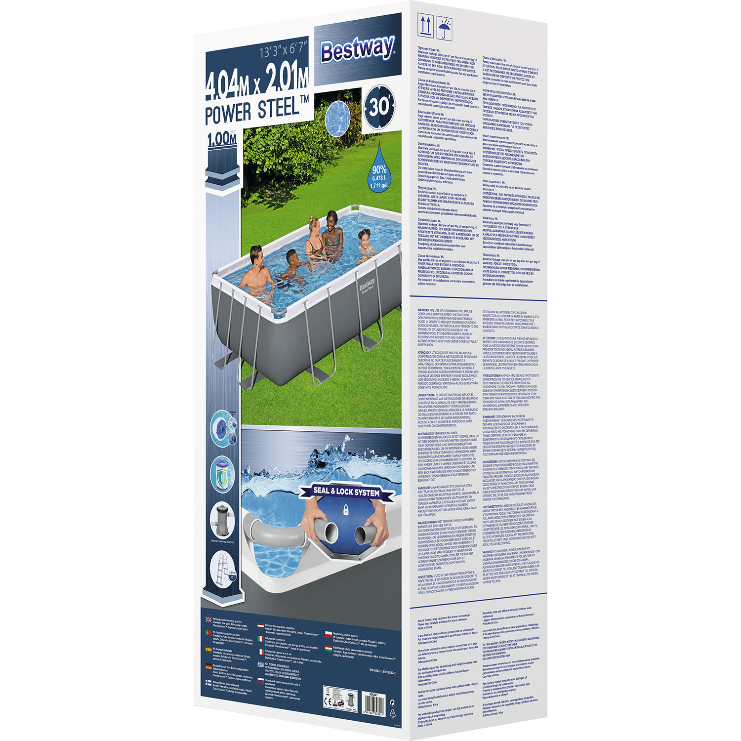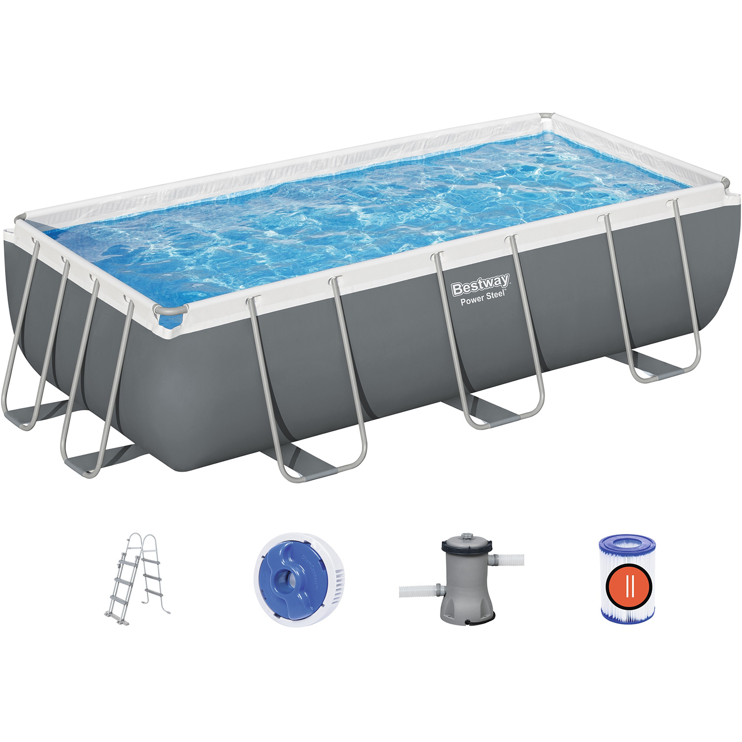 Erleben Sie den coolsten Sommer aller Zeiten mit Ihrem eigenen Pool im Garten! Der Bestway Power Steel Frame Pool hat eine Länge von 404 cm, eine Breite von 201 cm und eine Höhe von 100 cm. Die Außenmaße des Pools betragen 441 cm x 241 cm. Beachten Sie dies also, wenn Sie messen, ob der Pool in Ihren Garten passt. Der Steel Pro-Pool hat eine graue Außenseite und eine Innenseite in Mosaikoptik. Der Power Steel-Pool hat einen Edelstahlrahmen mit dem sicheren und einfachen Seal & Lock-System. Das System gewährleistet eine sichere und starke Rohrverbindung und verhindert Korrosion von Metall zu Metall. Die Poolwand ist aus extrem starkem 3-lagigem TriTech-Material gefertigt. TriTech ist wesentlich reißfester und dehnbarer als herkömmliches PVC, so dass Ihr Pool viele Sommer lang halten wird. Zusätzlich zu dem rechteckigen Pool enthält dieses Bestway Power Steel Poolset eine Filterpumpe, eine Filterkartusche, eine Poolleiter und einen ChemConnect Chemikaliendispenser. Letzterer sorgt für sauberes und gesundes Poolwasser, indem er die richtige Menge an Chlor gleichmäßig im Pool verteilt.