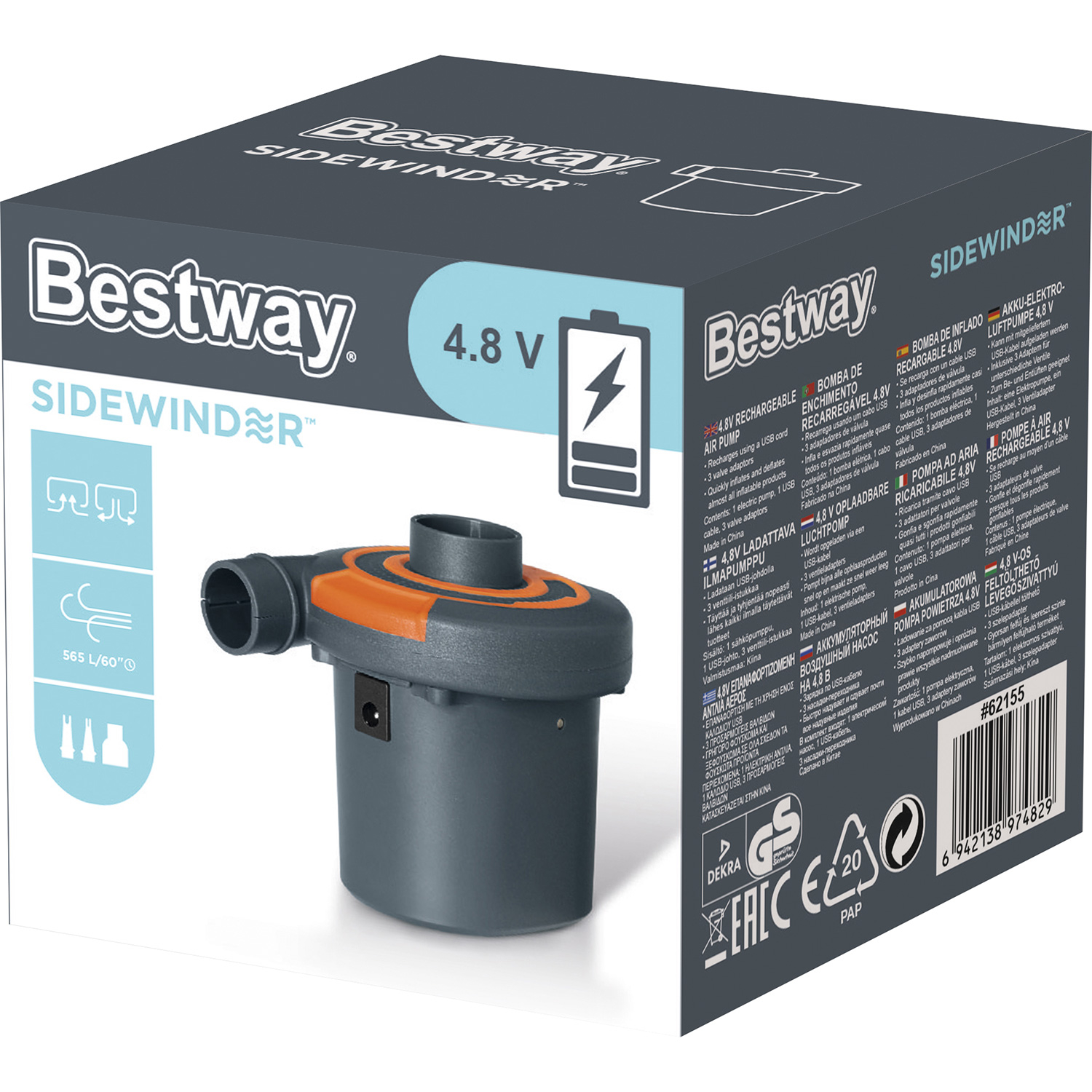 Die Bestway Sidewinder wiederaufladbare Luftpumpe 4.8V arbeitet mit den 4 mitgelieferten wiederaufladbaren 1.500mAh Batterien. Die Pumpe kann nur mit dem mitgelieferten USB-Ladekabel verwendet werden (ohne Steckdosenadapter). Mit der wiederaufladbaren Pumpe können Sie also Ihren Swimmingpool, Ihr Kajak, Ihr Luftbett und Ihre aufblasbaren Figuren überall dort aufblasen, wo es keine Steckdose gibt. Die Luftpumpe ist mit drei Ventilsteckern ausgestattet, so dass sie an fast jedes aufblasbare Objekt angeschlossen werden kann. Mit der wiederaufladbaren Luftpumpe von Bestway Sidewinder können Sie ganz einfach zwischen Aufblasen und Entleeren wechseln. So pumpen Sie Ihren Pool nicht nur auf, sondern können auch ganz einfach die Luft entfernen, damit Sie den Pool wieder einlagern können.