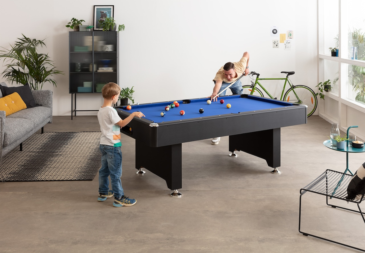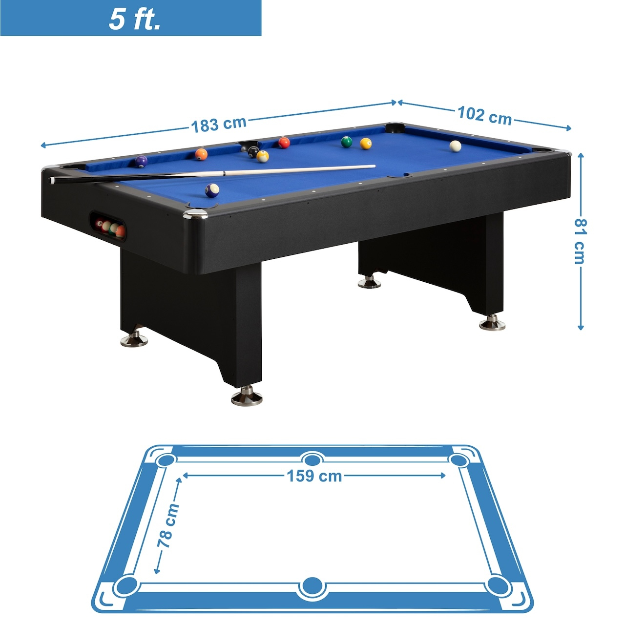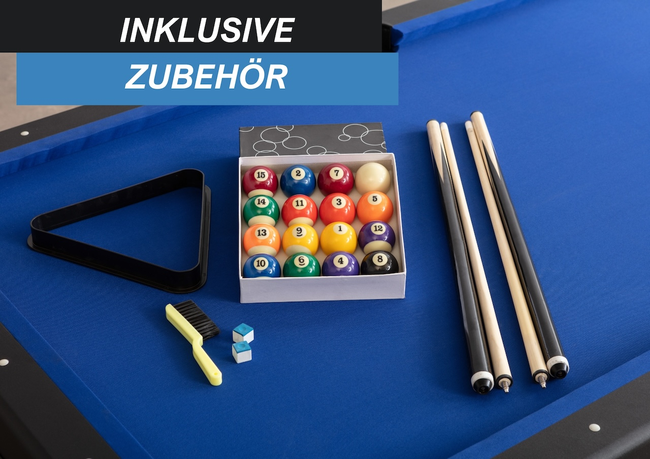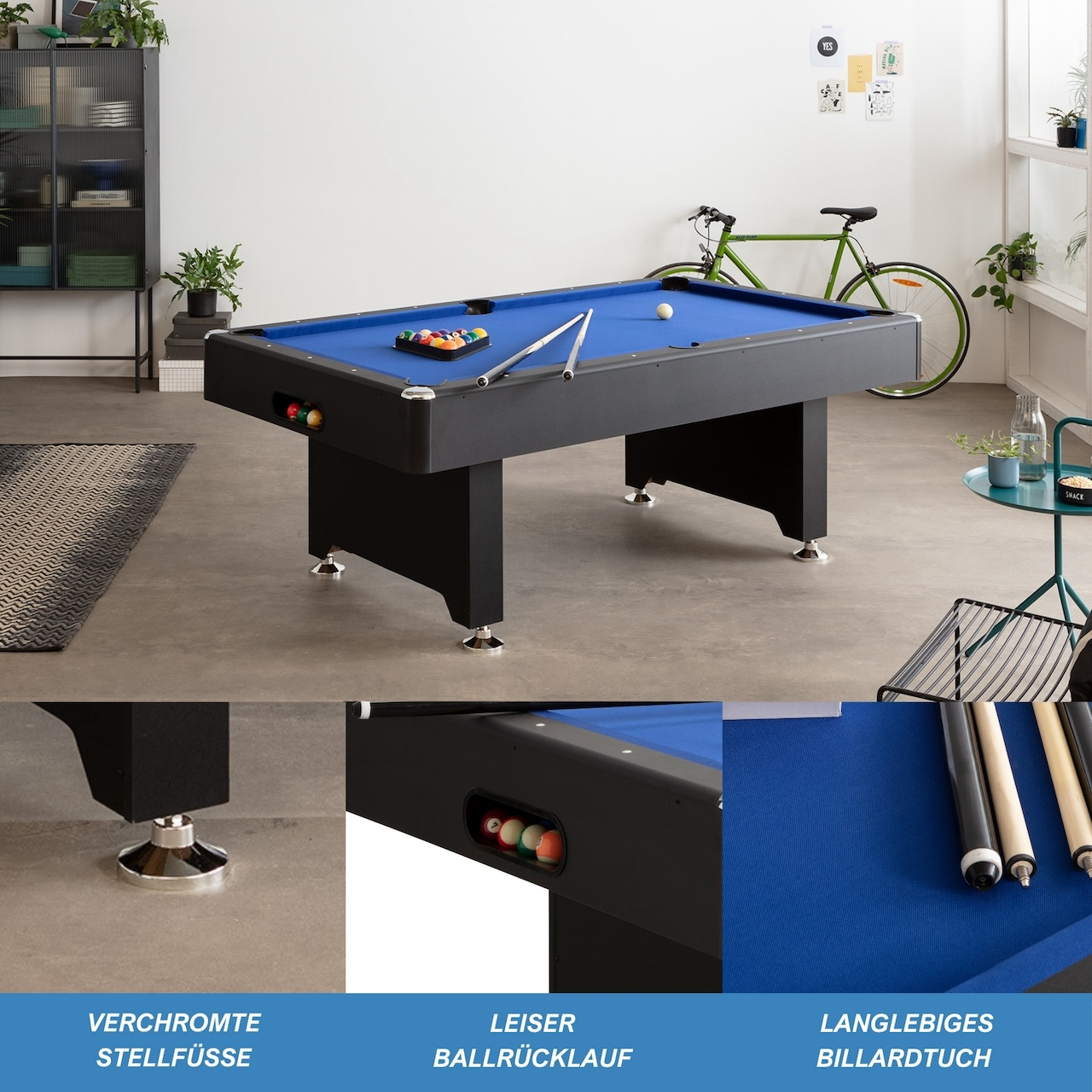 Der Billardtisch hat eine 20 mm starke Spielplatte (Holzwerkstoff), die mit einem langlebigen blauen Billardtuch belegt ist. Hochwertige Banden aus Naturkautschuk garantieren ein gezieltes Zurückspringen der Kugeln. Für eine einfache und zentrale Ballentnahme ist ein geräuscharmer automatischer Ballrücklauf in den stabilen Unterbau integriert. Das Design ist Kindersicher und familienfreundlich durch abgerundete Ecken, der schwarze Korpus lässt sich leicht in verschiedene Räume integrieren und das blaue Spieltuch gibt dem Tisch ein optisches Highlight. Ideal für zu Hause, Jugendclubs und Grundschulen. Der Billardtisch wird inkl. Spielzubehör geliefert: 2 Queues, Billardkugeln, Triangel und Billardkreide. Der Korpus ist bereits vormontiert - einfacher und schneller Aufbau. Erhältlich in den Größen 5 ft. und 6,5 ft.