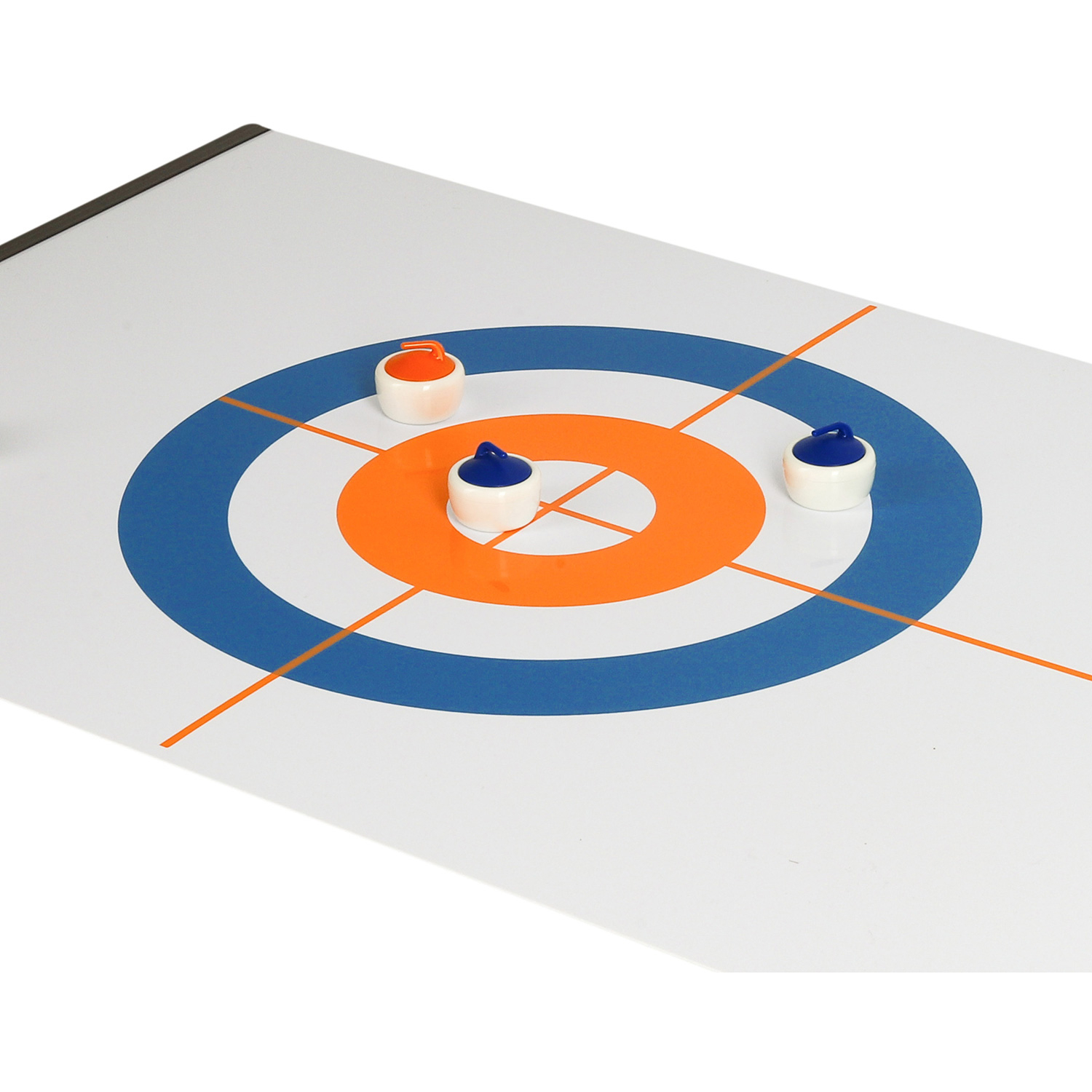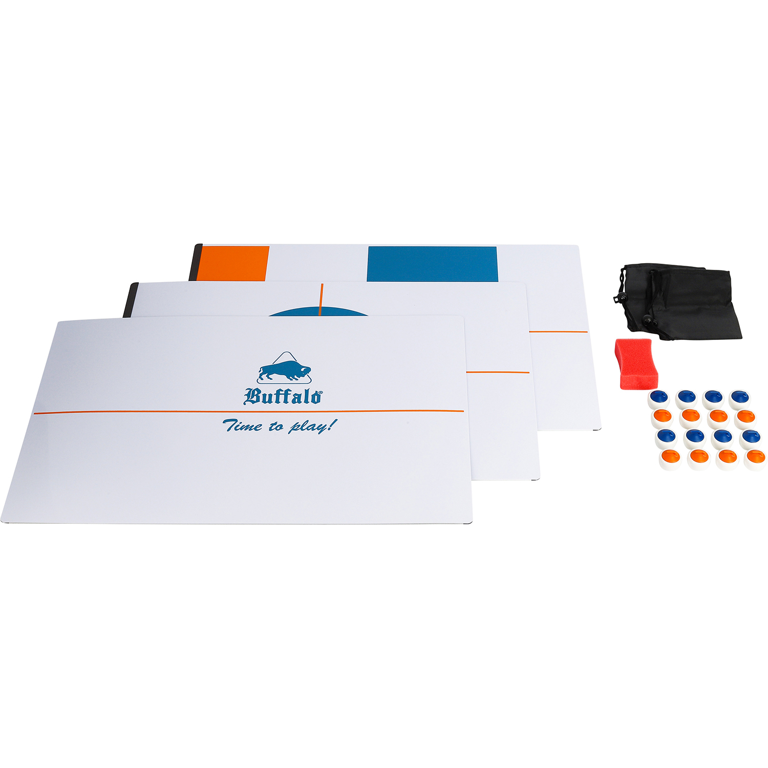 Eine meisterhafte Kombination aus zwei spannenden Spielen, perfekt für Kinder, Jugendliche und Erwachsene. Egal, ob Sie ein Familientreffen organisieren oder einen lustigen Abend mit Freunden verbringen wollen, dieses Spiel bietet garantiert stundenlange Unterhaltung für alle. Mit den mitgelieferten Steinen können Sie sowohl Curling als auch American Shuffleboard spielen. Bei American Shuffleboard tritt man wirklich gegeneinander an. Du kämpfst um die höchste Punktzahl, indem du die Pucks strategisch in die nummerierten Felder schiebst. Aber Vorsicht, es zählen nur die Punkte der Pucks, die am Gegner vorbeigezogen sind. Mit einem geschickten Spielzug kannst du den Punktestand sogar sofort ändern, indem du den Puck deines Gegners vom Spielfeld springen lässt! Auch für Fans des Curlings bietet dieses Spiel jede Menge Spaß. Schieben Sie den Stein so nah wie möglich an den inneren Kreis heran, um dieses spannende Spiel zu gewinnen. Mit dem Buffalo Curling- und Shuffleboard-Spiel können Sie mühelos zwischen diesen verschiedenen herausfordernden Spielen wechseln. Dank des cleveren Designs des Spielbretts, das aus drei separaten Brettern besteht, die mit einem praktischen Magnetstreifen verbunden sind, ist das Spiel auch leicht zu verstauen. Die Bretter sind zusammen 39 cm breit und 180 cm lang, so dass Sie dieses vielseitige Spiel überall spielen können. Worauf warten Sie noch? Holen Sie sich den Spaß von Buffalo Curling und American Shuffleboard nach Hause und erleben Sie gemeinsam unvergessliche Momente von Wettbewerb und Spaß!