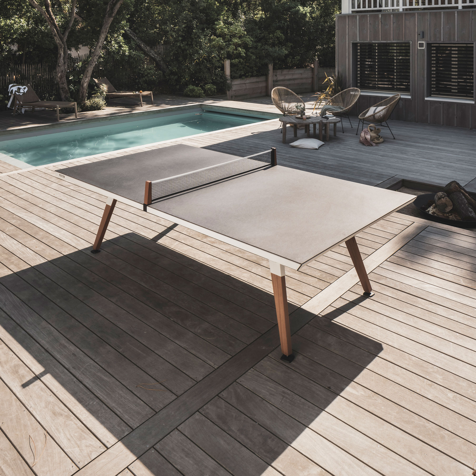Die Origin Outdoor-Tischtennisplatte zeichnet sich durch Ihre matte Oberfläche und elegantes Design aus. Das stilvolle Design der Tischtennisplatte verschönert nicht nur den Ort, an dem sie aufgestellt wird, sondern passt sich diesem auch an und ist somit ein perfektes Einrichtungsobjekt für jeden Raum. Durch die höhenverstellbaren Drehfüße kann der Tisch auch auf unebenem Untergrund stabilisiert werden und als praktisches Extra befindet sich unter der Tischplatte ein Staufach für zwei Schläger und sechs Bälle.
