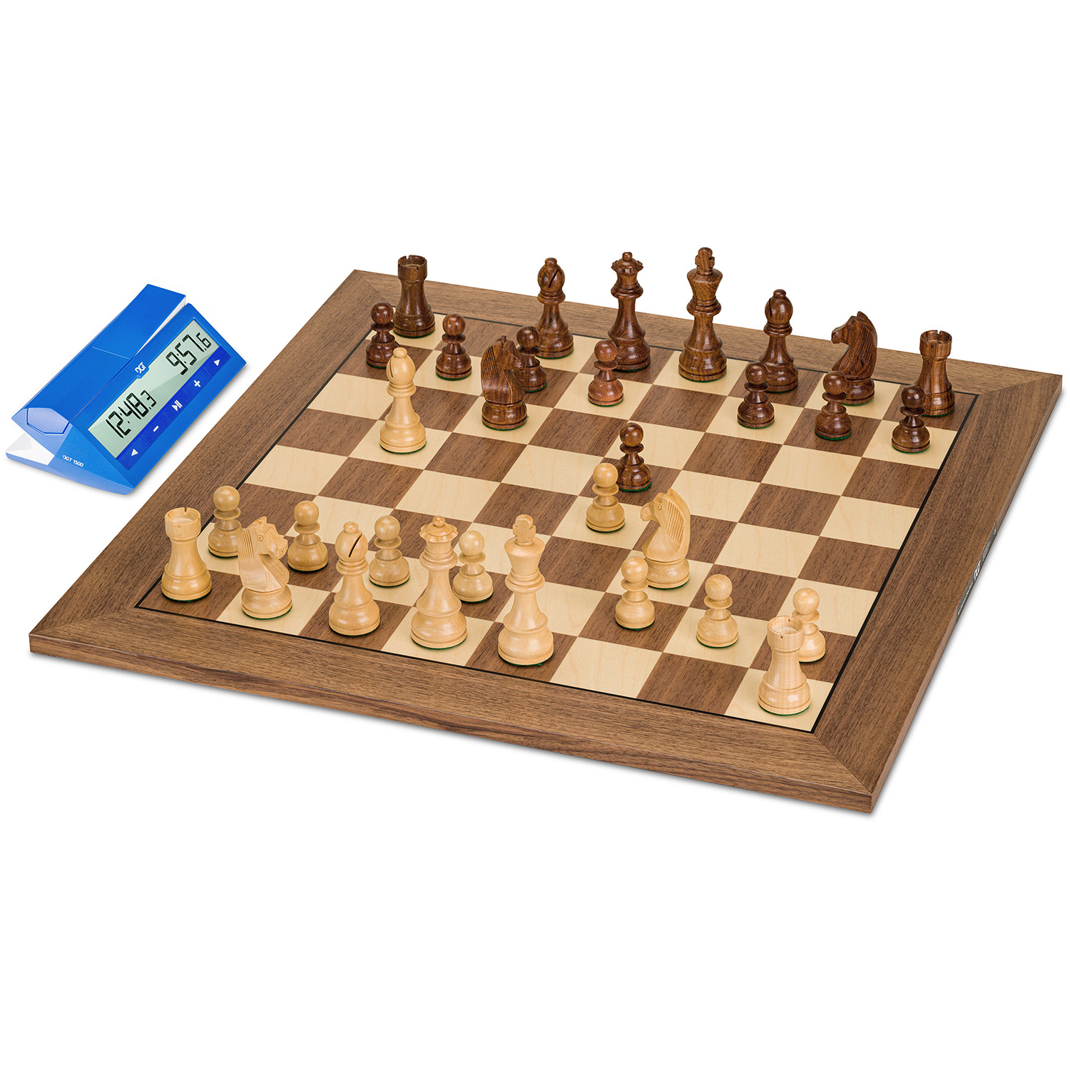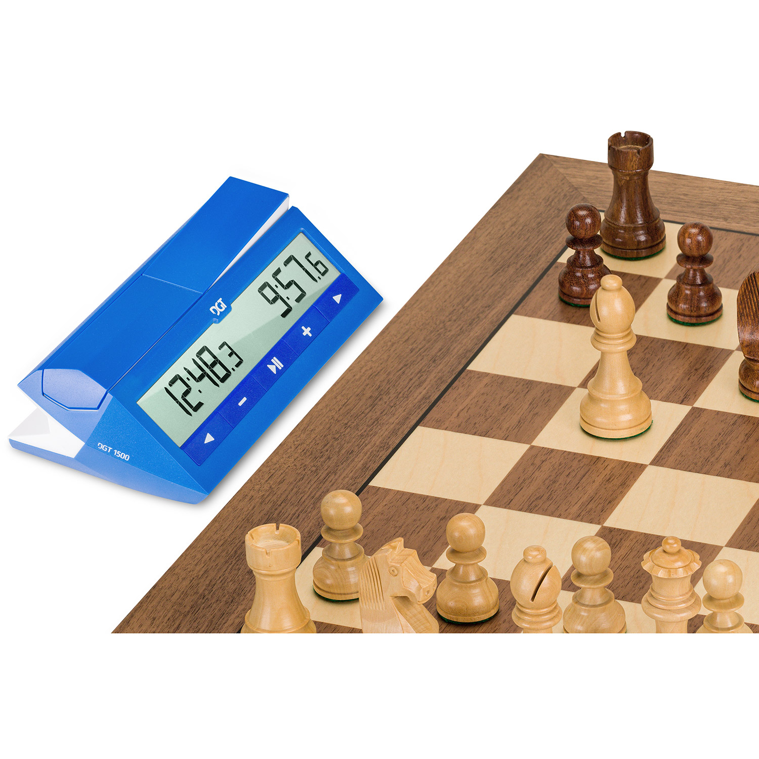 Die DGT1500 Schachuhr wurde mit Blick auf schnelle Schachspiele entwickelt und ist daher die perfekte Spielzeituhr, wenn jede Sekunde zählt. Einzigartig an der DGT1500 ist die zusätzliche Ziffer, die Zehntelsekunden anzeigt, eine großartige Funktion, um die verbleibende Spielzeit im Auge zu behalten. Die Spieler können diese Funktion ein- oder ausschalten oder sie ab einer bestimmten Zeit anzeigen lassen. Diese Flexibilität macht sie zur besten Wahl für alle, die schnelle, spannende Schachkämpfe suchen. Die Uhr kann mit einer Zeitspanneneinstellung verwendet werden, was ideal für Spieler ist, die eine einfache Erfahrung schätzen und sich auf das Wesentliche des Spiels konzentrieren wollen, ohne durch komplexe Zeiteinstellungen abgelenkt zu werden. Eine außergewöhnliche Funktion ist die Zeitvorteil-Option, die es erlaubt, für jeden Spieler unterschiedliche Zeiten einzustellen, was dem Spiel eine zusätzliche Ebene der Strategie und Fairness verleiht. Diese Funktion ermöglicht es Spielern mit unterschiedlichen Spielstärken, ein Spiel gemeinsam zu spielen und so einen Wettbewerbsvorteil zu erhalten, während sie gleichzeitig die Möglichkeit haben, zu lernen und ihre Fähigkeiten zu entwickeln. Das kristallklare Display sorgt dafür, dass Sie die Zeit immer gut ablesen können. Das Display verwendet eine spezielle DGT-Schriftart, so dass die Zahlen klar und einfach zu lesen sind. Die Schachuhr ist schnell und einfach einzurichten, so dass Sie sofort mit dem Spiel beginnen können. Die DGT1500 Schachuhr eignet sich für den Heimgebrauch, den Einsatz im Verein und bei Turnieren, wenn die Partien nur eine Periode haben.