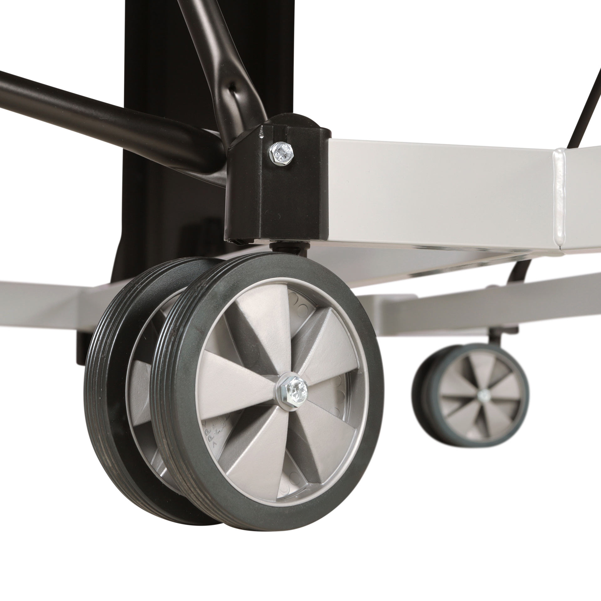 Ein weiteres Highlight der Tischtennisplatte ist die hochwertige Kippsicherung, die einen schnellen Auf- und Abbau ermöglicht, ein Umkippen der TT-Platte verhindert und das einseitige Umklappen der Platte für den Einzelbetrieb ermöglicht. Trotz der robusten Bauweise ist die TT-Platte sehr leicht, im aufgeklappten Zustand platzsparend und durch die hochwertigen gummierten Leichtlauf-Doppelrollen mit 128 mm Durchmesser auch auf unebenem Gelände mobil einsetzbar. Zum Lieferumfang gehören außerdem ein wetterfestes Tischtennisnetz in schwarzer Ausführung sowie seitlich angebrachte Schläger- und Ballhalter, die jeweils Platz für 2 Schläger und 9 Tischtennisbälle bieten.