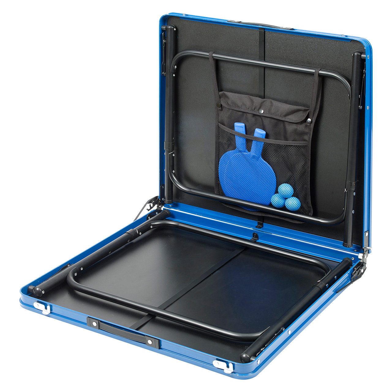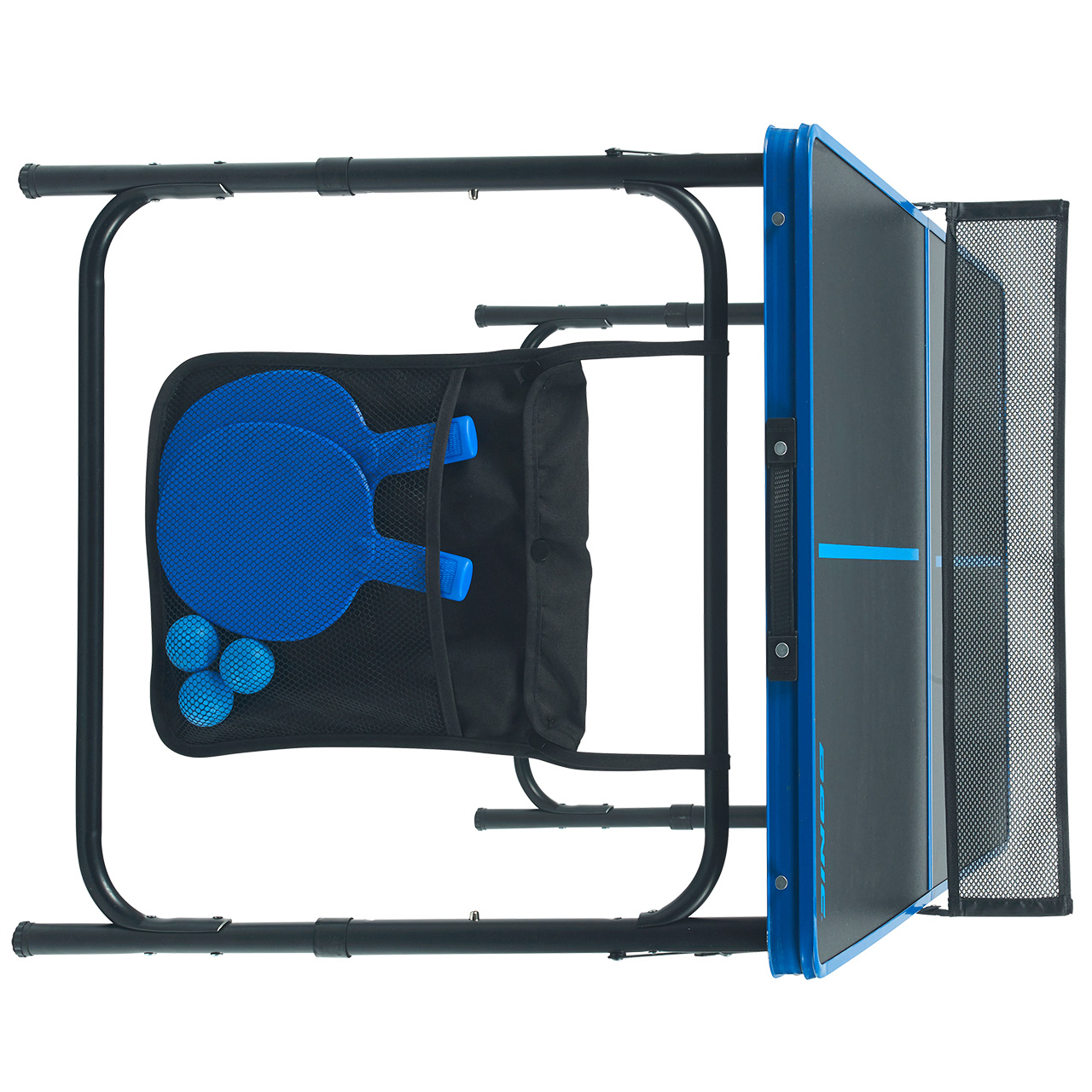 Ergänzt wird die umfangreiche Ausstattung der DONIC TT-Set Portable Pro durch ein mitgeliefertes Tischtennisnetz, dass schnell und einfach an den beiden Netzpfosten befestigt wird. Als besonderes Highlight liegen dem Set außerdem zwei blaue Outdoor-Tischtennisschläger und drei Trainingsbälle bei. Die mitgelieferte schwarze Tasche mit zwei großen Fächern wird an den Tischbeinen befestigt und bietet ausreichend Schutz und Stauraum für samtliche Accessoires.