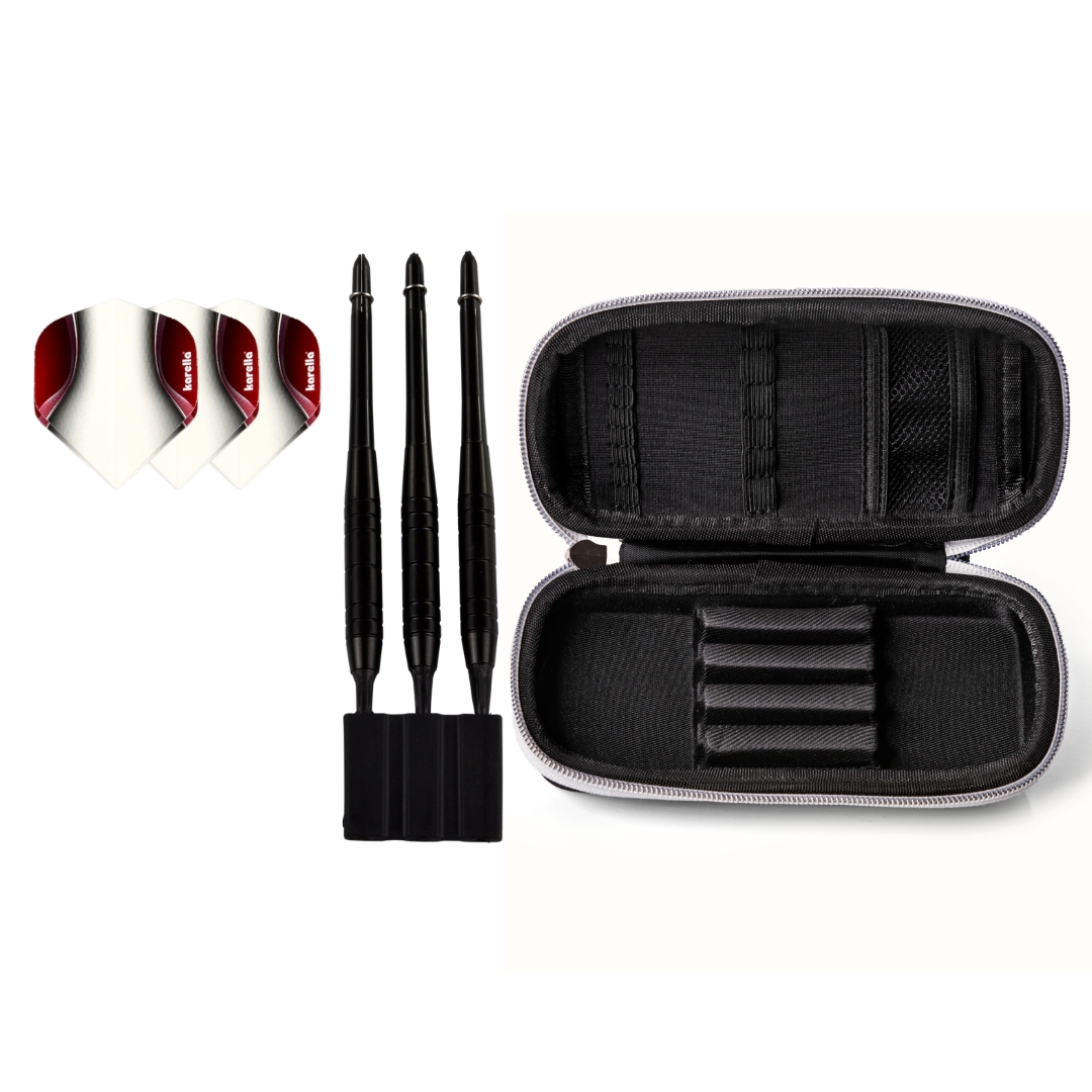 Hochwertiges Karella Dartset inklusive Darttasche. Das Set beinhaltet die hochgelobten Karella Blackstar Darts inklusive dem attraktiven Karella Dartcase schwarz. Preiswertes, attraktives Kombiset für jeden Dart-Fan als Soft und Steelvariante erhältlich. Ideal auch als Geschenk. Maße Case: 18 × 8 × 4 cm.
