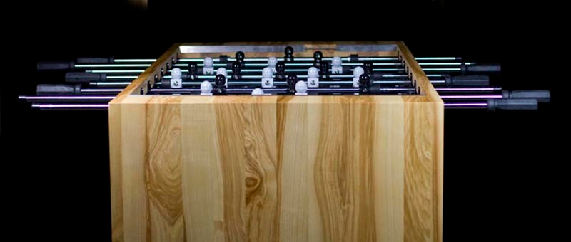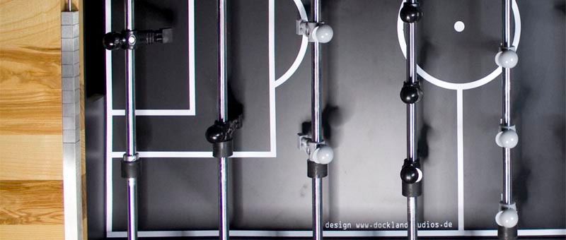 Der Designkicker Dockland von den Docklandstudios ist ein absolut einmaliger Kickertisch. Durch die hochwertigen Anbauteile der Fa. Leonhart wird ein Spielverhalten wie bei den üblichen Turniertischen gewährt. Durch das besondere Design passend für die Wohnung oder auch den Turnierraum. Die verwendete Holzart kann auf Wunsch geändert werden. Zur Auswahl stehen nahezu alle möglichen Holzarten. Während Esche zum Standardpreis geliefert wird, fällt für Ahorn, Buche, Eiche sowie Nussbaum fällt ein Aufpreis an. Der Aufpreis anderer Holzarten ist vom Tagespreis abhängig, den wir für Sie gerne beim Hersteller anfragen würden.
