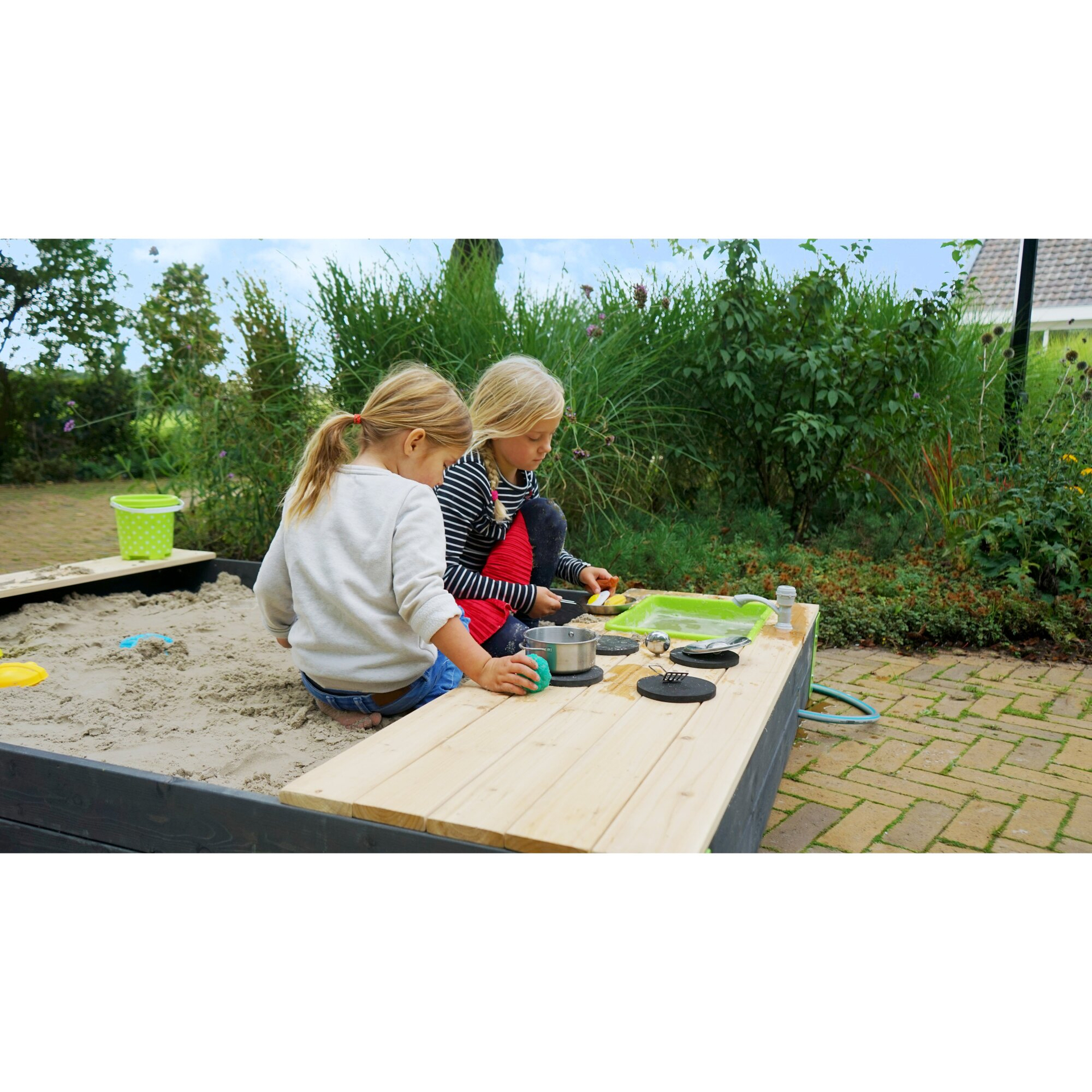 Der EXIT Aksent Holzsandkasten ist ein großer rechteckiger Sandkasten. Der Sandkasten ist mit einer Bank, Stauraum und Küche mit Küchenzubehör ausgestattet und bietet den Kindern garantiert viel Spaß.