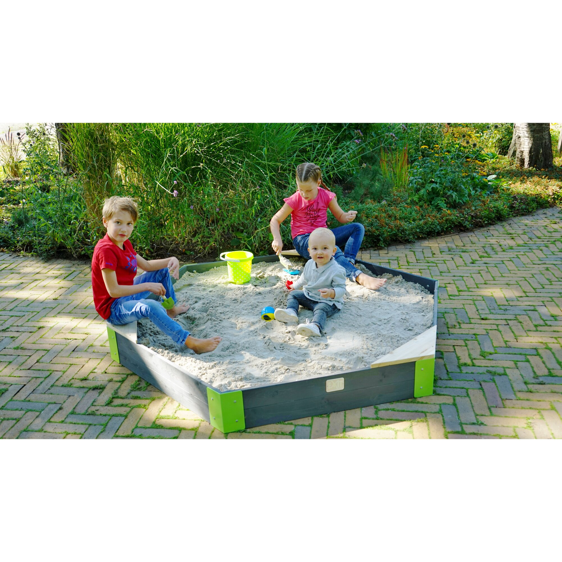 Der EXIT Aksent Holzsandkasten ist ein großer Sandkasten in Form eines Sechsecks. Der Sandkasten hat Sitze in drei Ecken, so dass du beim Spielen nicht ganz im Sand untergehst, aber vor allem bietet er genügend Platz, um gemeinsam mit deinen Freunden die schönsten Sandabenteuer zu erleben.