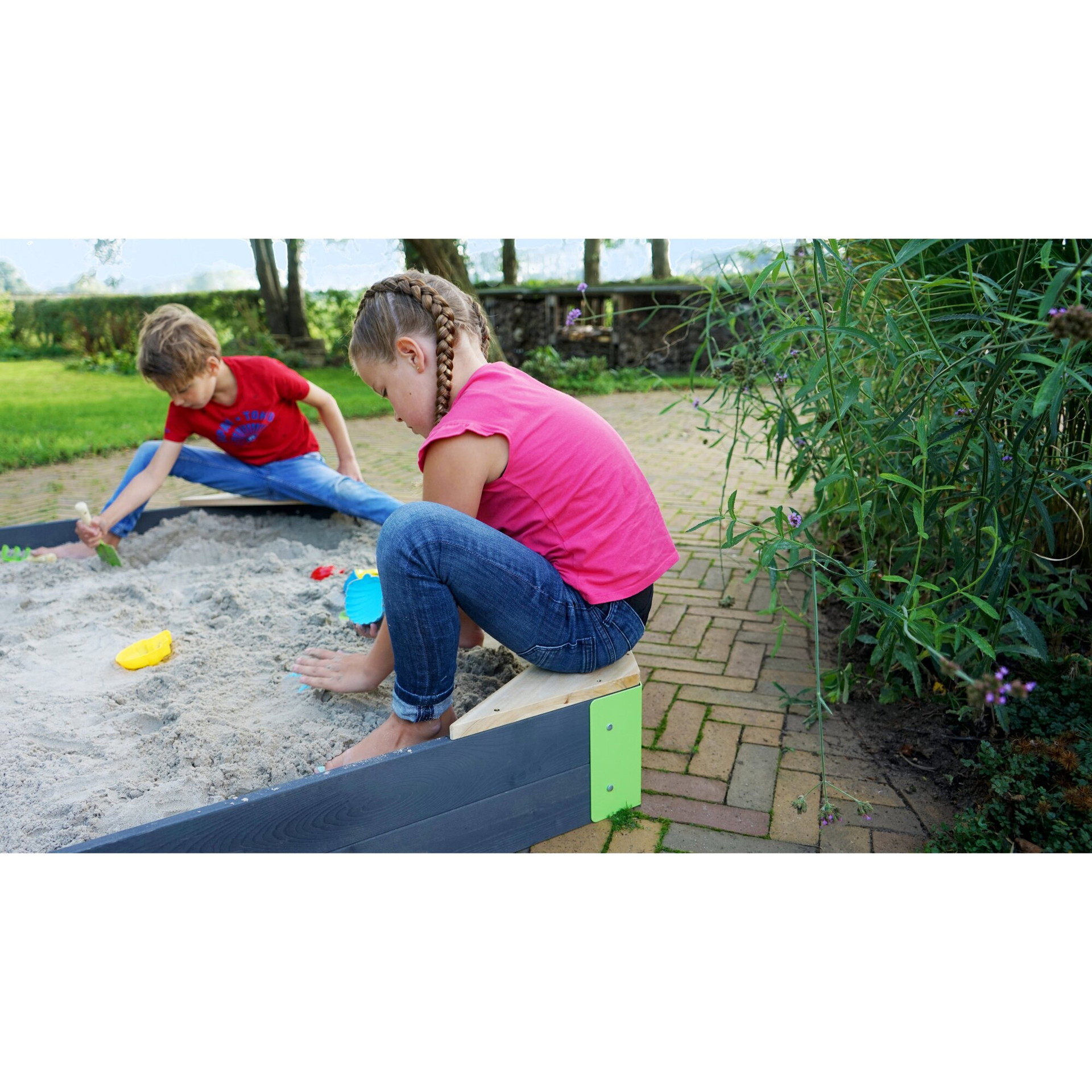 Die Aksent Holzsandkästen von EXIT Toys sind einfach zu montieren und super robust. Die vorgebohrten Bretter werden an Metallbeschlägen in den Ecken befestigt, was den Sandkasten stabil macht. Die Ecken sind markant grün und verleihen den Sandkästen in Kombination mit dem grauen Holz einen modernen Look.