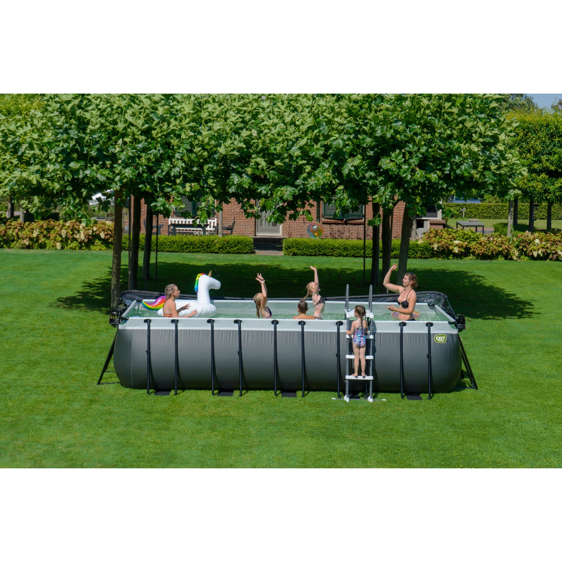 Mit dem Frame Pool in der Farbe grau kommt die perfekte Erfrischung für heiße Sommertage in Ihren Garten. Der stabile und hochwertige Rahmenpool der Firma Exit Toys überzeugt durch sein Rahmengestell aus galvanisierten Stahlrohren, deren schwarze Pulverbeschichtung das Material vor Rost schützt und das optische Erscheinungsbild abrundet. In Kombination mit den starken 3-lagigen Wänden aus PVC und Polyester ist der Pool sehr langlebig und witterungsbeständig. Damit sich für jeden Garten der passende Swimming Pool finden lässt, bietet Exit Toys den Pool in 13 verschiedenen Größen und einem eleganten grauen Steinmuster. Das moderne Design sorgt für einen Blickfang in jedem Garten und lädt ein in den Pool zu springen. Die Farbgestaltung des Inneren ist einem kräftigen Blauton gehalten, der für ein erfrischendes Schwimmbadgefühl sorgt. Für einen komfortablen Ein- sowie Ausstieg dient die mitgelieferte Treppe, die ebenso wie eine Filterpumpe zur Standardausstattung des Pools gehört. Dem Kunden werden zudem 2 technischen Umsetzungen der Filterpumpe zur Auswahl gestellt. Neben der Variante der Kartuschenfilterpumpe, wobei das Wasser durch eine Kartusche gepumpt und somit gereinigt wird, werden auch Modelle mit einer Sandfilteranlage angeboten. Angelehnt an die Natur wird das Wasser durch Sand gepumpt, der Verschmutzungen aus dem Wasser herausfiltert. Als besonderes Extra gibt es die Pools auch mit einem Sonnendach, das viele Vorteile mit sich bringt. Zum einen schützt es das Wasser vor Verschmutzungen durch Laub oder Ähnlichem. Zum anderen dient es als natürliche Heizung, die die Wärme der Sonnenstrahlen unter der Haube festhält. Die durchsichtige Haube ist undurchlässig für Wind und Regen, sodass der Pool auch an rauen Tagen genossen werden kann. Je nach Modell ist ein weiteres Extra erhältlich. Während für flache Pools ein passendes Sonnensegel zusätzlich erhältlich ist, besteht bei den tiefen Varianten die Möglichkeit eine Wärmepumpe dazu zu bestellen.