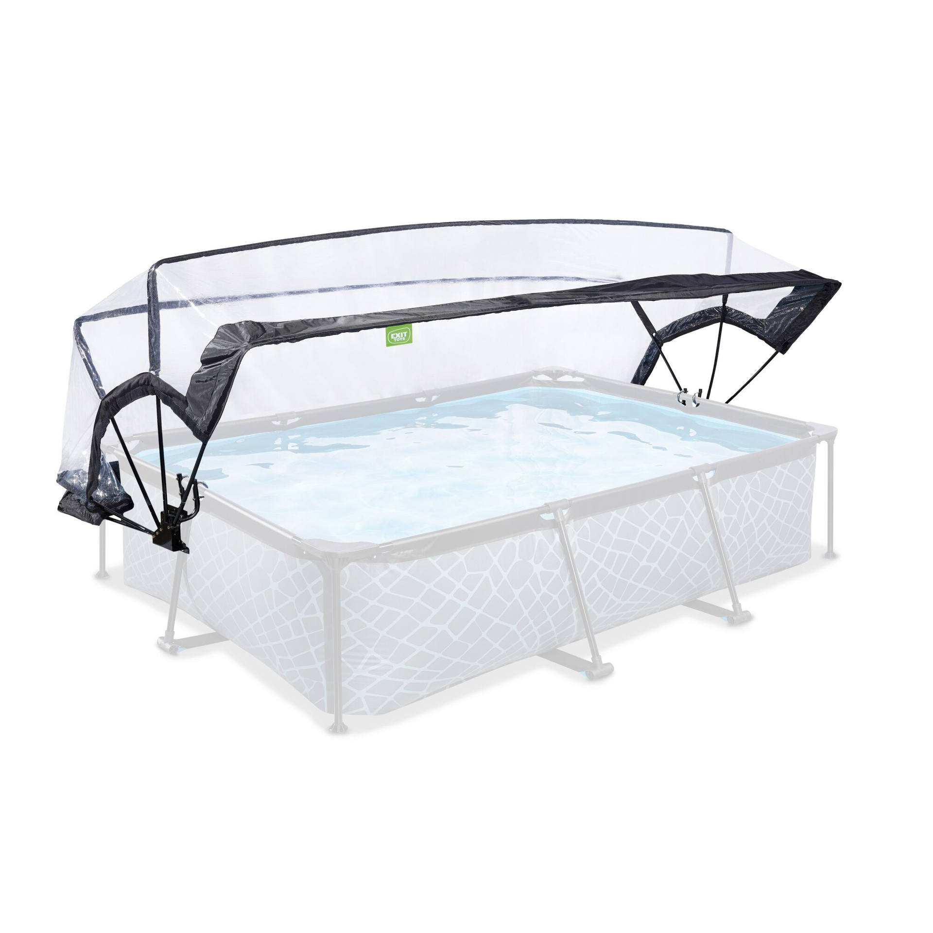 Das Exit Pool Sonnendach schützt Ihren Pool vor Schmutz von außen und allen Witterungseinflüssen. Die durchsichtige Plane aus langlebigem PVC bzw. Kunststoff wärmt durch die Sonneneinstrahlung zusätzlich das Wasser auf, sodass Sie jederzeit auch bei Regen oder Wind den Pool nutzen können. Das Sonnendach passt perfekt auf die rechteckigen und runden Pools von Exit. Das rechteckige Pooldach kann zudem mit einem Reißverschluss vorn geöffnet werden. Ebenso kann das Dach auch nur teilweise geöffnet werden, sodass Wind abgehalten wird und der Pool trotzdem gut nutzbar ist. Der Schmutz wird durch das Dach vom Wasser abgehalten, sodass Sie keine zusätzliche Abdeckplane benötigen und führt so zur Steigerung der Lebensdauer des Pools sowie der Wasserqualität.