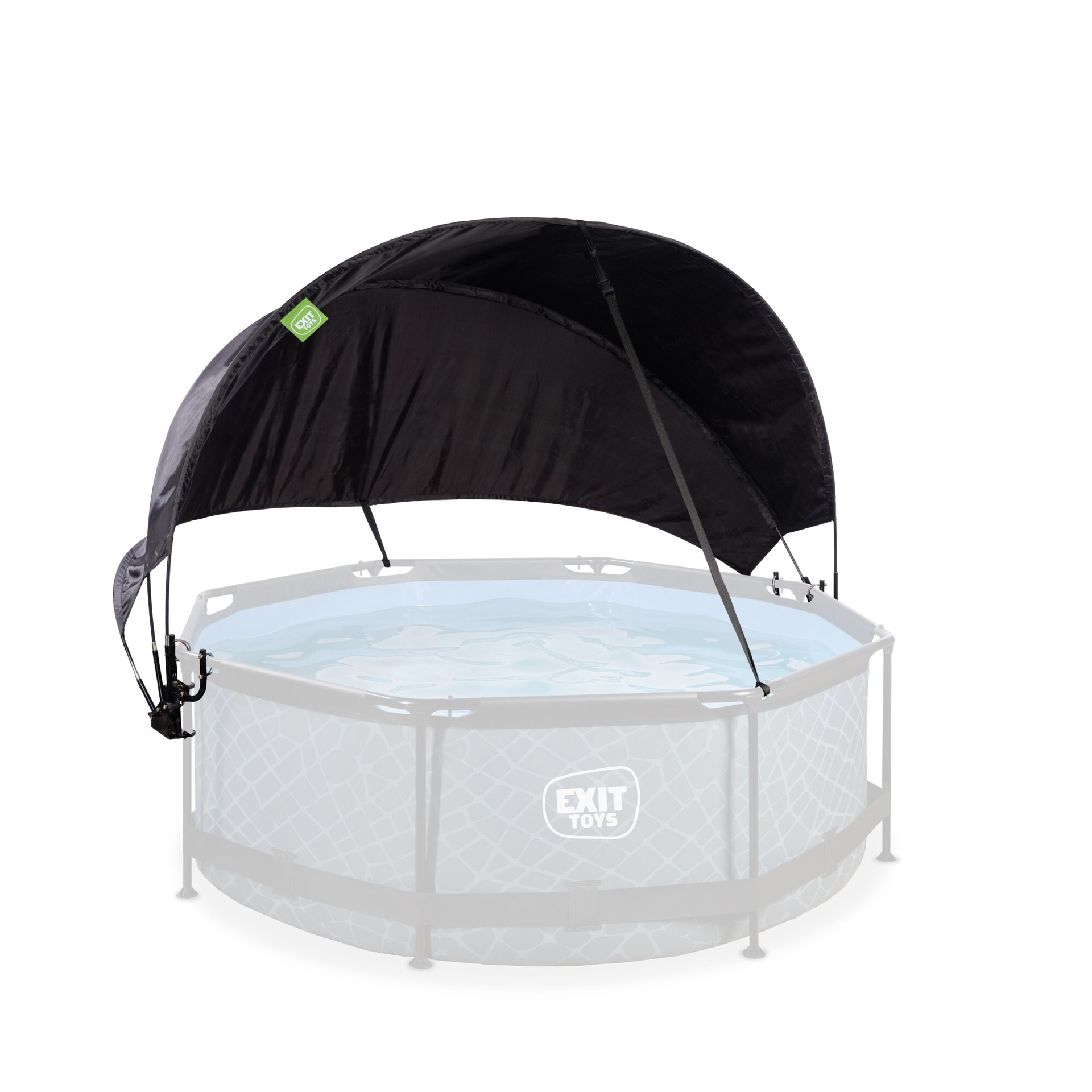 An heißen Sommertagen bietet das kühle Nass im Exit Swimmingpool für eine trügerische Sicherheit. Auch wenn der Körper gut gekühlt ist, zeigen die Sonnenstrahlen ihre Wirkung. Aus diesem Grund empfiehlt es sich ein Sonnensegel am Swimmingpool anzubringen. Die Firma Exit Toys bietet hier die optimale Erweiterung zum Pool. Das schwarze Sonnensegel ist in 5 Varianten, passend für die Swimmingpools der Größe 220 x 150 cm, 300 x 200 cm, ø 244 cm, ø 300 cm oder ø 360 cm. Je nach Sonnenstand lässt sich der schwarze Sonnenschutz öffnen oder schließe und bietet somit den optimalen Schutz. Komplett geschloßen dient das Sonnensegel als natürliche Heizung für den Pool. Zur Verstellung werden Gurte am Segel befestigt, was für eine sehr einfach Handhabbarkeit sorgt. Das Sonnensegel kann auch in Kombination mit dem transparenten Sonnendach verwendet werden.