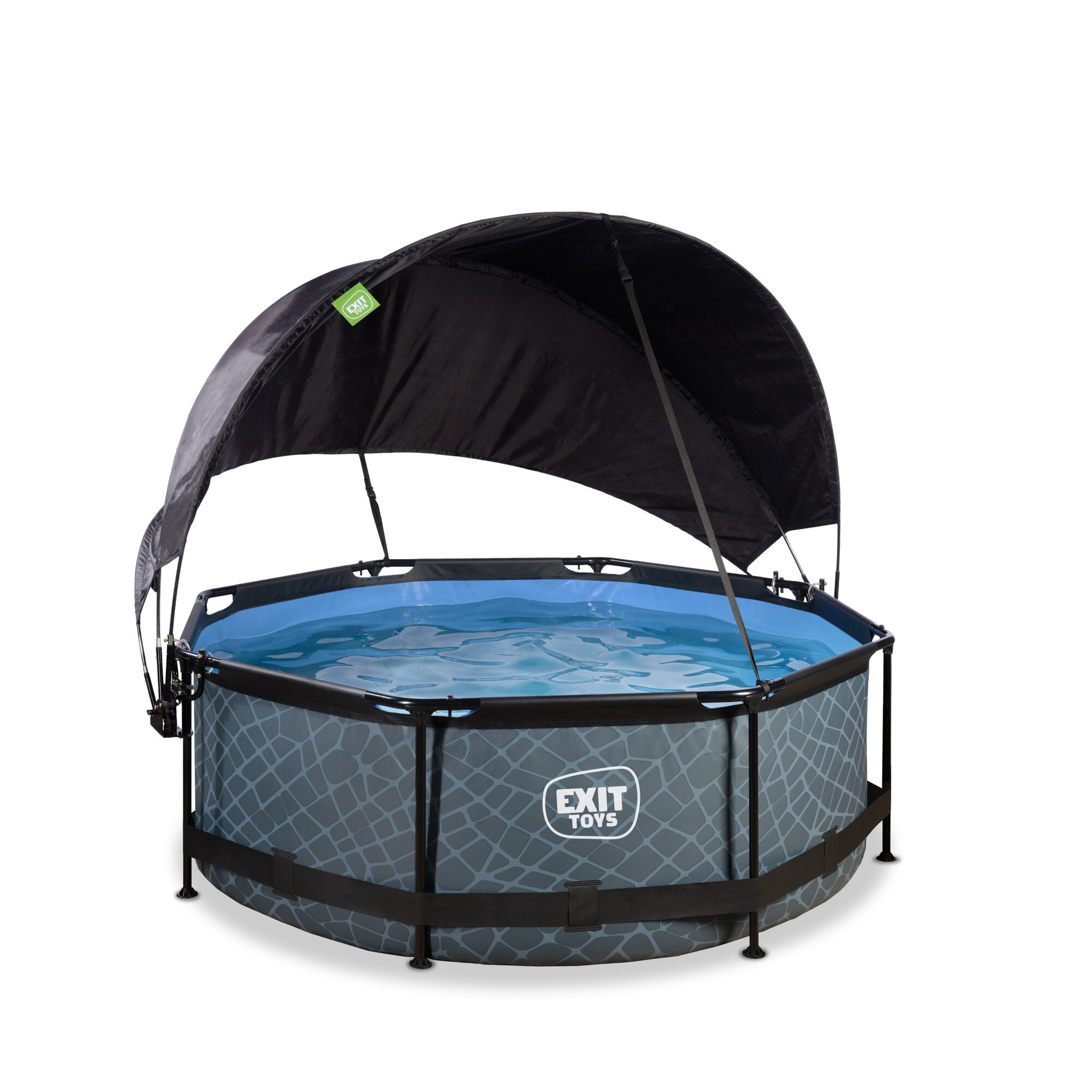 Mit dem Frame Pool in der Farbe grau kommt die perfekte Erfrischung für heiße Sommertage in Ihren Garten. Der stabile und hochwertige Rahmenpool der Firma Exit Toys überzeugt durch sein Rahmengestell aus galvanisierten Stahlrohren, deren schwarze Pulverbeschichtung das Material vor Rost schützt und das optische Erscheinungsbild abrundet. In Kombination mit den starken 3-lagigen Wänden aus PVC und Polyester ist der Pool sehr langlebig und witterungsbeständig. Damit sich für jeden Garten der passende Swimming Pool finden lässt, bietet Exit Toys den Pool in 13 verschiedenen Größen und einem eleganten grauen Steinmuster. Das moderne Design sorgt für einen Blickfang in jedem Garten und lädt ein in den Pool zu springen. Die Farbgestaltung des Inneren ist einem kräftigen Blauton gehalten, der für ein erfrischendes Schwimmbadgefühl sorgt. Für einen komfortablen Ein- sowie Ausstieg dient die mitgelieferte Treppe, die ebenso wie eine Filterpumpe zur Standardausstattung des Pools gehört. Dem Kunden werden zudem 2 technischen Umsetzungen der Filterpumpe zur Auswahl gestellt. Neben der Variante der Kartuschenfilterpumpe, wobei das Wasser durch eine Kartusche gepumpt und somit gereinigt wird, werden auch Modelle mit einer Sandfilteranlage angeboten. Angelehnt an die Natur wird das Wasser durch Sand gepumpt, der Verschmutzungen aus dem Wasser herausfiltert. Als besonderes Extra gibt es die Pools auch mit einem Sonnendach, das viele Vorteile mit sich bringt. Zum einen schützt es das Wasser vor Verschmutzungen durch Laub oder Ähnlichem. Zum anderen dient es als natürliche Heizung, die die Wärme der Sonnenstrahlen unter der Haube festhält. Die durchsichtige Haube ist undurchlässig für Wind und Regen, sodass der Pool auch an rauen Tagen genossen werden kann. Je nach Modell ist ein weiteres Extra erhältlich. Während für flache Pools ein passendes Sonnensegel zusätzlich erhältlich ist, besteht bei den tiefen Varianten die Möglichkeit eine Wärmepumpe dazu zu bestellen.