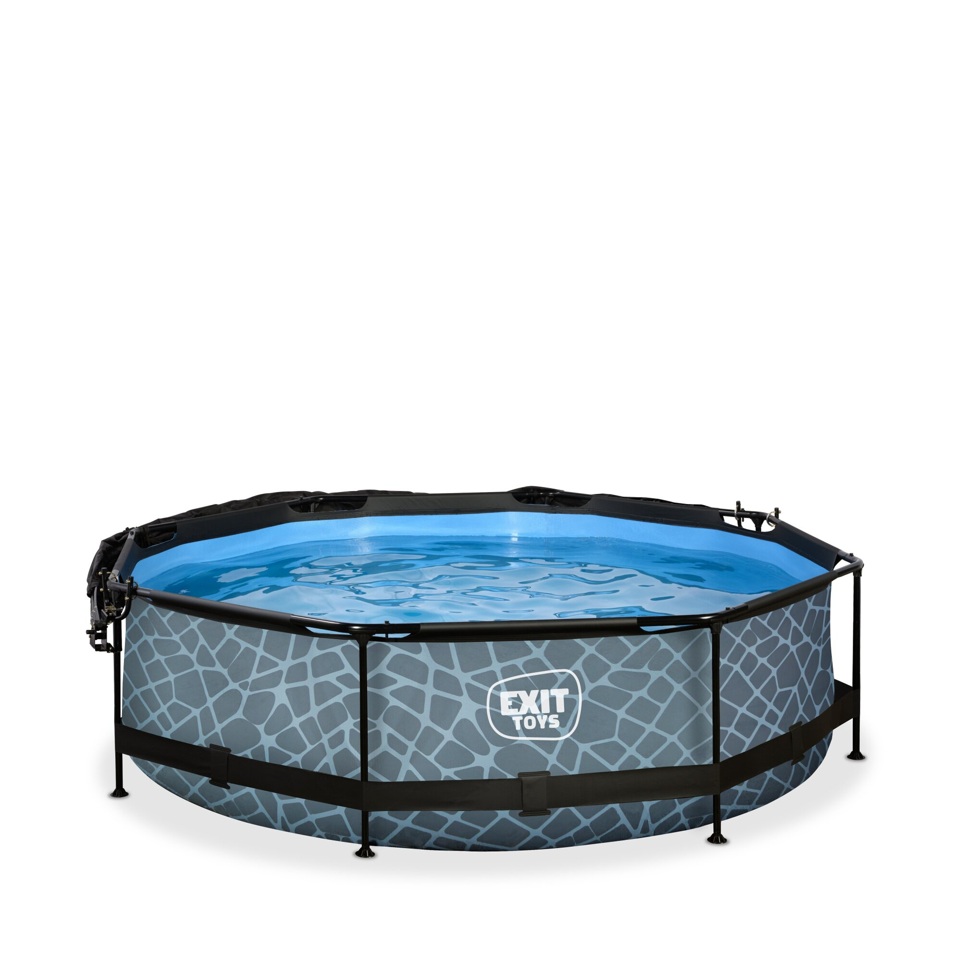 Mit dem Frame Pool in der Farbe grau kommt die perfekte Erfrischung für heiße Sommertage in Ihren Garten. Der stabile und hochwertige Rahmenpool der Firma Exit Toys überzeugt durch sein Rahmengestell aus galvanisierten Stahlrohren, deren schwarze Pulverbeschichtung das Material vor Rost schützt und das optische Erscheinungsbild abrundet. In Kombination mit den starken 3-lagigen Wänden aus PVC und Polyester ist der Pool sehr langlebig und witterungsbeständig. Damit sich für jeden Garten der passende Swimming Pool finden lässt, bietet Exit Toys den Pool in 13 verschiedenen Größen und einem eleganten grauen Steinmuster. Das moderne Design sorgt für einen Blickfang in jedem Garten und lädt ein in den Pool zu springen. Die Farbgestaltung des Inneren ist einem kräftigen Blauton gehalten, der für ein erfrischendes Schwimmbadgefühl sorgt. Für einen komfortablen Ein- sowie Ausstieg dient die mitgelieferte Treppe, die ebenso wie eine Filterpumpe zur Standardausstattung des Pools gehört. Dem Kunden werden zudem 2 technischen Umsetzungen der Filterpumpe zur Auswahl gestellt. Neben der Variante der Kartuschenfilterpumpe, wobei das Wasser durch eine Kartusche gepumpt und somit gereinigt wird, werden auch Modelle mit einer Sandfilteranlage angeboten. Angelehnt an die Natur wird das Wasser durch Sand gepumpt, der Verschmutzungen aus dem Wasser herausfiltert. Als besonderes Extra gibt es die Pools auch mit einem Sonnendach, das viele Vorteile mit sich bringt. Zum einen schützt es das Wasser vor Verschmutzungen durch Laub oder Ähnlichem. Zum anderen dient es als natürliche Heizung, die die Wärme der Sonnenstrahlen unter der Haube festhält. Die durchsichtige Haube ist undurchlässig für Wind und Regen, sodass der Pool auch an rauen Tagen genossen werden kann. Je nach Modell ist ein weiteres Extra erhältlich. Während für flache Pools ein passendes Sonnensegel zusätzlich erhältlich ist, besteht bei den tiefen Varianten die Möglichkeit eine Wärmepumpe dazu zu bestellen.