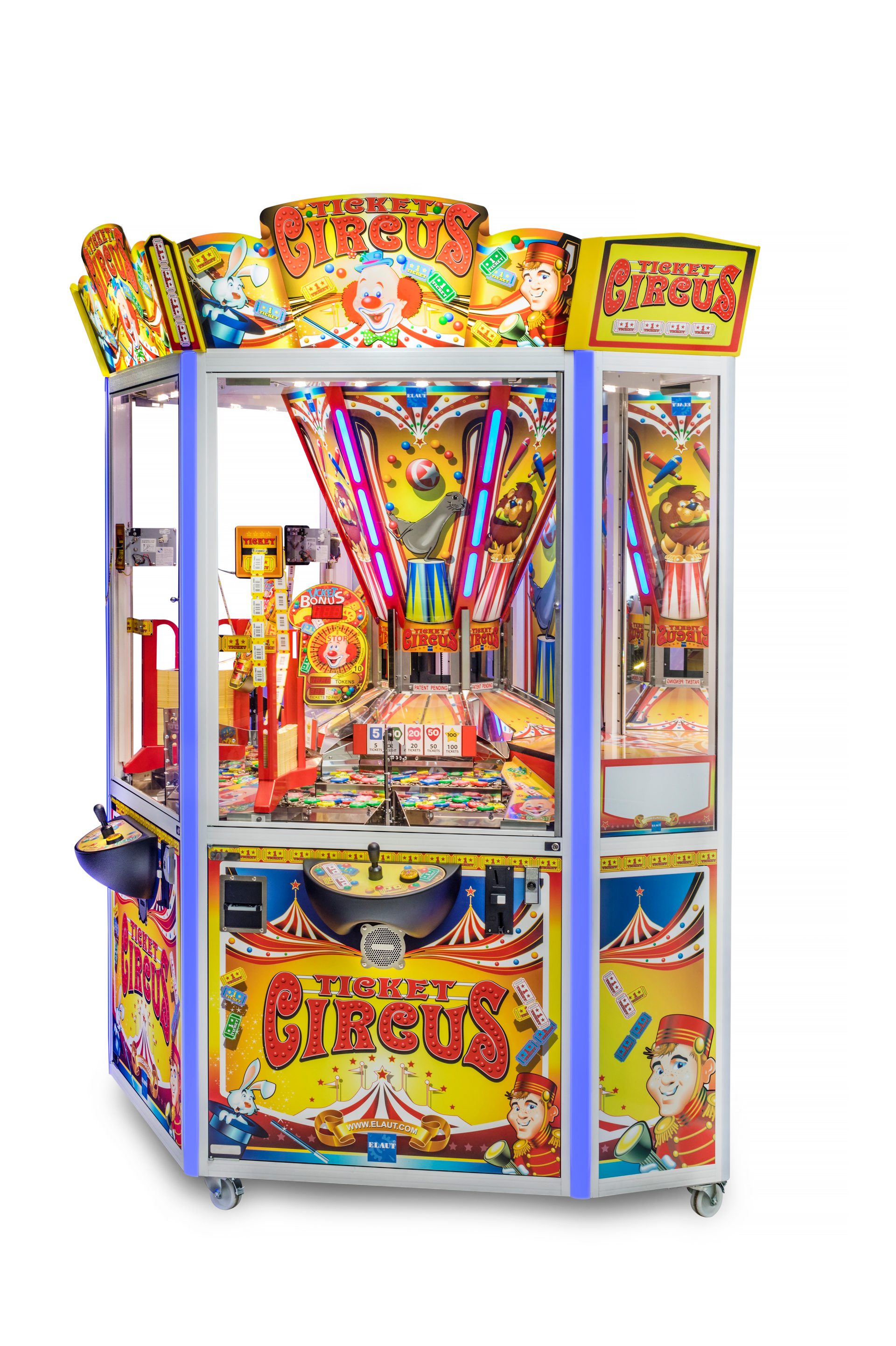 Der Coin Pusher Ticket Circus von Elaut ist ein leistungsstarker Automat, mit farbwechselnden LED's und Platz für bis zu drei Spieler gleichzeitig. Im Gegensatz zu klassischen Münzschieber-Geräten werden hier Chips bzw. Token verwendet, die im Gerät verbleiben und werden bei Erfolg gegen Tickets eingetauscht. Mit dem geschlossenen Spielsystem, hoher Zuverlässigkeit und beeindruckender Optik, ist er die perfekte Wahl für Betreiber, die nach einem langlebigen und gewinnbringenden Ticket-Game suchen.