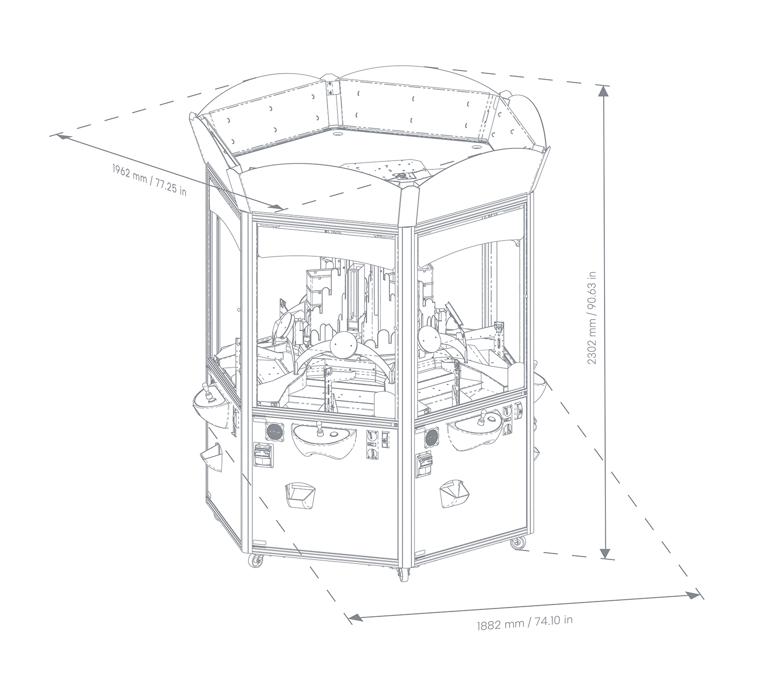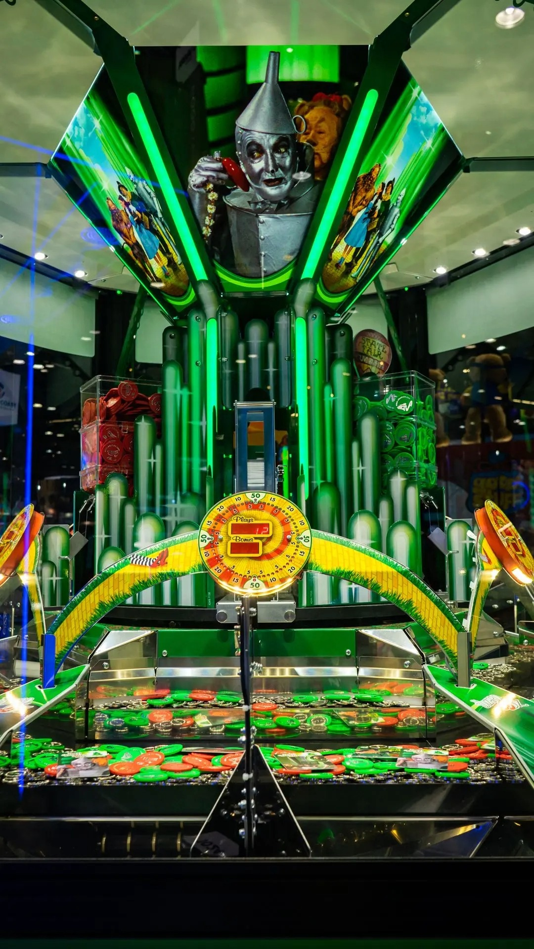 Der Coin Pusher mit Wizard of Oz design ist ein großer Spielautomat für 6 Spieler mit robustem Korpus, farbwechselnder Front und lustigen Geräuschen, was ihm zu einem echten Publikumsmagneten macht. Die Spieler können ihr Glück herausfordern, indem sie versuchen, die Münzen auf dem Spielfeld zum Auszahlungsschlitz zu schieben. Der Automat bietet mehrere Funktionen, wie LED-Beleuchtung an allen Seiten und ein hochwertiges Soundsystem. Eignet sich außerdem für das Solospiel und Mehrspiel ,als einfaches und intuitives Gameplay für Anfänger und Erfahrene Spieler, deshalb ideal für Spielhallen und Unterhaltungszentren. Beim Coin Pusher kann außerdem der Schwierigkeitsgrad programmiert werden .
