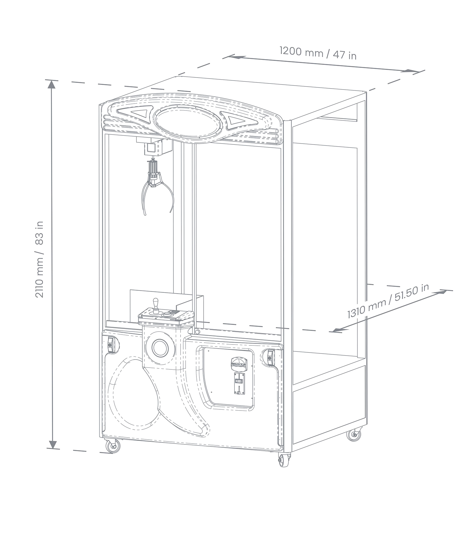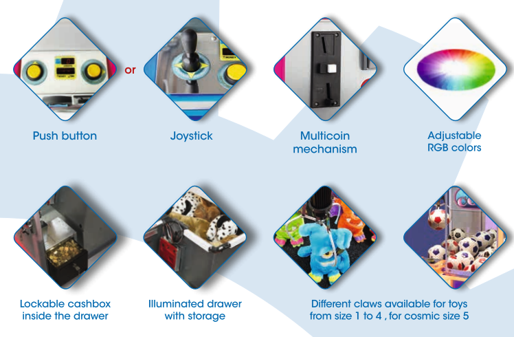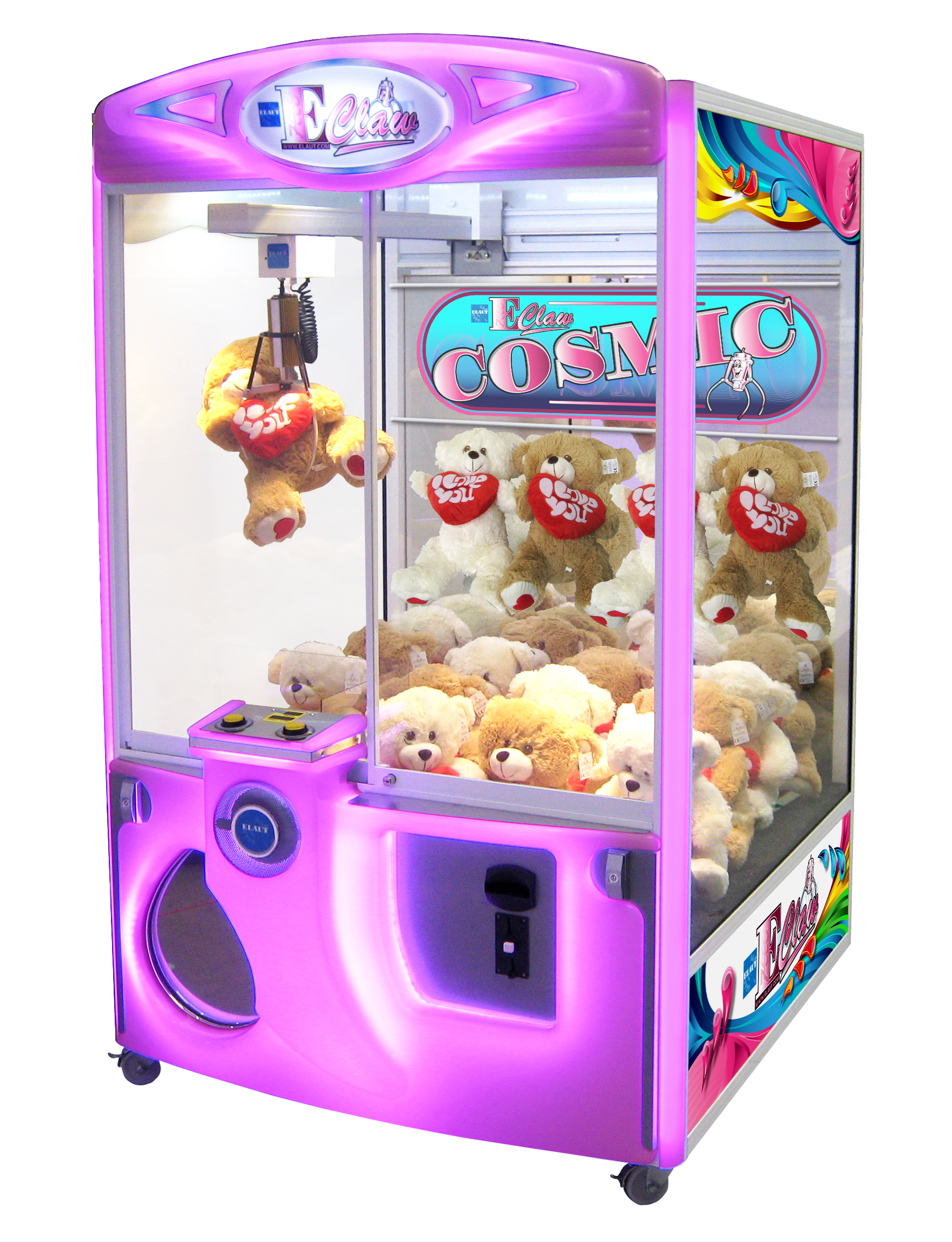 Der E-Claw Cosmic, ist ein größerer Greifautomat mit robustem Korpus, farbwechselnder Front und Soundeffekten, was ihm zu einem echten Publikumsmagneten macht. Der Automat bietet mehrere Funktionen, wie LED-Beleuchtung an allen Seiten und ein hochwertiges Soundsystem. Vorteilhaft kann der E-Claw Cosmic mit größeren Preisen wie Fußbällen befüllt werden. Eignet sich für das Solospiel, einfaches und intuitives Gameplay für Kinder und deshalb ideal für Spielhallen und Unterhaltungszentren. Beim E-Claw Cosmic kann außerdem der Schwierigkeitsgrad mit einem mitgelieferten Messgerät einstellt werden.