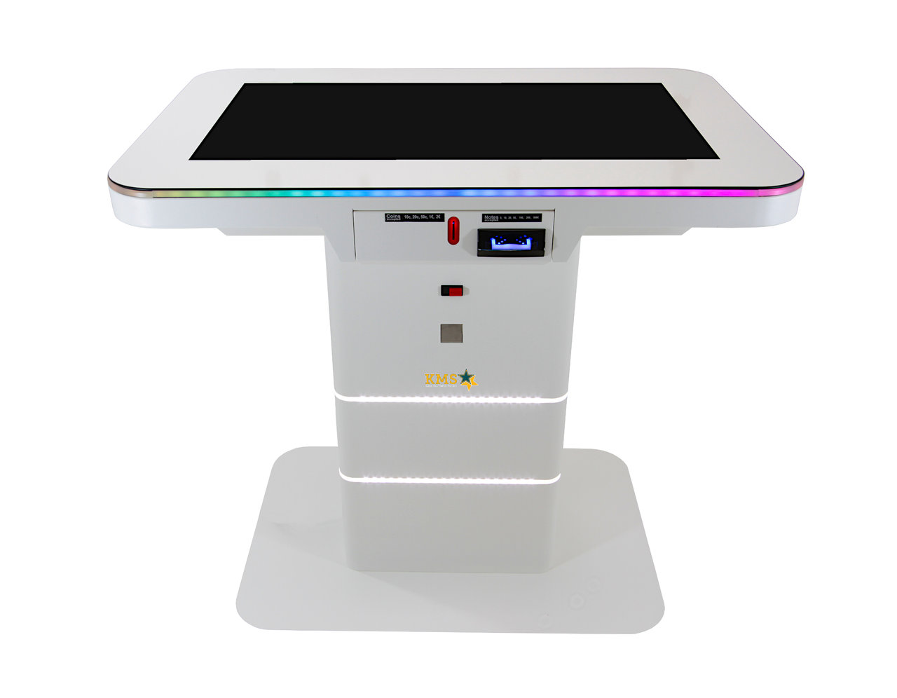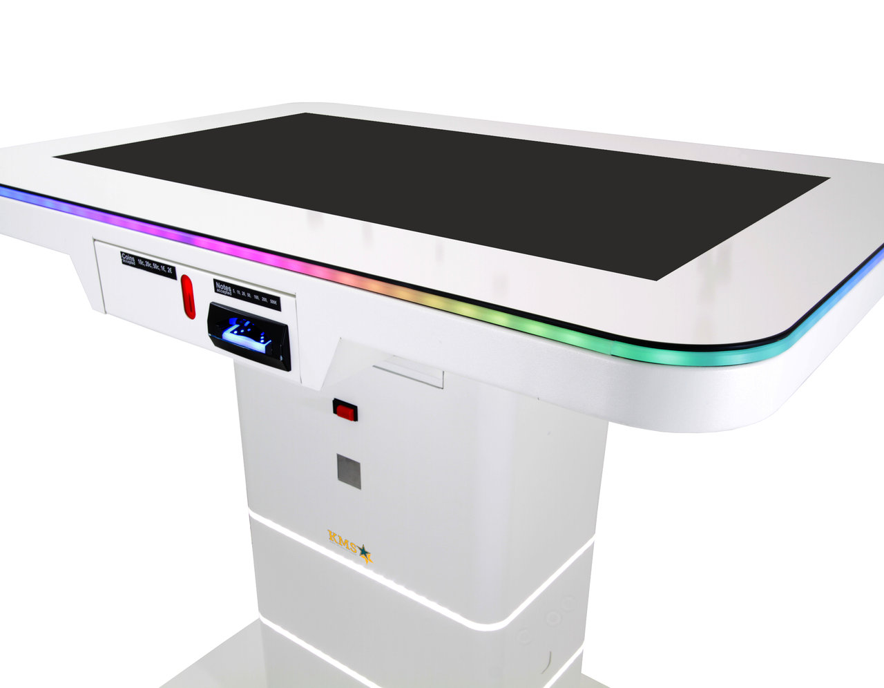 Sie möchten einen Touchscreen Spieltisch kaufen? Der elektronische Spieltisch Fun4Four EVO überzeugt durch sein einzigartiges Konzept. Er ist weltweit der erste digitale Videospieltisch für den Einsatz an öffentlich zugänglichen Orten. Randvoll mit bahnbrechenden Innovationen und unterhaltsamen Spielen ist der Tisch ein Highlight in allen Bars, Clubs, Shisha Bars oder Jugendzentren. Für den gemeinsamen Spaß bietet der Tisch viele interaktive Spiele für bis zu 6 Spieler gleichzeitig. Um die Bedürfnisse der Spieler erfüllen zu können, ist der Fun4Four mit einem 43 Zoll großen Touchscreen ausgestattet, auf dem mehr als 90 verschiedene Spiele zur Verfügung stehen. Der digitale Spieltisch setzt durch ein LED Band unterhalb der Touchscheibe optische Highlights, das passend zu den Anforderungen höhenverstellt werden kann. Erhältlich ist der Tisch in den Farben schwarz, weiß und goldgelb. Ab einer Abnahmemenge von 20 Stück kann auch eine beliebige RAL Farbe gewählt werden. Neben dem eleganten und schlichten Design verbergen sich im Inneren weitere interessante Extras. In dem Videospieltisch wird Technik verbaut, die es dem Spieler ermöglicht, sich per Smartphone mit dem Tisch zu verbinden um verschiedene Spiele über das Handy zu spielen (OTM erforderlich). Des weiteren lässt der digitale Multifunktionstisch im Turniermodus die Spieler lokale Ranglisten angreifen. Zusätzlich gibt es das Online Terminal Management, das für einen geringen monatlichen Aufpreis zur Verfügung steht. Durch den Service wird der Tisch automatisch aktualisiert und ist somit stets auf dem neusten Stand. Der Fun4Four Spieltisch ist ein echter Kundenmagnet von dem man sich nur schwer losreißen kann. Zum standardmäßigen Münzprüfer ist der Spieltisch auch immer mit einem Banknotenprüfer ausgestattet, dieser verleitet zu mehr Spielen. Neben diesen Prüfern besteht die Option eines Kreditkartenlesegerät, wobei allerdings ein seperater Vertrag mit dem Kreditkartenanbieter benötigt wird.