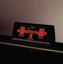 Der Metallbügel über dem Spielfeld ist mit einem doppelten Display mit digitalem Zählwerk und Neonbeleuchtung ausgestattet. Verschiedene Spielvarianten sind einstellbar.