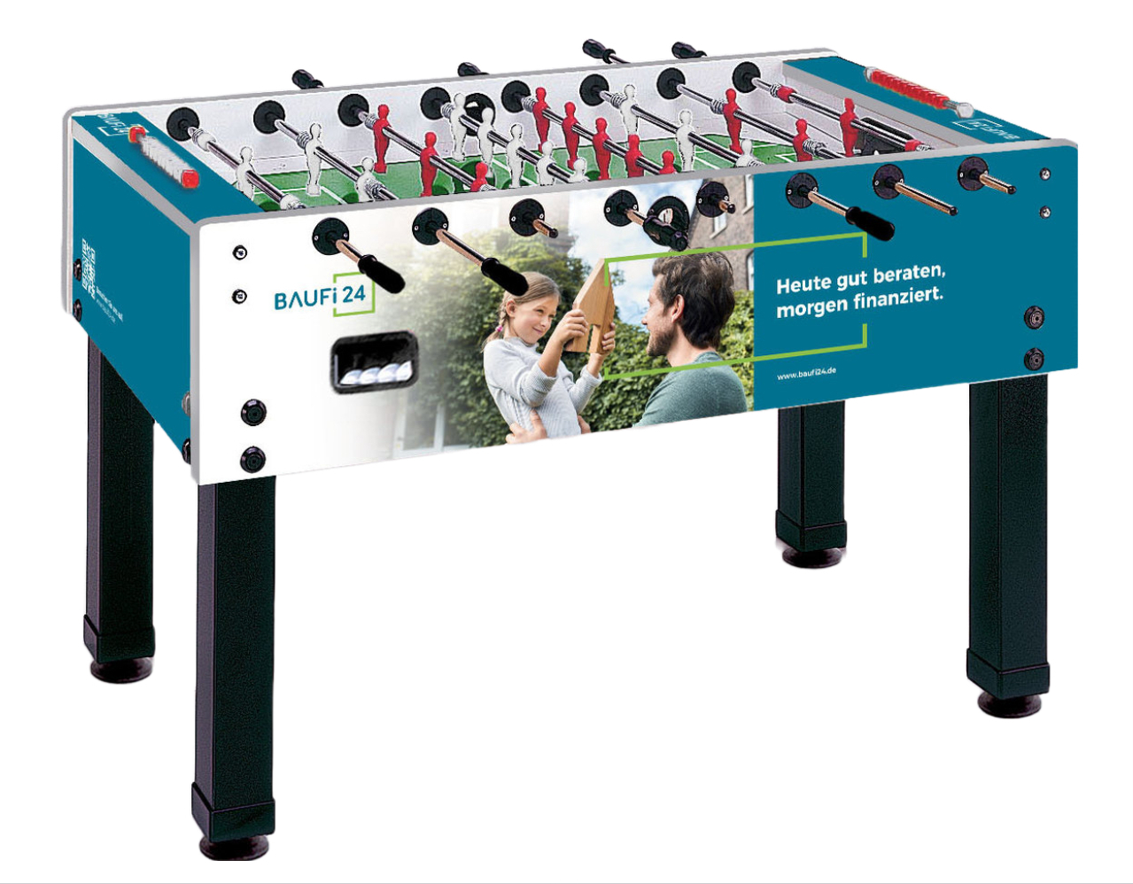 Der Preis beinhaltet einen Foliendruck auf den 6 Außenseiten des Kickertisches, sowie die Druckdatenprüfung und das Datenhandling. Optional verfügbar: