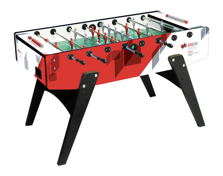 Der Preis beinhaltet einen Foliendruck auf den 6 Außenseiten des Kickertisches, sowie die Druckdatenprüfung und das Datenhandling. Optional verfügbar: