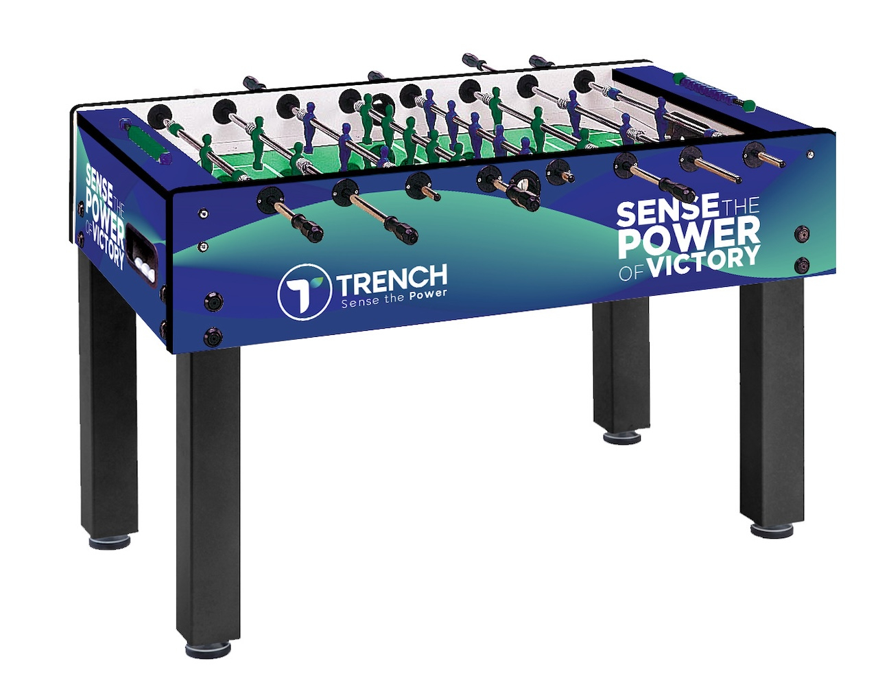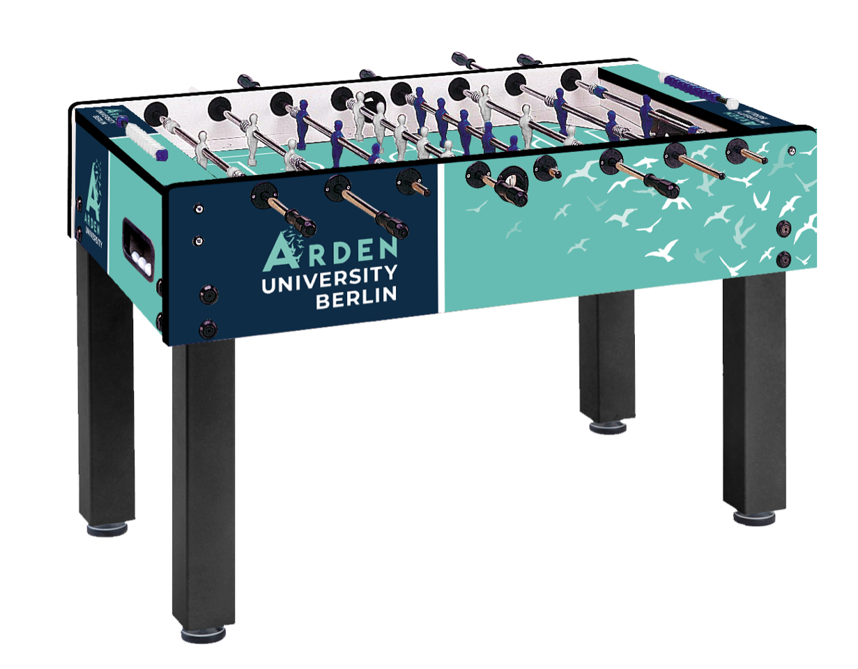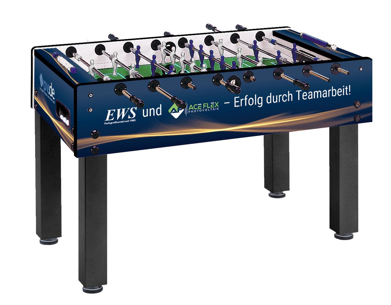 Der Preis beinhaltet einen Foliendruck auf den 6 Außenseiten des Kickertisches, sowie die Druckdatenprüfung und das Datenhandling. Optional verfügbar: