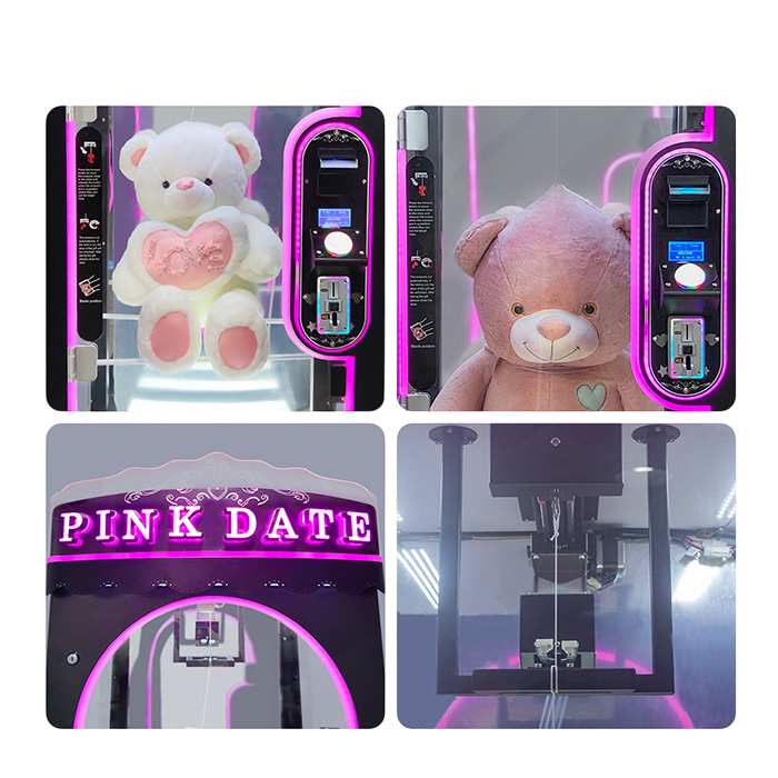 Einfach eine Münze einwerfen, den Knopf betätigen und im richtigen Moment loslassen, sodass die Schneideeinheit das Seil durchschneidet, an dem der Gewinn hängt. Sobald das Kuscheltier (nicht enthalten) auf den Boden fällt, kann die Tür geöffnet und der Gewinn entnommen werden. An dem Greifautomat Pink Date kann nur gespielt werden, wenn auch ein Gewinn am Seil hängt.