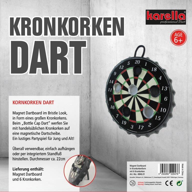 Das Karella Kronkorken Dart eignet sich auch hervorragend für den Einsatz als Promotionartikel. Das Dartboard und die Kronkorken können mit einem individuellen Logo bedruckt werden. Mindestabnahme 500 st.