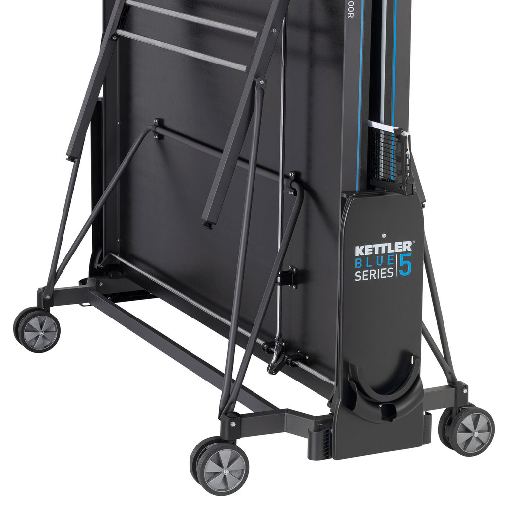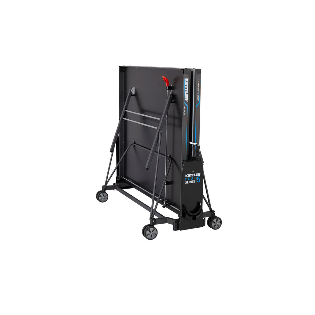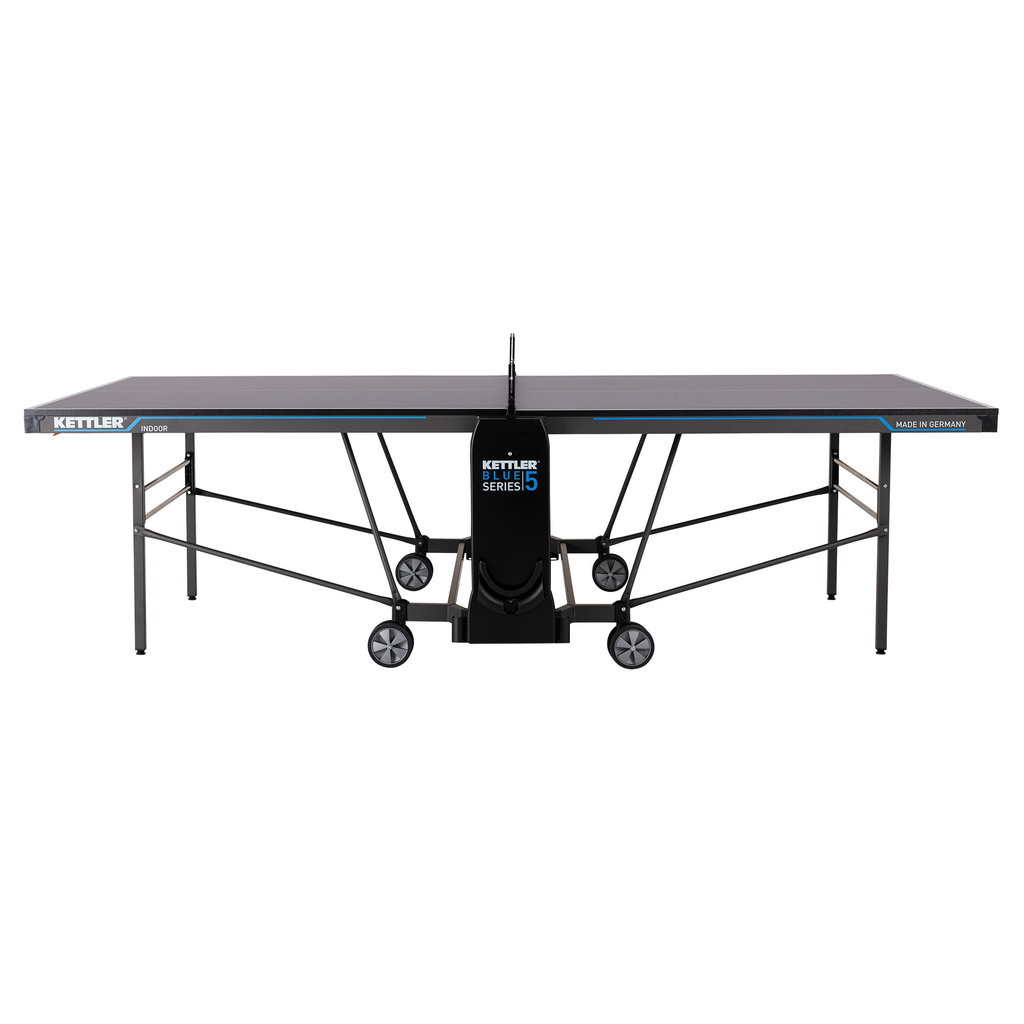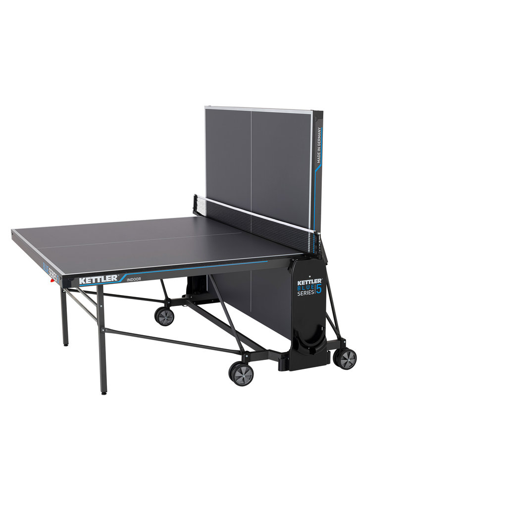 Auf der Suche nach qualitativ hochwertigen Tischtennisplatten stolpert man zwangsläufig über die Produkte der Firma Kettler. Das Top-Modell der Tische für geschlossene Räume ist die Kettler K5 Indoor. Der Tisch ist mit einer 19 mm starken Spezialholzplatte ausgestattet, auf der die blendfrei beschichtete Spielfläche aufgetragen ist. Umrandet ist die Platte von einem 50 mm hohen Profilrahmen. Auf dem Tisch befindet sich die mitgelieferte Netzgarnitur. Unterhalb der Netzhalter ist jeweils eine Verkleidung befestigt, die als Verstaumöglichkeit für Schläger und Bälle. Die sehr stabile Unterkonstruktion aus Stahlrohren wird getragen von 4 lenkbaren Doppelrädern. Im Unterbau ist ein praktischer Klappmechanismus integriert, der durch Einhandverriegelung sehr leicht handzuhaben ist. Um den Tisch an unebene Böden anpassen zu können, wird er mit höhenverstellbaren Tischbeinen ausgeliefert. Durch die hohe Qualität des Tischtennistischs eignet er sich perfekt für anspruchsvolle Freizeit- und Profispieler.