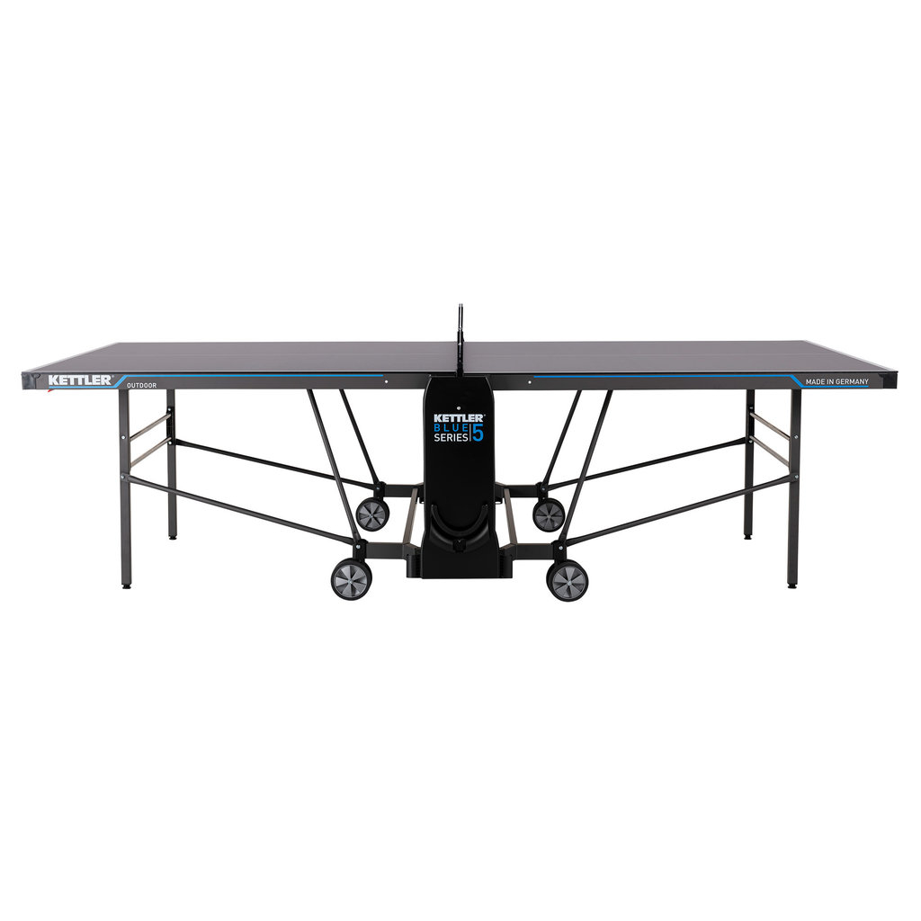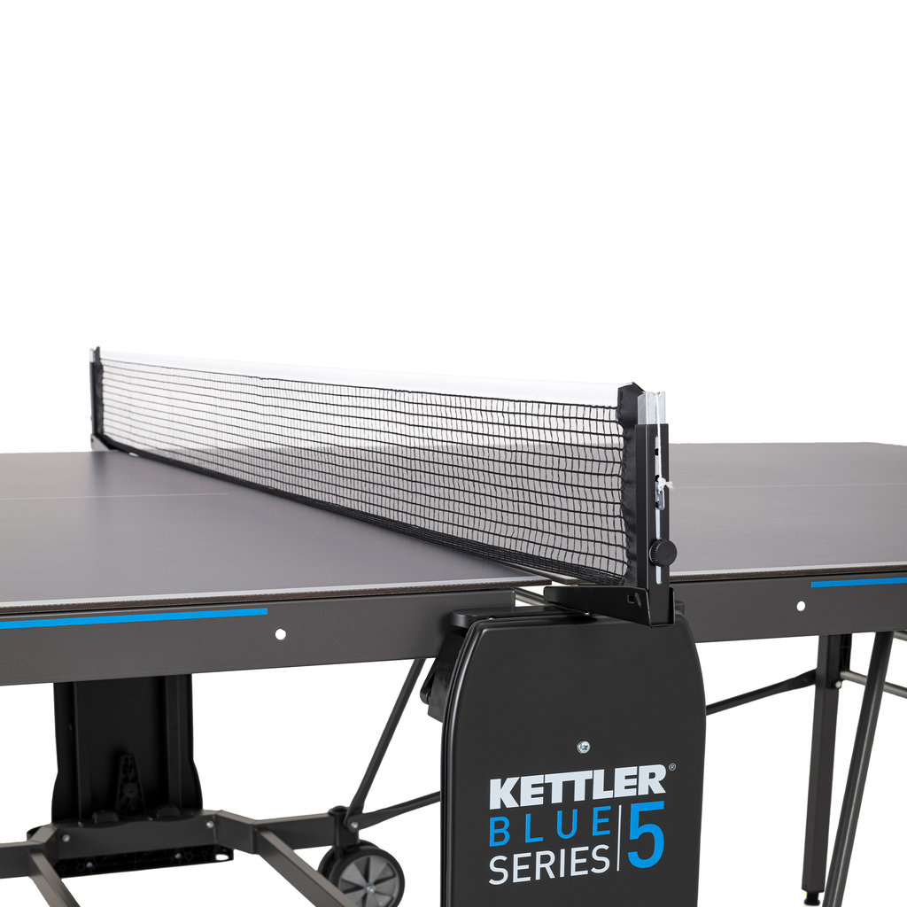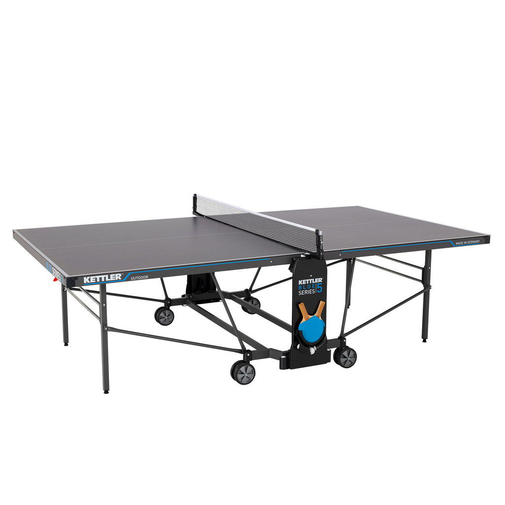 Auf der Suche nach qualitativ hochwertigen Tischtennisplatten stolpert man zwangsläufig über die Produkte der Firma Kettler. Einer der besten Tische für die Anwendung im Freien ist die Kettler K5 Outdoor Tischtennisplatte. Der Tisch ist mit einer wetterfesten 5 mm starken mehrfach beschichteten Melaminharzplatte ausgestattet. Als besonderes Extra verfügt das Spielfeld über eine spezielle kratzfeste Overlay-Beschichtung. Umrandet ist die Platte von einem 50 mm hohen Profilrahmen. Wurde das mitgelieferte Netz befestigt, kann der Spielspaß auch schon beginnen. Unterhalb der Netzhalter ist jeweils eine Verkleidung befestigt, die als Verstaumöglichkeit für Bälle und Schläger dient. Im Unterbau ist ein praktischer einhand Klappmechanismus integriert, durch den man den Tisch zum eigenständigem Training einseitig hochklappen kann. Die sehr stabile Unterkonstruktion aus Stahlrohren wird getragen von 4 lenkbaren Doppelrädern.