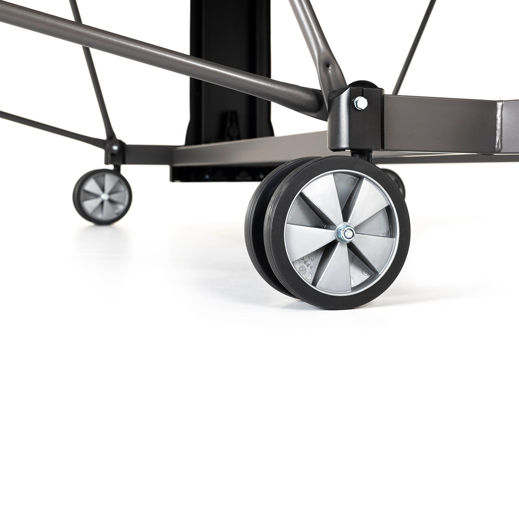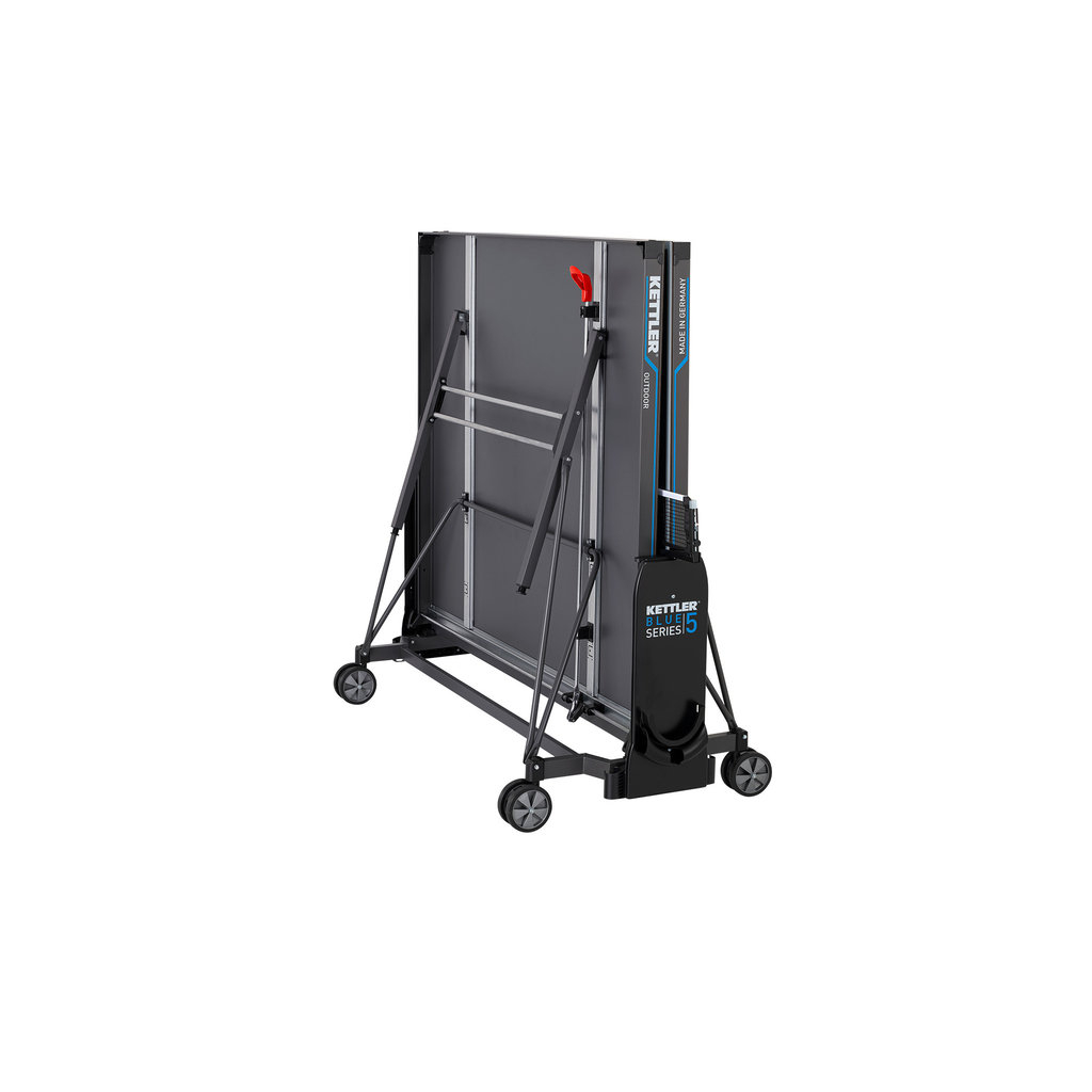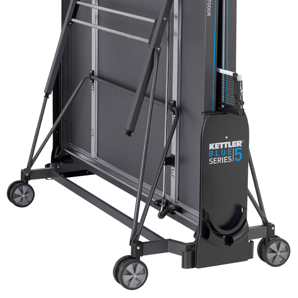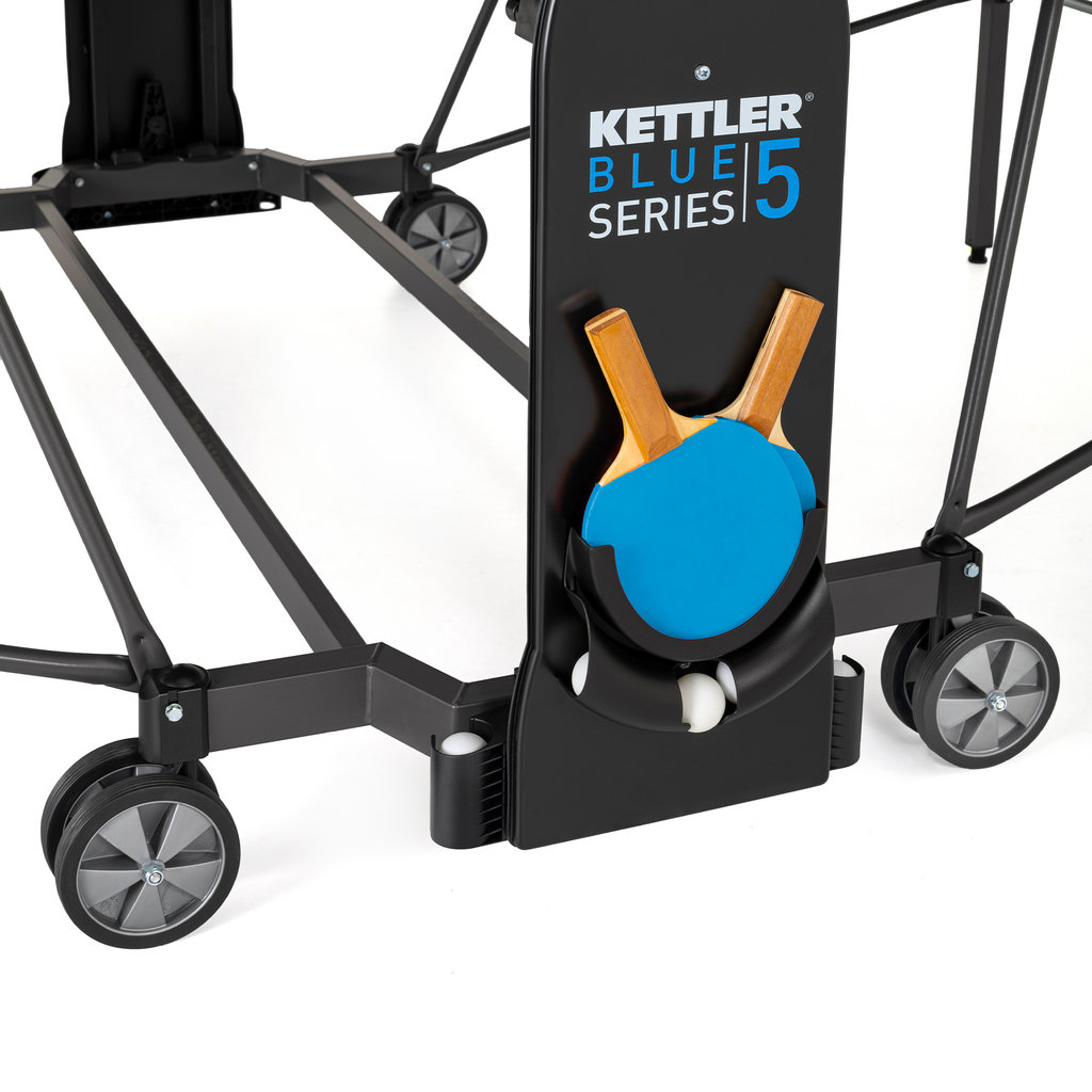 Auf der Suche nach qualitativ hochwertigen Tischtennisplatten stolpert man zwangsläufig über die Produkte der Firma Kettler. Einer der besten Tische für die Anwendung im Freien ist die Kettler K5 Outdoor Tischtennisplatte. Der Tisch ist mit einer wetterfesten 5 mm starken mehrfach beschichteten Melaminharzplatte ausgestattet. Als besonderes Extra verfügt das Spielfeld über eine spezielle kratzfeste Overlay-Beschichtung. Umrandet ist die Platte von einem 50 mm hohen Profilrahmen. Wurde das mitgelieferte Netz befestigt, kann der Spielspaß auch schon beginnen. Unterhalb der Netzhalter ist jeweils eine Verkleidung befestigt, die als Verstaumöglichkeit für Bälle und Schläger dient. Im Unterbau ist ein praktischer einhand Klappmechanismus integriert, durch den man den Tisch zum eigenständigem Training einseitig hochklappen kann. Die sehr stabile Unterkonstruktion aus Stahlrohren wird getragen von 4 lenkbaren Doppelrädern.