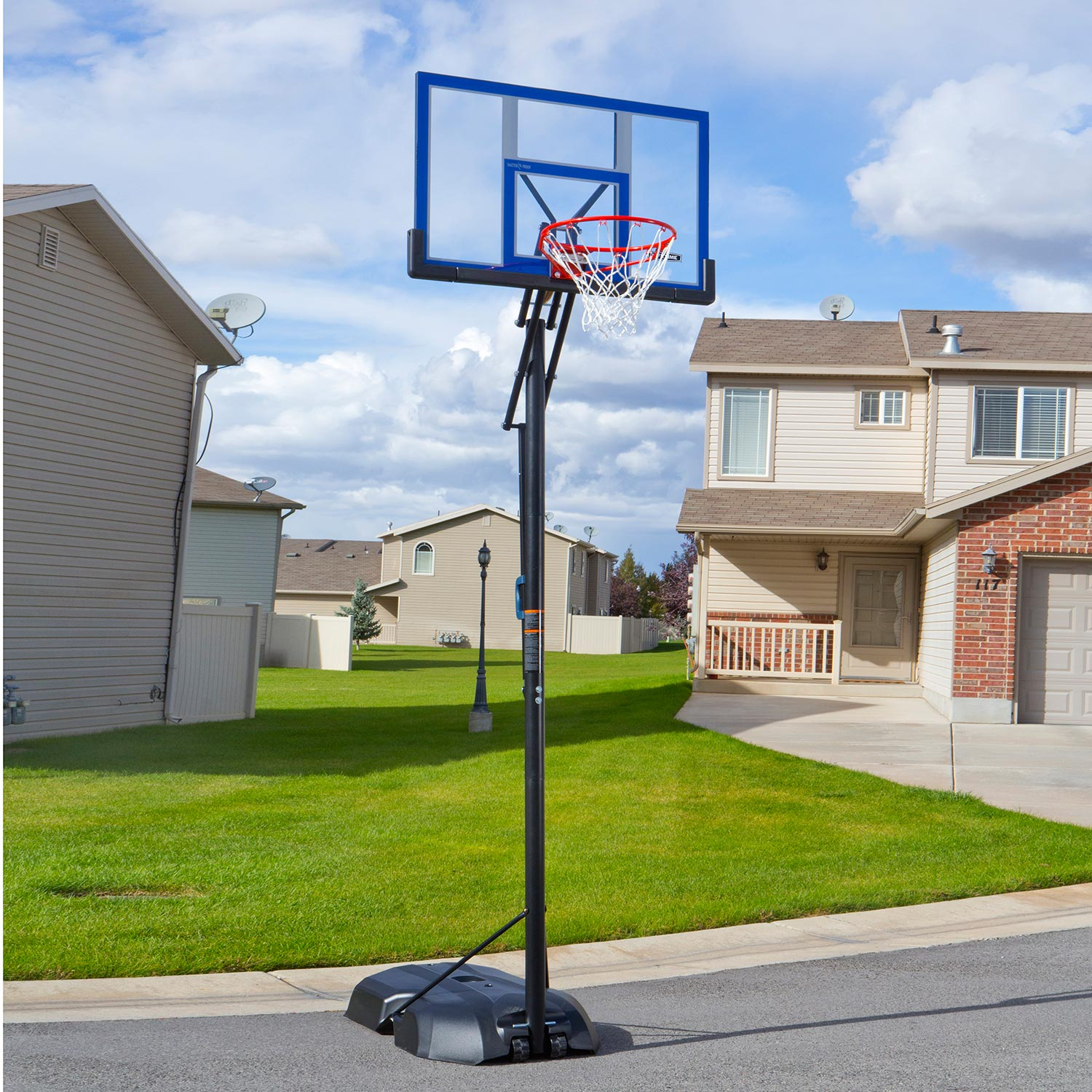 Die Lifetime Power Dunk Basketballanlage ist wie der Name verrät mit einem Dunking-Korb ausgestattet. Dieser ist mit einer Doppelfederung versehen, welche dafür sorgt, dass der Korb in seine Ausgangslage zurrückkehrt. Der füllbare Fuß ist mit Transportrollen zur leichteren Bewegung der Anlage ausgestattet. Die Höhe des Korbes ist mit Hilfe einer Schnellspannvorrichtung geändert werden. Einstellbare Höhen zwischen 2,44m und 3,04m (Stufen von 15,24cm). Der strapazierfähige Ring ist aus Stahl gefertigt. Das Netz ist aus Nylon. Zur Innen- und Außennutzung geeignet. Das haltbare Brett ist transparent und wetterfest.