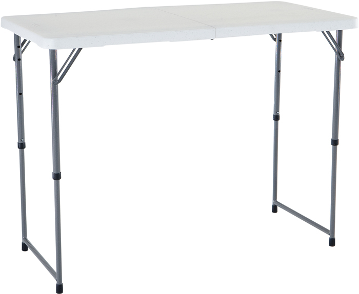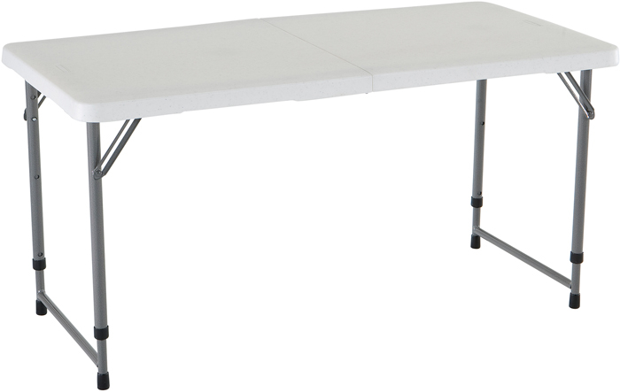 Verstellbarer und faltbarer Tisch!Leichtes DesignAufgebaut 122 x 61 x 91 cmGeklappt 61 x 61 x 7,6 cmDicke der Tischplatte 38 mmDurchmesser des Gestells 25 mmGewicht 8,5 kgFarbe Weißer Granit.