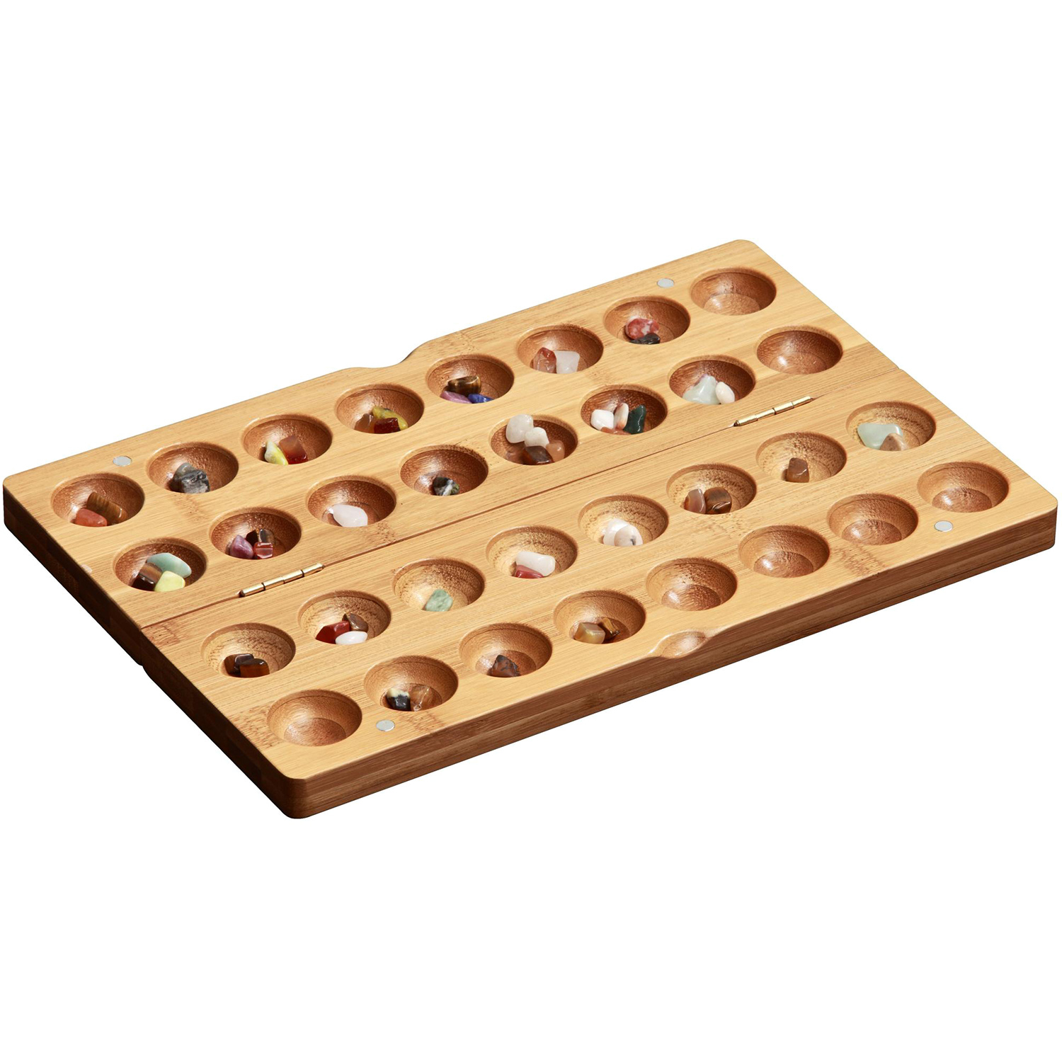 Faltbare KassetteBambusholz 295 x 192 x 16mmSuperior Version von KalahaEchte SteineMagnetverschlussFortgeschrittenes Alter ab 6 Jahren.