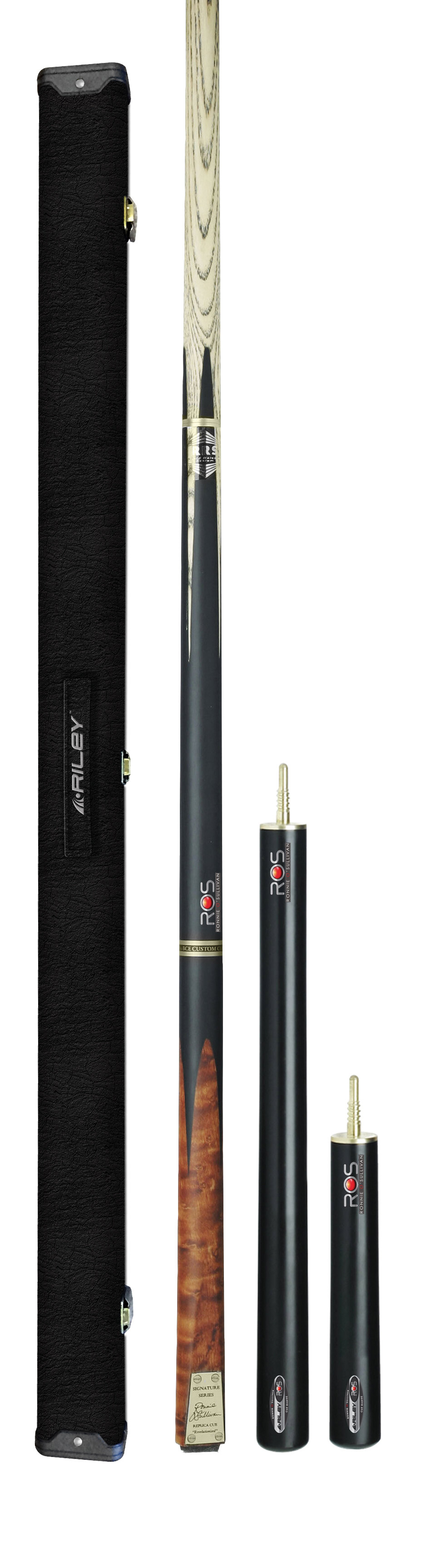 Der Weltmeister Ronnie O’Sullivan. Einer der weltbesten Snookerspieler hat mit dem Modell RS-2 ein wunderschönes Snookerqueue mitentwicklt und daher auch mit seiner Signatur versehen. Das Modell RS-2 lässt selbst für den Profispieler keine Wünsche offen. Der Queue ist nicht exakt mittig geteilt sondern zu 5/8. Dabei ist das Oberteil ca. 20cm länger als das Unterteil. Das ist speziell für die Spieler, die eine lange Gleitphase und somit ein längeres Oberteil bevorzugen. Als Gewinde (Joint) wurde die Variante Rapid-Joint (Schnellverschluss) verarbeitet. Als Klebeleder wurde das ElkMaster in 10mm verwendet, mit dem auch Ronnie selbst am liebsten spielt. Im Unterteil sind echte Splices-Einlagen und ein sehr schönes Vogelaugenahorndesign. Am Butcap befindet sich ein Messingplättchen, das mit der original Signatur von Ronnie O’Sullivan versehen ist. Die Verlängerungen von ca. 15 und 30cm sind für alle Anforderungen ausreichend. Das Luxus-Profi-Set beinhaltet einen passenden Koffer, der das 4-tlg. Set sicher aufbewahren und transportieren lässt.