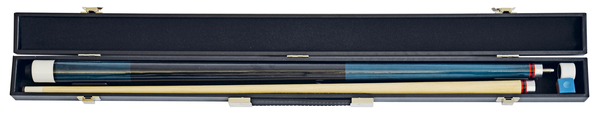 Ideales Einsteiger-Set für den Newcomer. 2-teiliges Poolqueue aus ausgesuchtem Hartholz mit 12 mm Spitze. Das blaue Unterteil ist mit einem passenden schwarz lackierten Griffbereich versehen. Inklusive hochwertigem Koffer. Damit alles dabei ist was man zum Spielen braucht, ist ein Stück Master Profikreide sowie ein Lederaufrauher bereits beigepackt. Unser TIP: Tolles Komplett-Set – unschlagbar preiswert. Queuelänge 147 cm