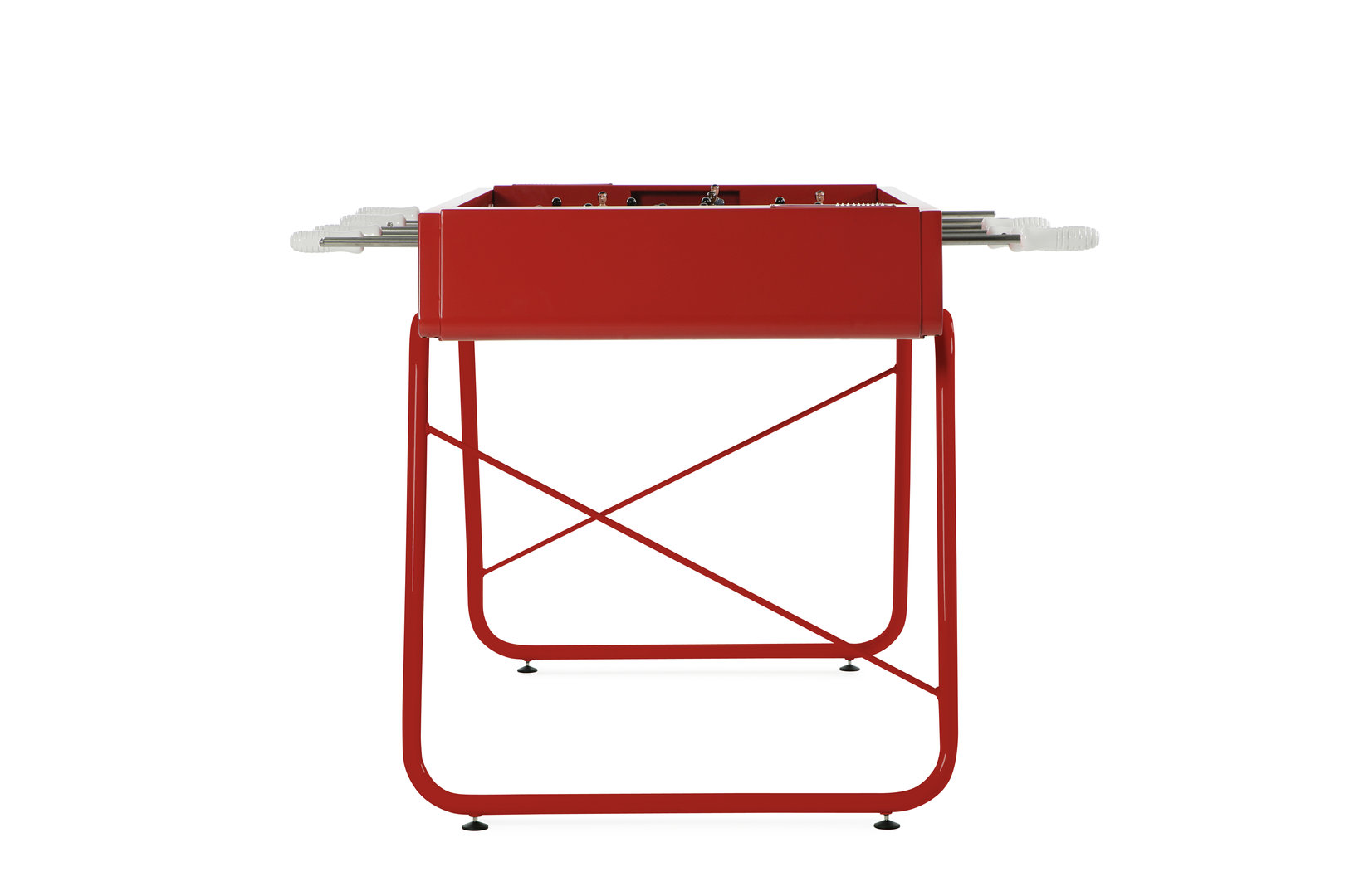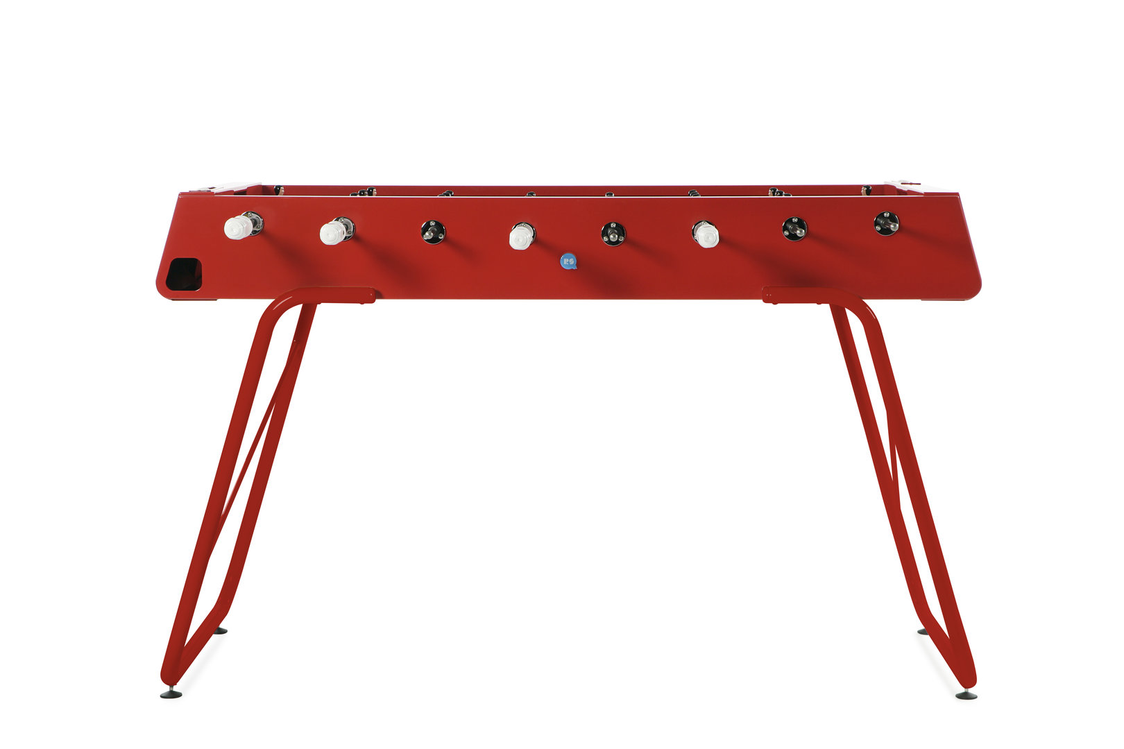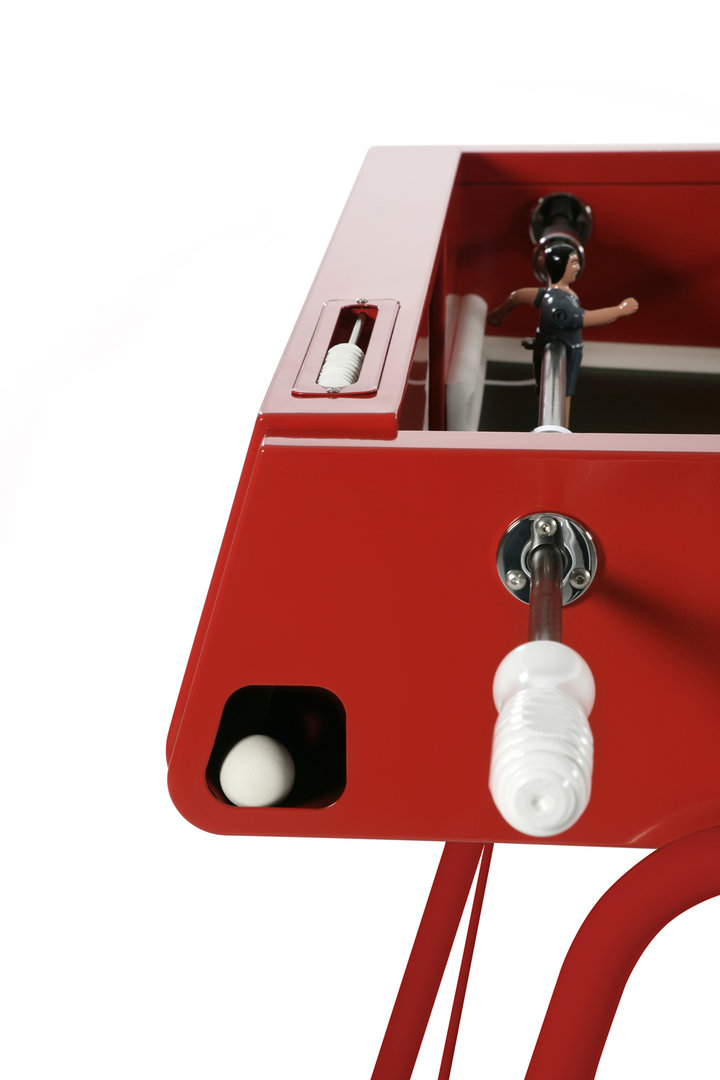 Der Tischkicker RS#3 ist, wie jedes andere Modell vom spanischen Hersteller RS Barcelona, ein optisches Highlight an jedem Aufstellort. Die elegante Linie des Tisches stammt aus der Feder des Designers Rafael Rodriguéz und ist schlicht aber dennoch modern gehalten. Bei der Herstellung des Tisches floß nicht nur Herzblut ins Design, sondern auch in die liebevolle Verarbeitung und die Verwendung hochwertiger Materialien. Der Werkstoff aus dem der Tisch gefertigt wurde ist Stahl, der durch eine kathodische Tauchlackierung wetterfest versiegelt wurde. Durch den aufwendigen Fertigungsprozess eignet sich der Tisch für sowohl Innen- und Außennutzung. Ein weiterer Benefit des massiven Stahlkorpus sind die Spieleigenschaften im Sinne der spanischen Interpretierung von Tischfußball. Die gebogene Spielfläche ist HPL beschichtet, zur Mitte hin durchgebogen und mit nahtlos hochgezogenen Spielfeldecken ausgestattet. Bei genauem Hinsehen fällt auf, wie viel Liebe zum Detail in diesem Kickertisch steckt. Die Spielfiguren aus Aluminiumguß sind handbemalt und lebensecht durch Arme und alternativ ein oder zwei Füße. Die hochwertigen Griffe aus Buchenholz sind feinsäuberlich verarbeitet und sorgen für ein sehr angenehmes Spielgefühl.
