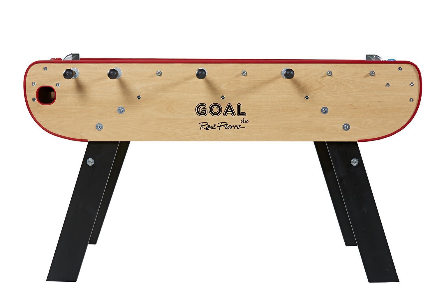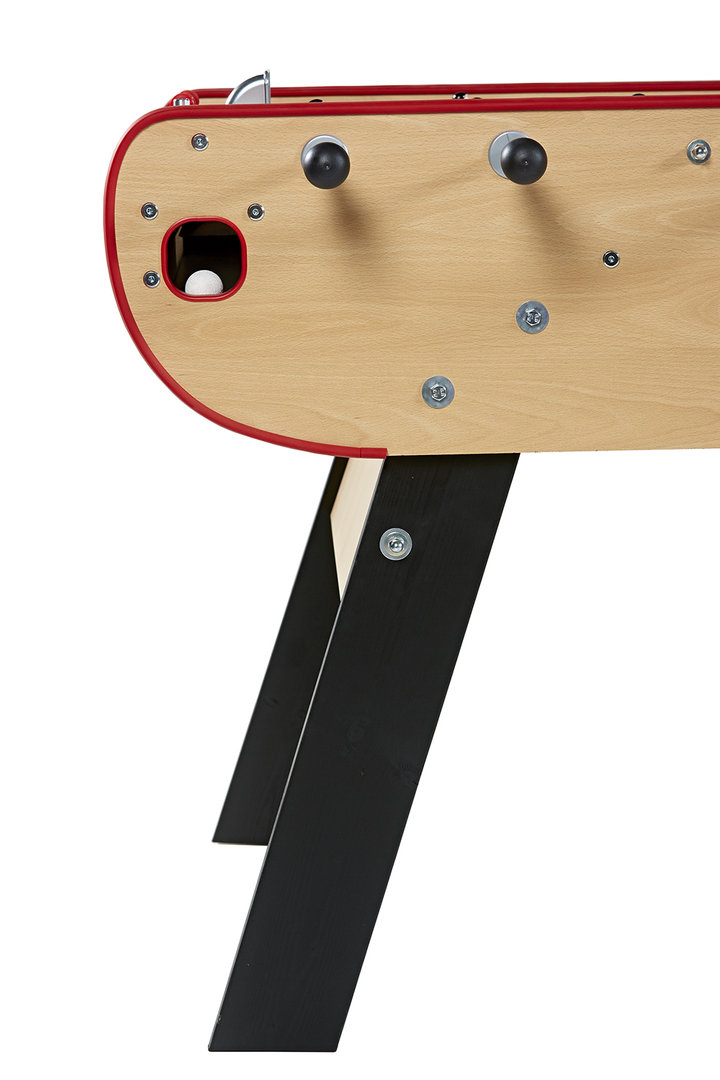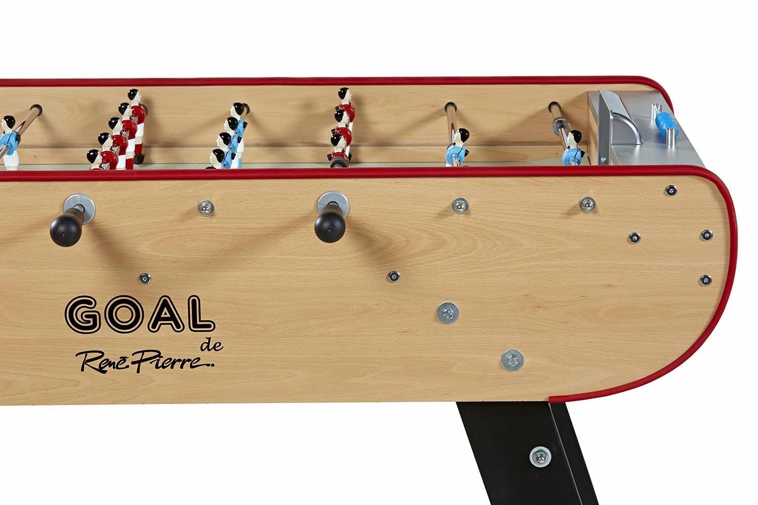 Der René Pierre Goal Kickertisch aus Holz besticht durch sein sehr gutes Preis-Leistungs-Verhältnis. Durch den grauen Anstrich auf der schlichten aber stabilen Holzkonstruktion sieht dieser Tischkicker auch noch toll aus. Teleskopstangen aus Metall, handbemalte Figuren sowie die Linoleumspielfläche ermöglichen ein schnelles und präzises Spielgeschehen. Die Ballrückgabe erfolgt seitlich neben den Toren.