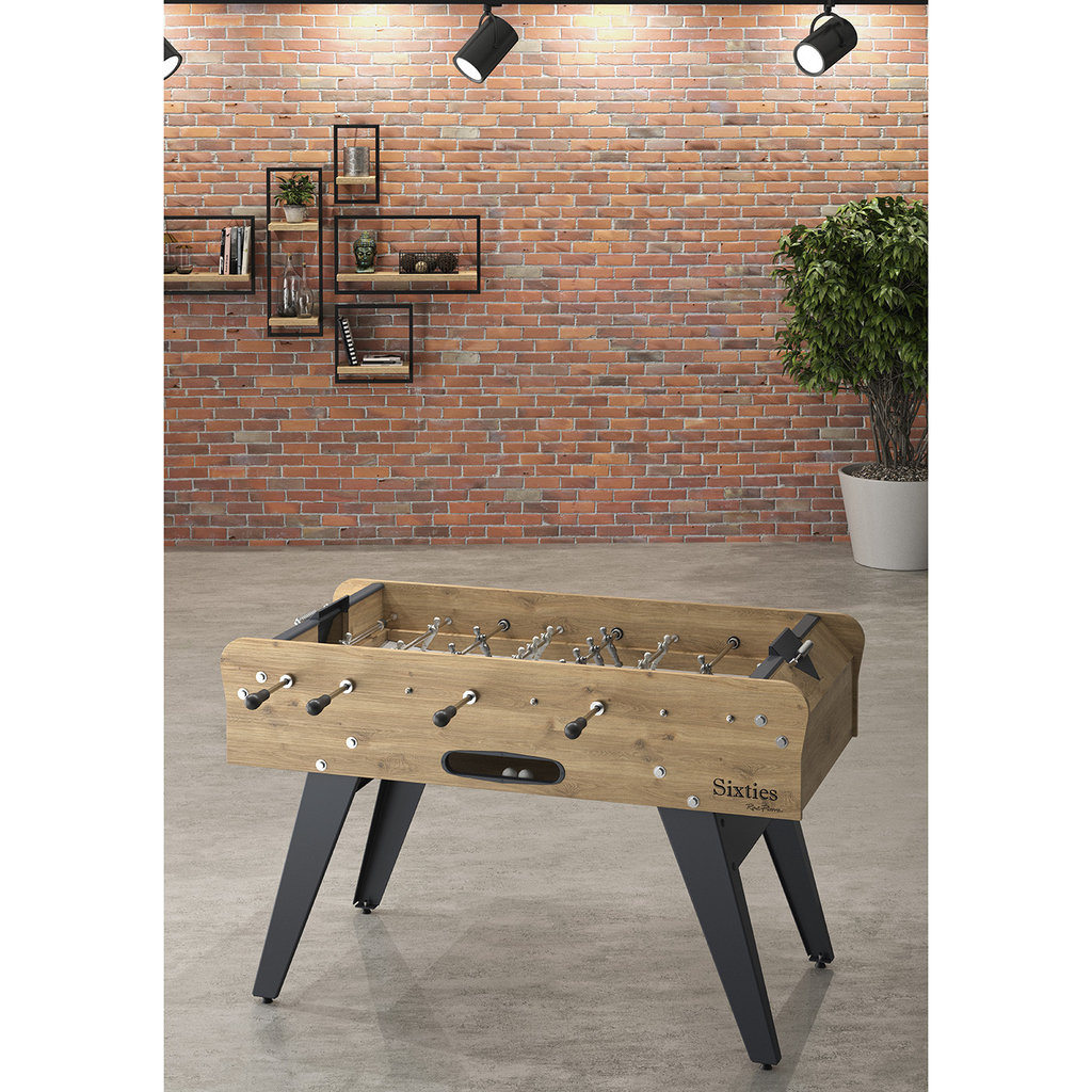 Einmal gepackt lässt einen der Tischfußball-Sport nicht mehr los. Nahezu jeder kann eine Kneipen-Geschichte am Kicker erzählen, wer wird da nicht nostalgisch und Blickt auf vergangene Tage. Mit dem René Pierre Sixties kommt ein Stück Erinnerung in die eigenen Vier Wände. Durch sein Retro-Design erinnert der Sixties an wilde Partien mit Freunden oder Fremden. Der Tisch ist ein optisches Highlight und erfüllt jedes Ambiente mit seinem speziellen Charme, so dass er auch jüngere Generationen auf der Suche nach einem eleganten Tisch in Eschenholz-Optik anspricht. Der klare Holzmaserung versprüht eine warme Atmosphere und fügt sich in jedes klassisch gehaltene Ambiente. Neben der Optik begeistert der Tischkicker durch typisch französische Spielverhältnisse. Handbemalte Metall-Figuren auf hochwertigen Teleskopstangen kombiniert mit dem grauen Linoleum-Spielfeld verfrachten einen gefühlt direkt in die Pariser Barszene. Der Tischkicker verfügt über eine zentrale Ballausgabe und manuellen Torzählern hinter den Toren, wodurch der Spieler stets den Überblick über das aktuelle geschehen behält. Damit die optimalen Spielverhältnisse und ein perfekter Balllauf überall vorzufinden sind, ist der Sixties mit höhenverstellbaren Füßen ausgestattet. Der René Pierre Tischkicker kann mit Kork- oder Kunststoffbällen bespielt werden, die durch die hochgezogenen Spielfeldecken stets in Bewegung bleiben und nur selten zur Ruhe kommen. Im Lieferumfang sind 5 passende Kickerbälle enthalten.