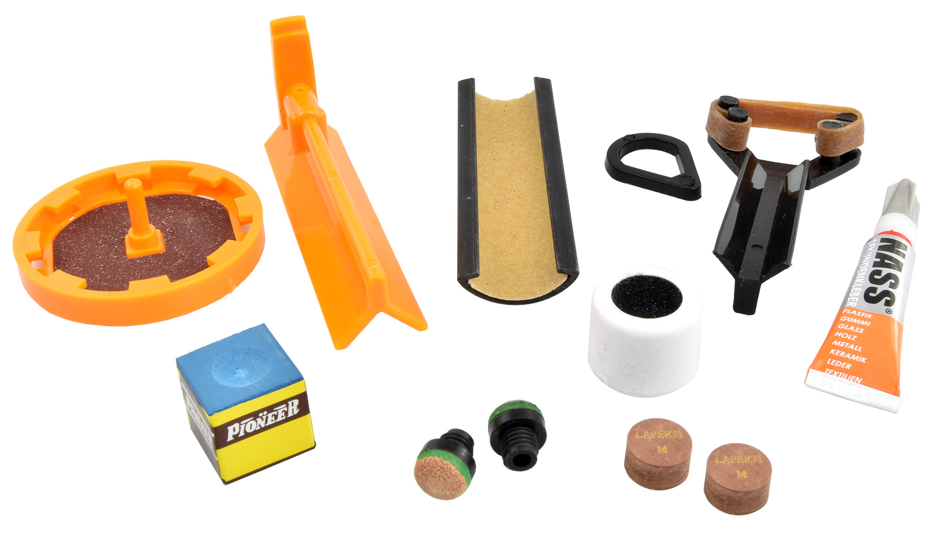 Praktisches Reparaturset zum Auswechseln der Queue Lederspitze. Bestehend aus Ferrulenschleifer, Gummi-Haltezwinge, Schleiflade, Spitzentrimmer, Sekundenkleber, 2 hochwertige Laperti Mehrschicht-Klebeleder 13mm Durchmesser, 2 Schraubleder 12mm sowie Billardkreide. Inklusive einer ausführlichen Anleitung für das Auswechseln eines Klebeleders. Perfektes Set für jeden Billardspieler.