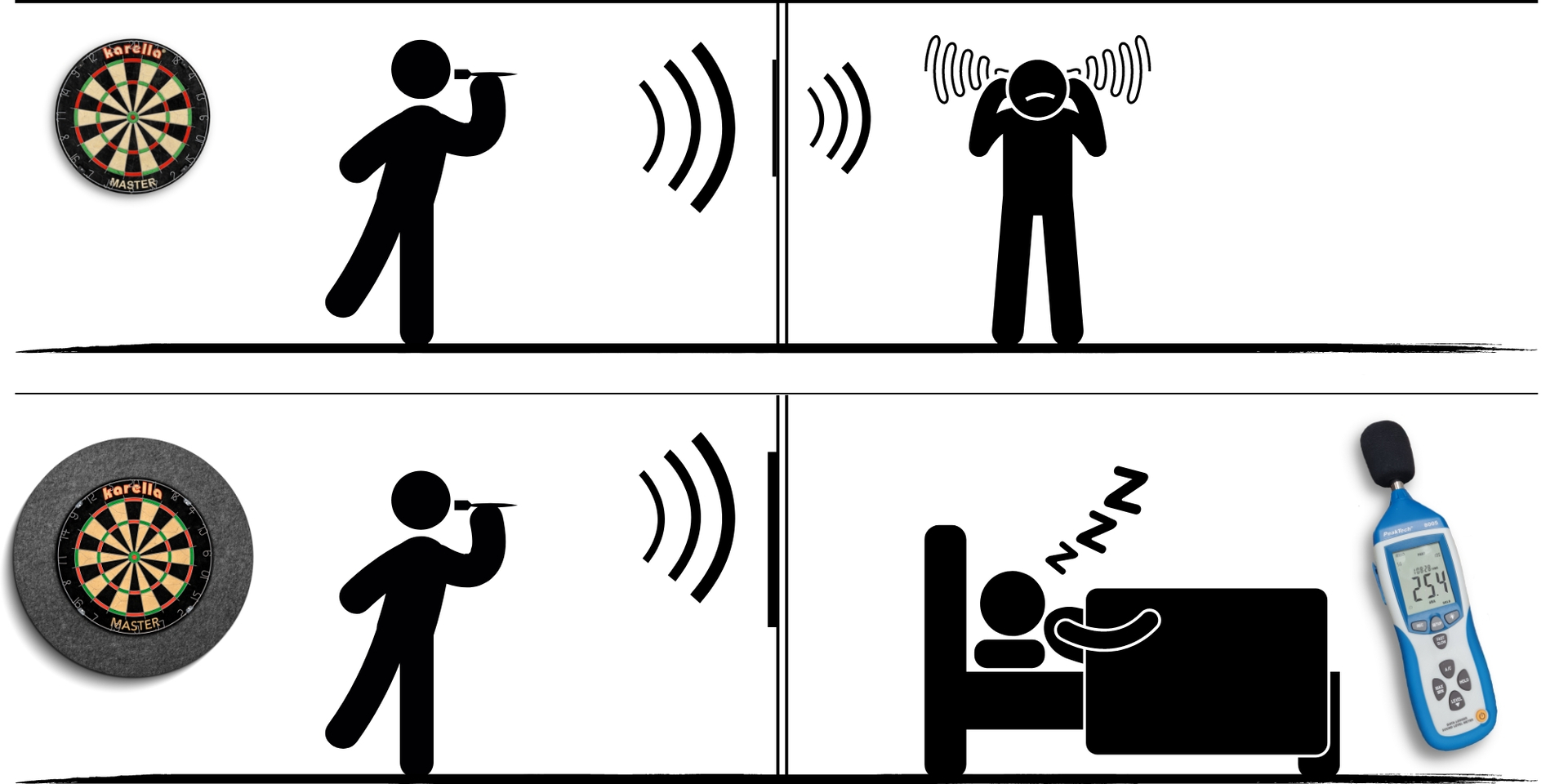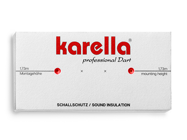 Der 2-teilige Karella Schallschutz besteht aus einem Schallschutzkern, auf dem das Steeldartboard befestigt wird, und einem umgebenen Schallschutzring. Beide Teile werden aus Millionen, hoch spezialisierten Schallschutzfasern hergestellt. Durch das Zusammenspiel vom Schallschutzkern und dem umgebenen Schallschutzring gelingt eine nahezu vollständige Geräusch Entkopplung. Beim Auftreffen des Dartpfeiles wird das dumpfe Klopfgeräusch über die Dartboard Rückseite auf die gesamte Faserplatte übertragen. Bei professionellen Messungen konnte eine Geräuschreduzierung von über 80% im Dart-Raum sowie auch angrenzenden Räumen nachgewiesen werden. Die gemessenen Werte lagen unter 30dB und damit bleibt die gesetzliche Nachtruhe zu 100% unberührt.