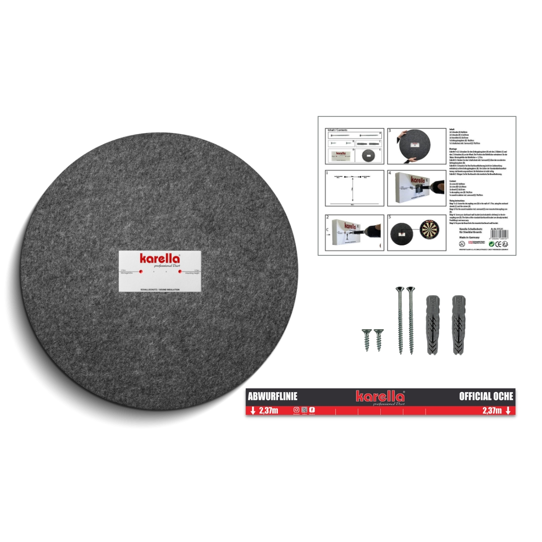 Lieferumfang: Schallschutzkeren, Schallschutzring, Karella Abwurflinie, Dübel und Schrauben. (Dartboard ist nicht im Lieferumfang enthalten)